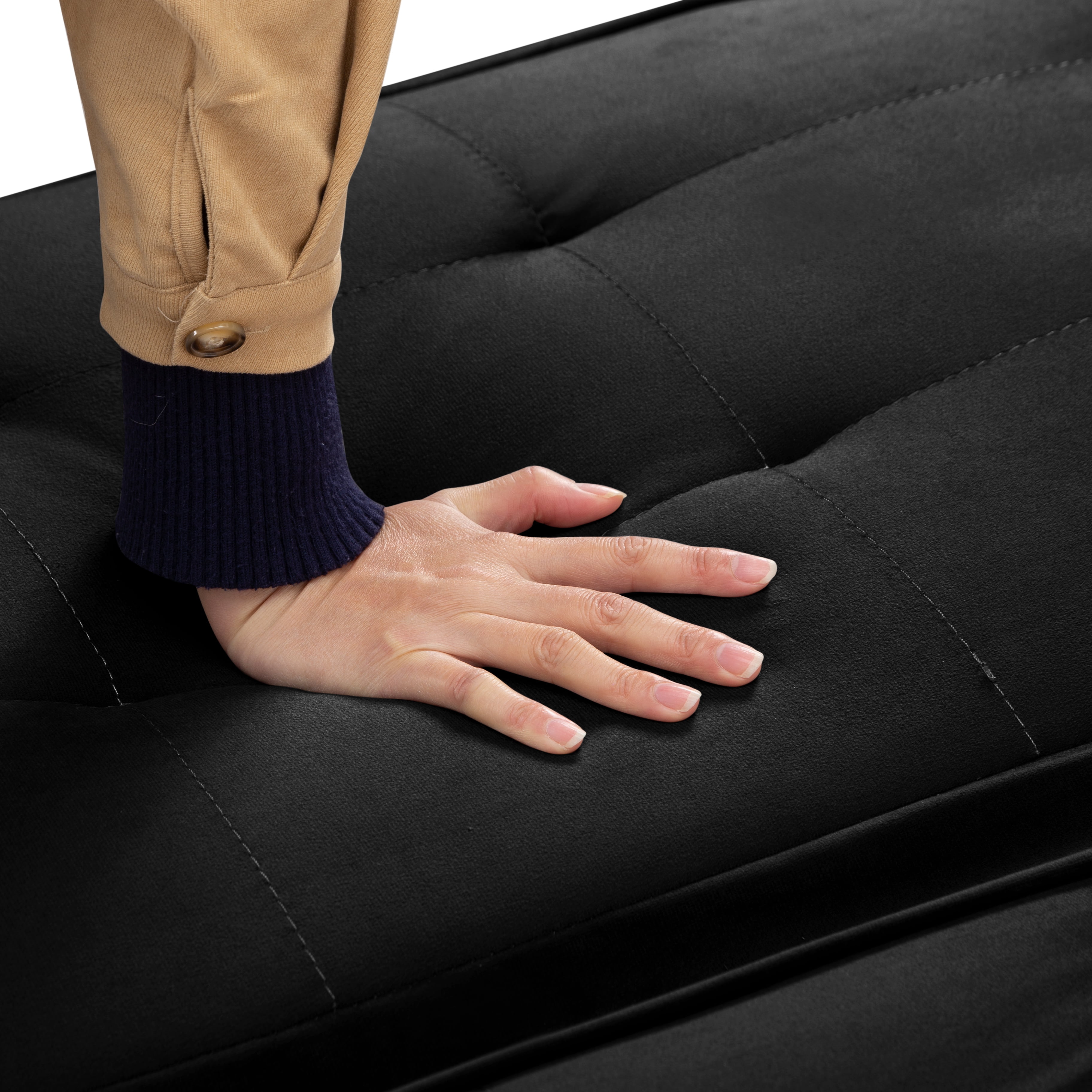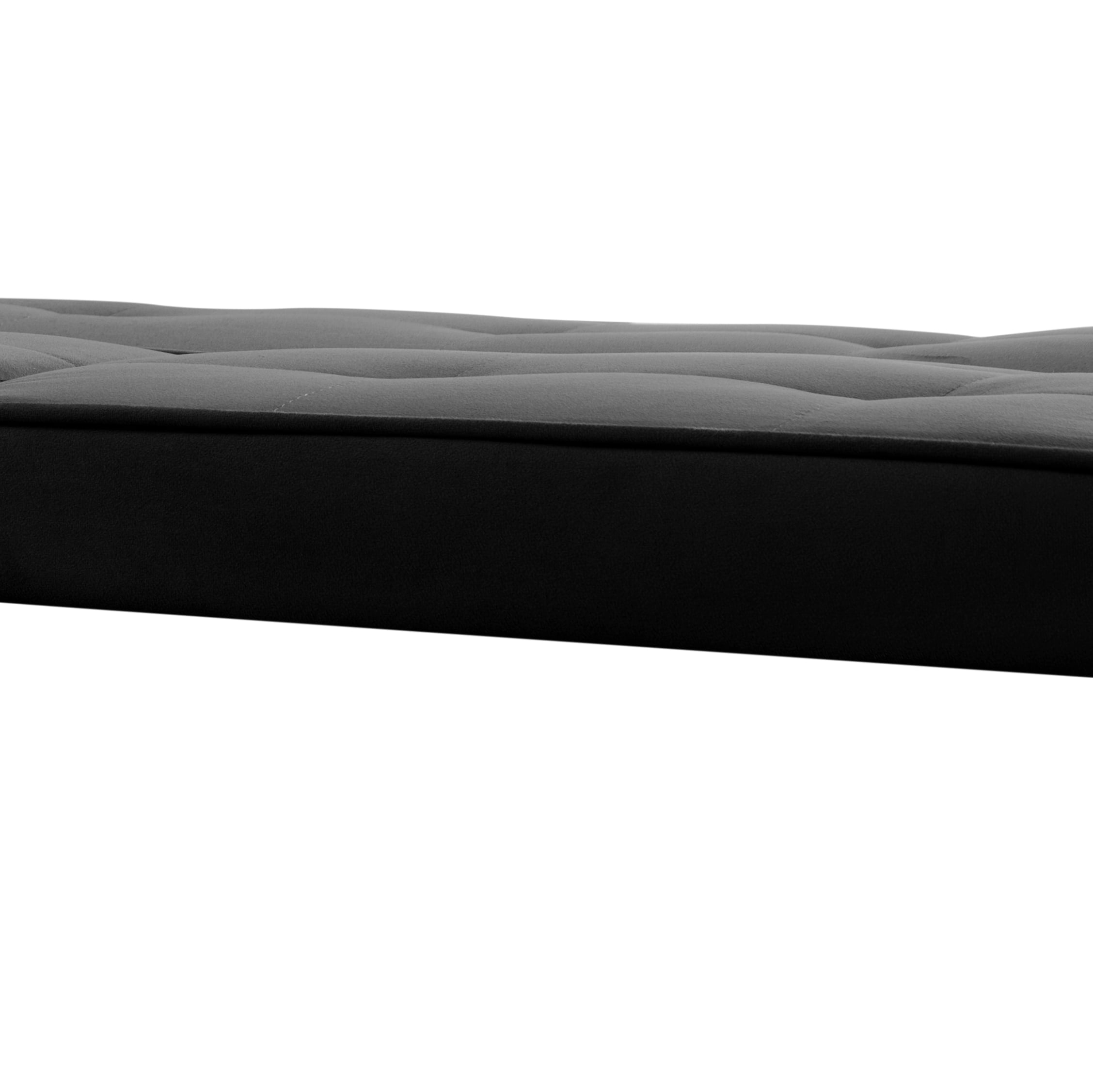 – 65” Futon sleeper sofa bed, a drop down middle back with 2 cup holders; – Convert to a fully functioning futon sleeper, it is an excellent option for your home, office, and guest room; – Founded on a solid and manufactured wood frame with metal mechanisms, clean-lined silhouette with an angled backrest, tight square arms, and metal chrome legs, enveloped in tailored linen upholstery; – The backrest has 3 angles for adjusting,for sitting, lounging and sleeping to meet your different needs. Perfect for unexpected overnight guests, or just a handy spot for a nap. – Two removable arm cushions can be used as lumbar pillows. Product Type:Sleeper Sofa Sleeper Size:Twin Overall – sofa:65” x 27.5” x 28.7”H Open size- sleeper:65” x 35.2” x 17.7”H Back Cushion:15.7”H Seat Height:13.8” Arm Height:17.7” Product Weight:44.0 LBS Gross Weight:48.5 LBS Carton size:66.14x 18.11 x 7.87” Upholstery Colour: Black, Grey, Navy Blue Upholstery Material:Velvet: Black, Grey, Polyester: Navy Blue Leg Material:Plastic Leg Color:Black Seat Fill Material:Foam Back Fill Material:Foam Frame Material:Solid + Manufactured Wood Seat Construction:Solid wood + Sinuous Spring Arm Type:Pillow Arm Seat Style:Tight Seat Back Type:Tufted back Back & Seat:Not Removable Joinery:Corner-block-reinforced Main Wood Joinery Method:Basic Butt Kiln-Dried Wood:Yes Weight Capacity:300 LBS each seat Product Care:Wipe clean with dry cloth, do not use strong liquid cleaners Assembly Required:Yes Level of Assembly:Partial Assembly Assembly Time:20 Minutes Adult Assembly Required:Yes Suggested Number of People:2 Additional Tools Required:All tools included *** Please review the product dimension and check if it’s suitable for your living room *** It might be have color difference due to photograph lighting, or computer monitor displayed. It’s not quality issue.