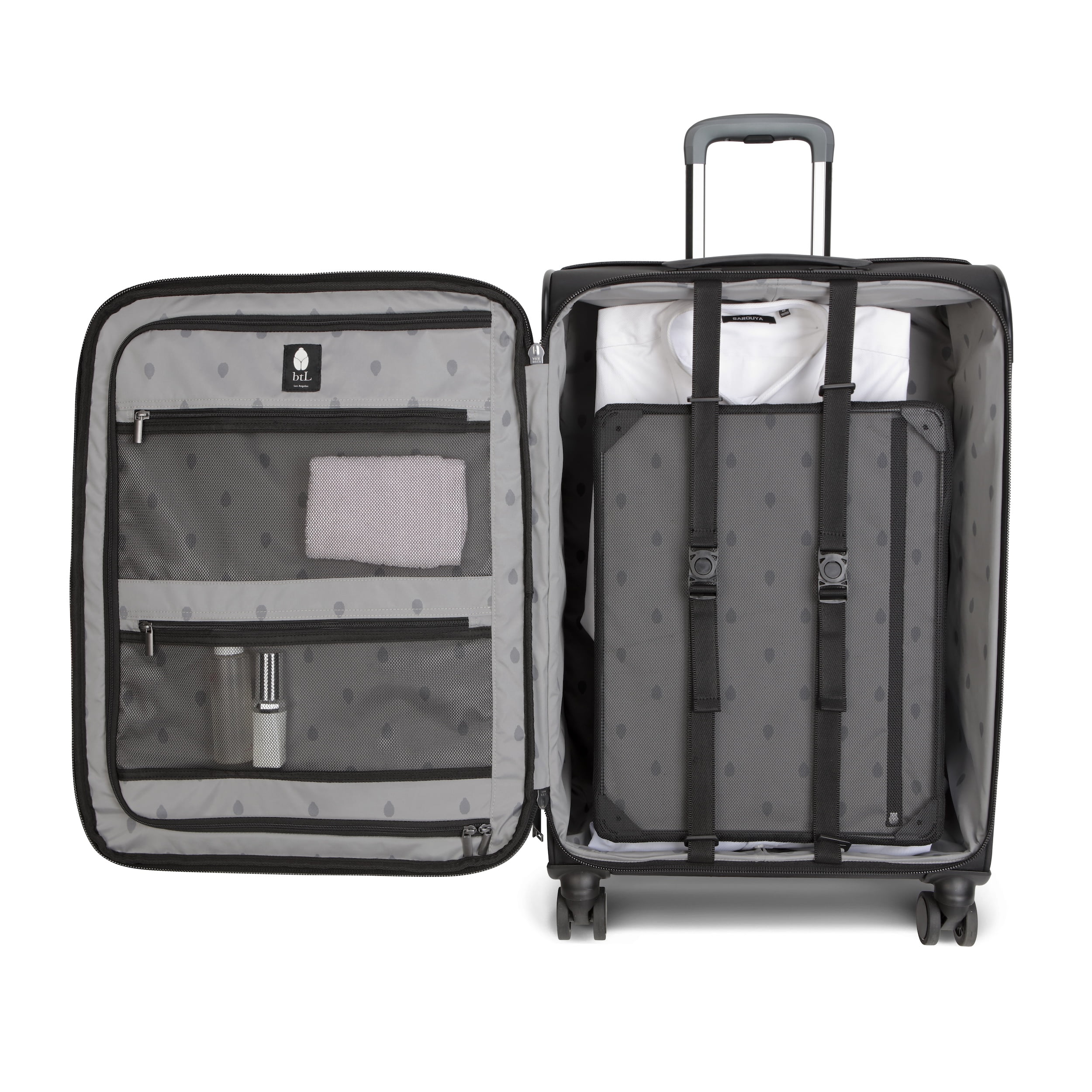 btL 20-inch Softside Expandable Carry-on Upright Luggage Made of Recyclable Softside Nylon 8 wheel 360-degree Hinomoto Silent Run spinners for ease of moving Polyester interior liner with coordinating btL logo YKK Zippers and Metal Hardware Ideal for 1-3 day adventure 2-inch zip around expansion for added room Dimensions: 20″H x 14″W x 7.5″D+2″EXP Comes in 3 sizes: 20″ Carry-on, 24″ Checked and 28″ Checked Available in 2 neutral finishes: Black and Blue Shadow Multi-level locking telescopic handle system