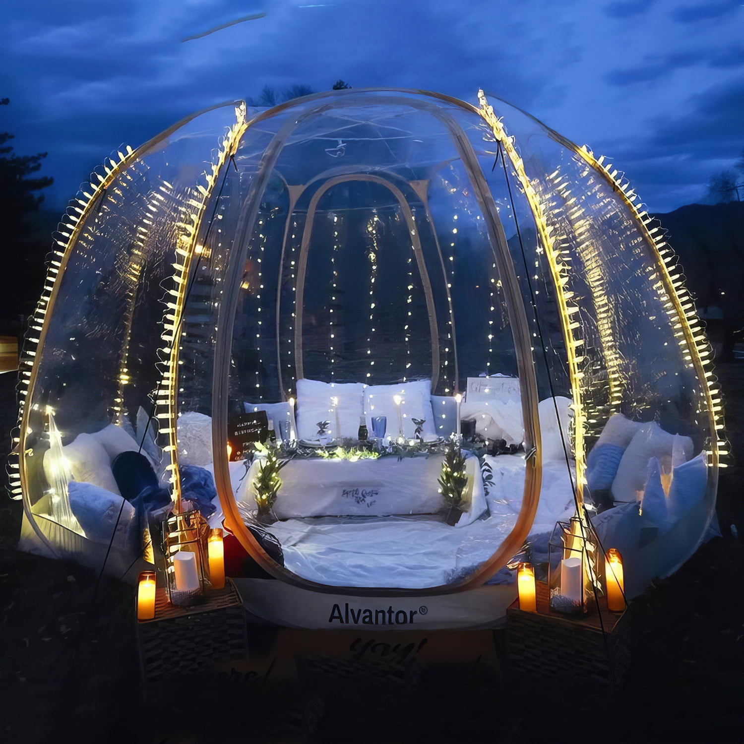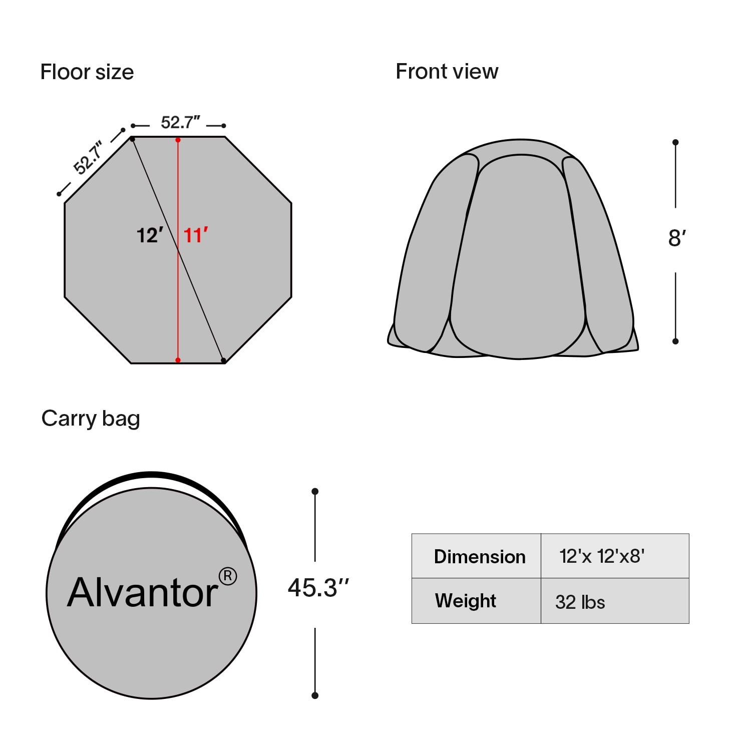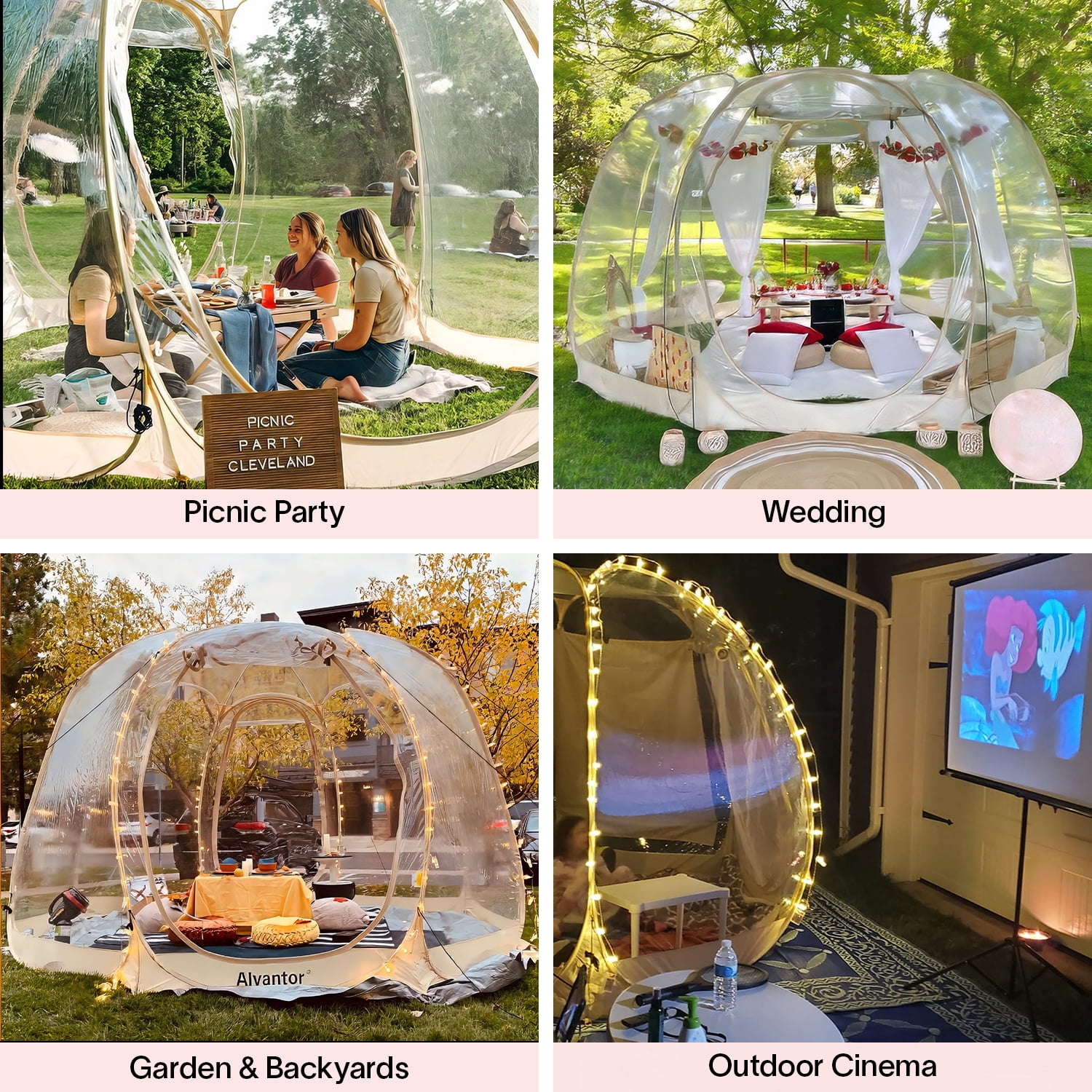 YOUR OWN PERSONAL BUBBLE: An automatic pop-up, no assembly needed igloo tent perfect for setting boundaries between you and others out in public or in the privacy of your own space. This clear bubble tent is simply pop-up and secure, enjoy the personal space to the fullest. POP-UP BUBBLE TENT THAT FOLDS DOWN: Innovative fiberglass ribs of this winter tent pop up in seconds with little assembly required thereafter. Choose to secure down this patio gazebo to the ground with sandbags or guylines, and enjoy in your backyard, garden, or hosting small parties and events. Once you’re finished, fold the igloo tent down and store in the carry case. PATENT PENDING PROTECTED ALVANTOR DESIGN: This winter screen house measures at (Width: 12’, Depth: 12’, Height: 8’) and comes with a compact carry bag. Weighing just 32 lbs, this pop up igloo tent has a innovative folding technique making it easy to fold down and store back in the carry bag. Ready to go in minutes with this outdoor igloo tent dome! SPACIOUS AND WARM: Alvantor big bubble gazebo provides a spacious interior shelter that comfortably fits between eight and ten adults. This gazebo tent has enough room to place various pieces of furniture so you can give your bubble tent a homely feeling. The eight, transparent PVC windows provide 360° view of your surroundings, whilst the inside of your bubble tent stays warm thanks to the excellent heat retention. PACKED FULL OF ADDITIONAL FEATURES: Two windows on the top provide ventilation to let your pop up bubble breath, along with waterproof covers to protect against the rain or snow. This patio tent features internal hooks to hang coats or bags, and additional support features to increase stability during windy weather. This werather proof pod has two large entrance doors with double side silicone zippers, allow easy access from inside and out. 1 Year 100% SATISFACTION GUARANTEE: Alvantor is a U.S. based company which is located in Los Angeles, CA. Trademark is registered, if you have any question about Alvantor Tent, please contact us 626-542-3420.
