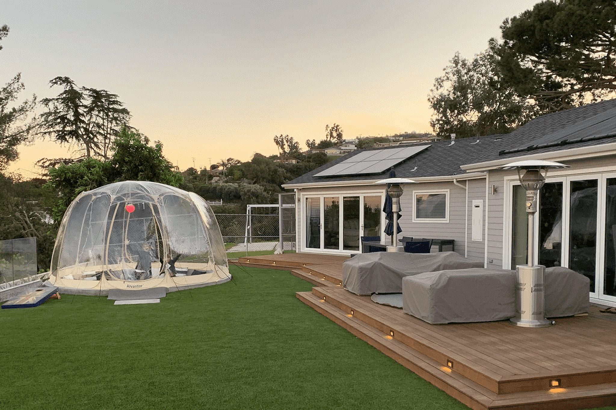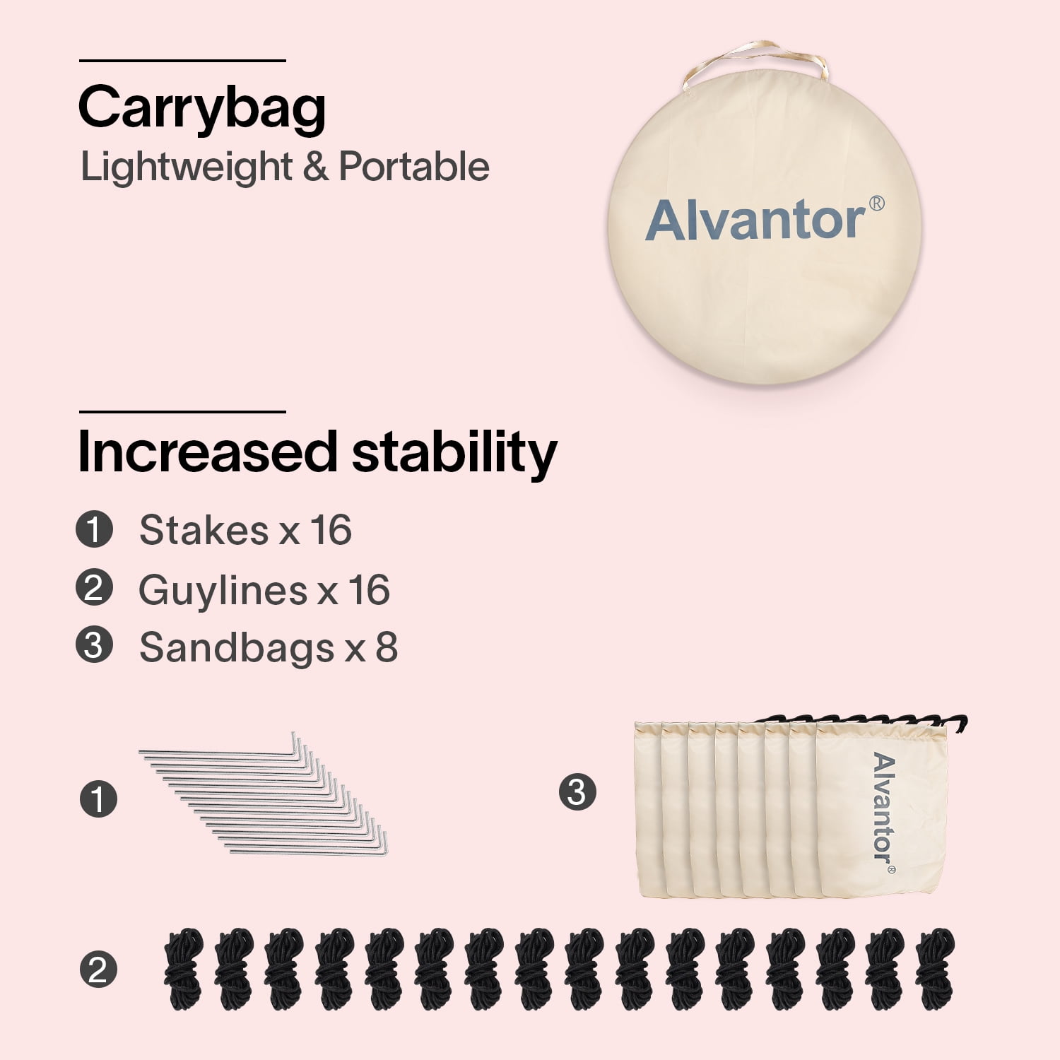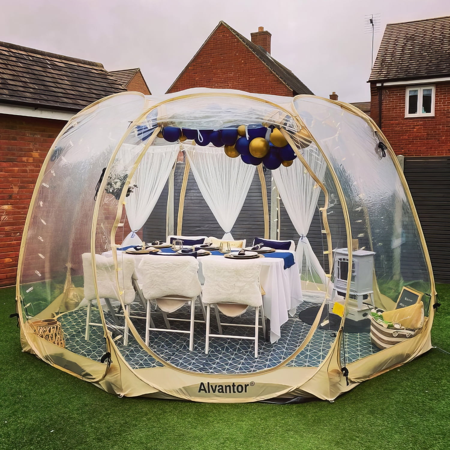YOUR OWN PERSONAL BUBBLE: An automatic pop-up, no assembly needed igloo tent perfect for setting boundaries between you and others out in public or in the privacy of your own space. This clear bubble tent is simply pop-up and secure, enjoy the personal space to the fullest. POP-UP BUBBLE TENT THAT FOLDS DOWN: Innovative fiberglass ribs of this winter tent pop up in seconds with little assembly required thereafter. Choose to secure down this patio gazebo to the ground with sandbags or guylines, and enjoy in your backyard, garden, or hosting small parties and events. Once you’re finished, fold the igloo tent down and store in the carry case. PATENT PENDING PROTECTED ALVANTOR DESIGN: This winter screen house measures at (Width: 12’, Depth: 12’, Height: 8’) and comes with a compact carry bag. Weighing just 32 lbs, this pop up igloo tent has a innovative folding technique making it easy to fold down and store back in the carry bag. Ready to go in minutes with this outdoor igloo tent dome! SPACIOUS AND WARM: Alvantor big bubble gazebo provides a spacious interior shelter that comfortably fits between eight and ten adults. This gazebo tent has enough room to place various pieces of furniture so you can give your bubble tent a homely feeling. The eight, transparent PVC windows provide 360° view of your surroundings, whilst the inside of your bubble tent stays warm thanks to the excellent heat retention. PACKED FULL OF ADDITIONAL FEATURES: Two windows on the top provide ventilation to let your pop up bubble breath, along with waterproof covers to protect against the rain or snow. This patio tent features internal hooks to hang coats or bags, and additional support features to increase stability during windy weather. This werather proof pod has two large entrance doors with double side silicone zippers, allow easy access from inside and out. 1 Year 100% SATISFACTION GUARANTEE: Alvantor is a U.S. based company which is located in Los Angeles, CA. Trademark is registered, if you have any question about Alvantor Tent, please contact us 626-542-3420.