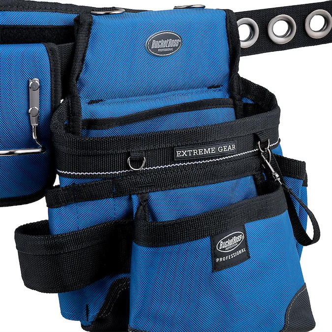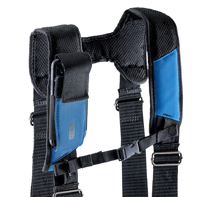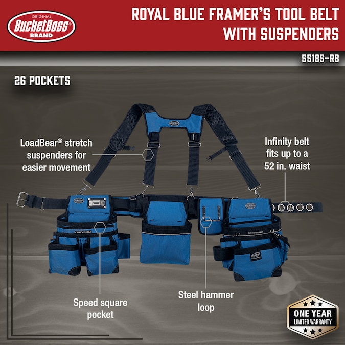 Not all tool belts are created equal. The 55185 Series rigs are made from an industry leading 2-ply, 1680 denier heavyweight poly fabric for lasting durability. LoadBear® stretch suspension technology allows the weight of the tool belt to move comfortably with your body while at work. Suspenders have moisture-wicking padding and feature a chest retaining strap as well as a stretching cell phone pocket that will fit any smart phone south of a tablet. Dedicated speed square pocket where it should be, along with 3 backwall tool slots where they should be. Pouches and suspenders can be removed or adjusted to your own liking. Barrel-bottom pouches allow for extra carrying capacity, reinforced with double layers at corner stress points of course. Additional features include one steel hammer holder in back, and an additional web loop for hammers on the pouch, cats-paw sleeves and a tape measure clip. Infinity belt can be adjusted up to a 52 in. waist by adjusting the metal slider and the heavy-duty steel grommets.