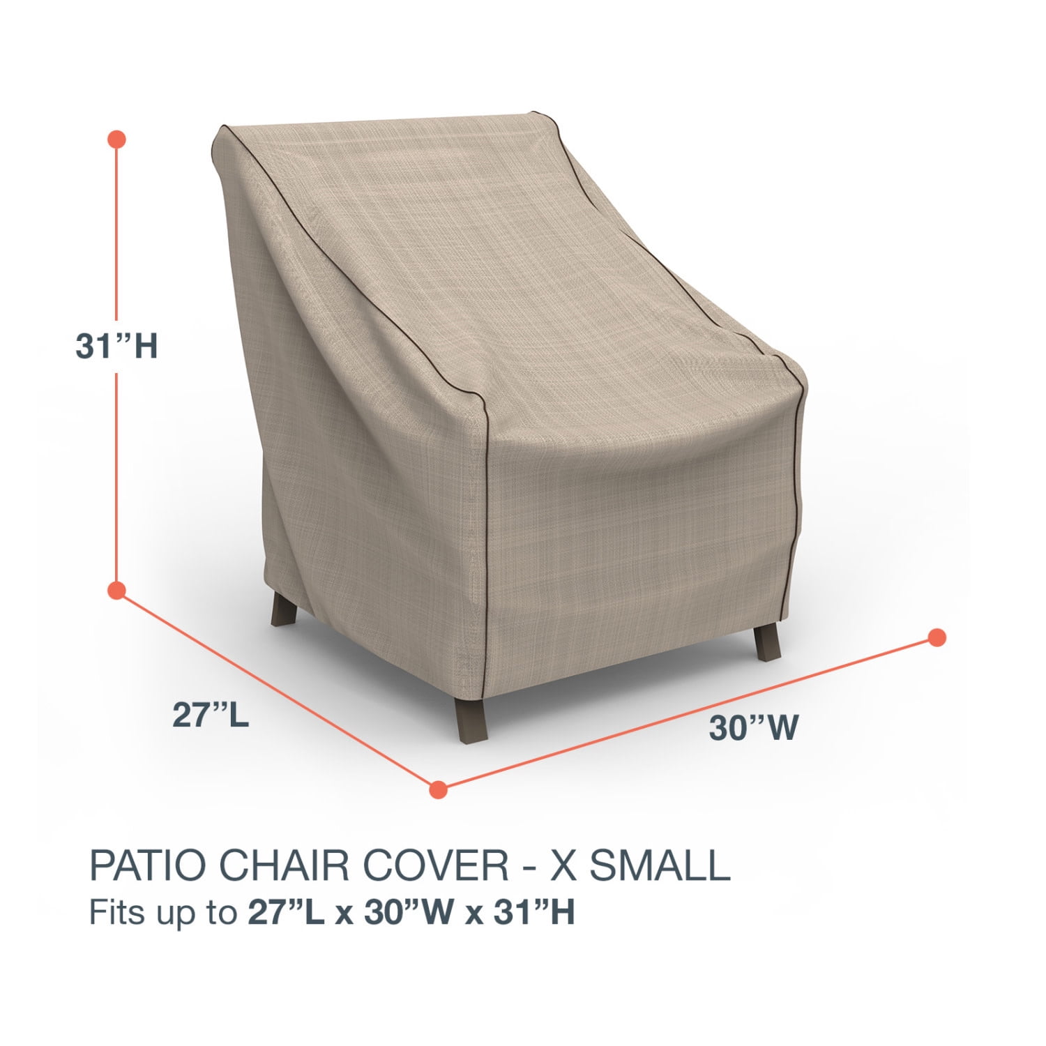 Comes as a 2-pack of chair covers Black and Ivory 600 denier polyester treated with StormBlock™ makes covers waterproof Ultrasonically welded seams and contoured to fit your patio furniture Stain and UV resistant to protect patio furniture year-round Built-in air vents prevent mold and mildew Sewn-in straps and elastic hems provide added security in windy conditions This Budge cover measures: 27″ L x 30″ W x 31″ H