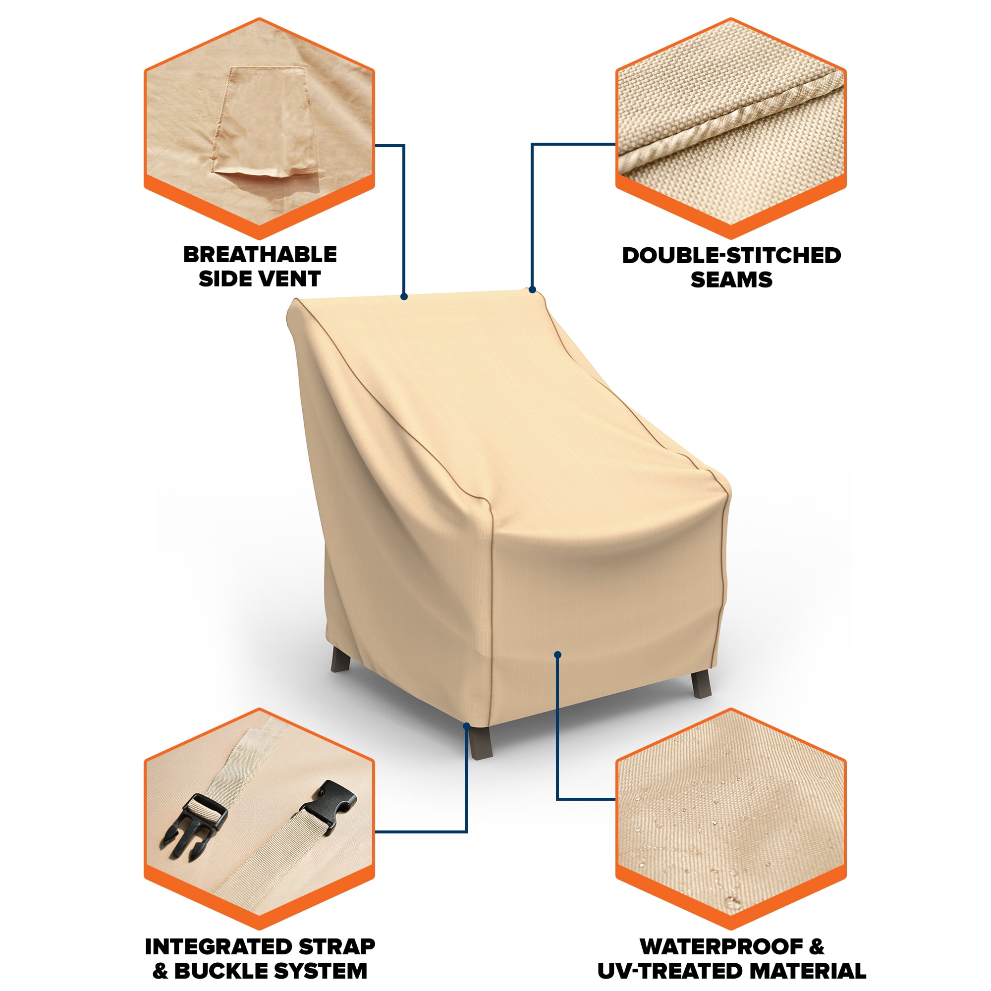 This cover is made from a lightweight, high-tech 300 denier Polyester. This cover is also fully breathable, so you won’t have to worry about mold or mildew from growing underneath the cover and spreading to your furniture. Budge Sedona patio furniture covers are 100% waterproof and UV resistant, keeping your outdoor patio chair dry and safe all year long This cover is beige in color Features ultrasonically welded seams This medium outdoor chair cover will protect a medium sized chair up to 36″ high x 36″ wide x 36″ deep. Comes in a 2 pack of chair covers