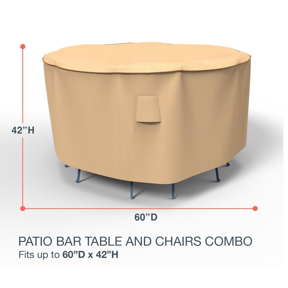 This cover is made from a lightweight, high-tech 300 denier Polyester. This cover is also fully breathable, so you won’t have to worry about mold or mildew from growing underneath the cover and spreading to your furniture. Budge Sedona patio furniture covers are 100% waterproof and UV resistant, keeping your outdoor patio chair dry and safe all year long This cover is beige in color Features ultrasonically welded seams This bar table and chairs cover will protect an round bar table and chairs up to 60″ diameter x 42″ drop.
