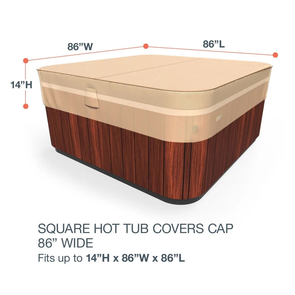 This cover is made from a lightweight, high-tech 300 denier Polyester. This cover is also fully breathable, so you won’t have to worry about mold or mildew from growing underneath the cover and spreading to your furniture. Budge Sedona patio furniture covers are 100% waterproof and UV resistant, keeping your outdoor patio chair dry and safe all year long This cover is beige in color Features ultrasonically welded seams This hot tub cover will protect a square hot tub up to 14″ high x 86″ wide x 86″ long.