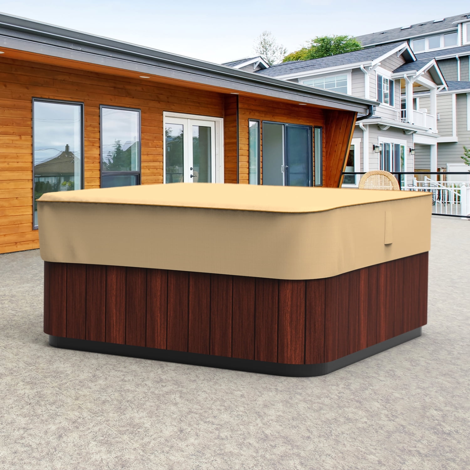 Our Square Hot Tub Cover, Medium provides protection for your outdoor patio furniture. Styled to complement your patio decor, this collection by Budge Industries comes in an attractive sandy-tan beige color and has contoured shapes that cover your patio furniture. The StormBlock™ Savanna collection combines the durability of our machine-woven 600 denier polyester with StormBlock™ technology and UV protection. With this technology, water rolls right off this cover, taking mud, tree-sap, dirt and bird droppings with it. Convenient zipper opening allows you easy access to your firewood. Sewn-in straps to help secure the cover to your furniture in windy conditions and custom air vents help to ensure adequate air flow to prevent condensation to reduce mold, mildew and rust. With our StormBlock™ Savanna Collection you’ll never have to sacrifice style for protection. This collection will complement nearly any patio decor, while extending the life of your outdoor furniture. Includes a 7-year warranty. This cover measures: 86″ L x 86″ W x 14″ H.