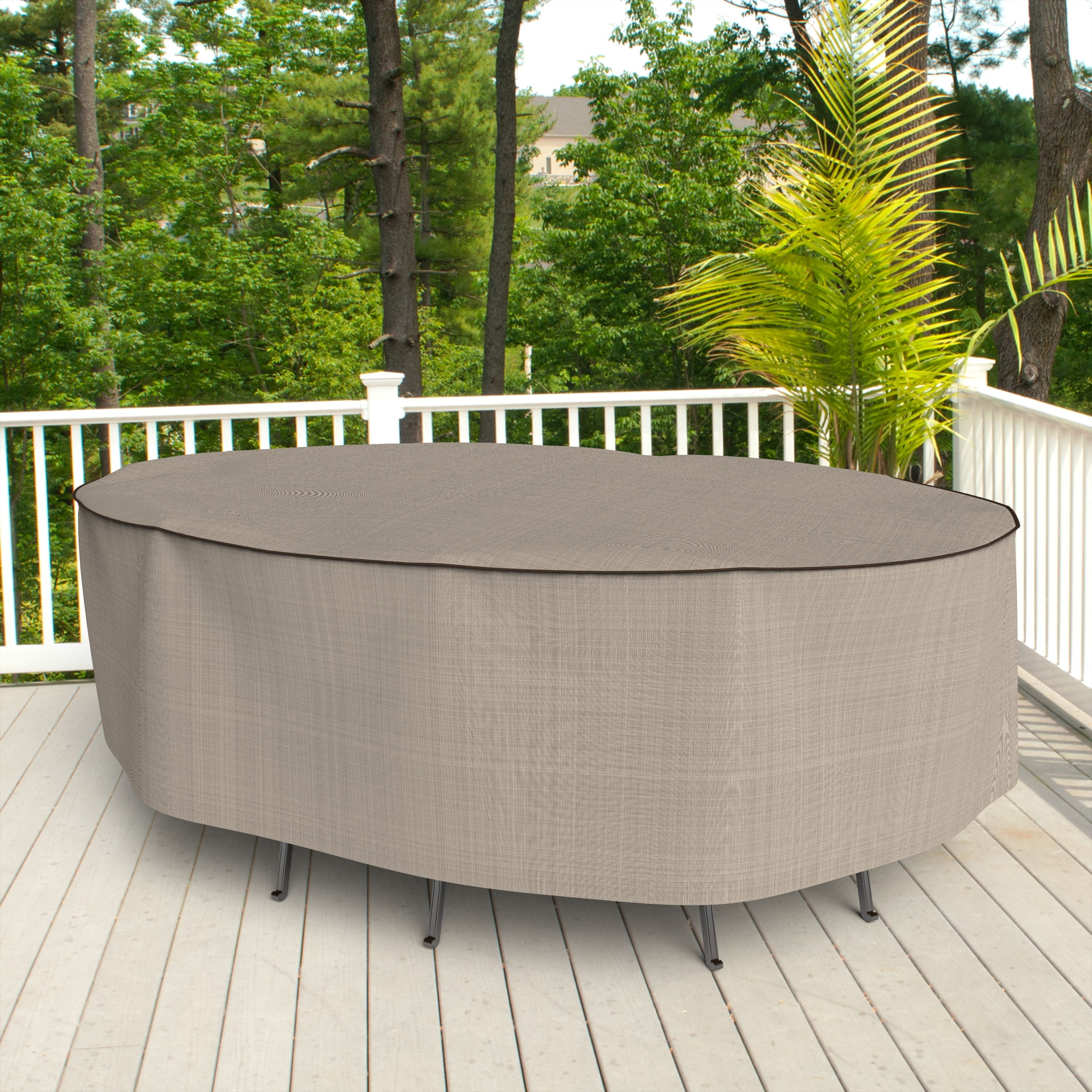 This oval table and chairs combo cover measures 30″ High x 88″ Long x 60″ Wide This waterproof table and chair set cover is made from brown and beige, heavy duty 600 denier Polyester This heavy duty oval outdoor patio table and chair cover provides long-lasting all weather protection to your patio dining set This outdoor patio furniture cover is 100% waterproof and UV Resistant Features ultrasonically welded seams Budge cover is fully breathable to prevent build-up of condensation