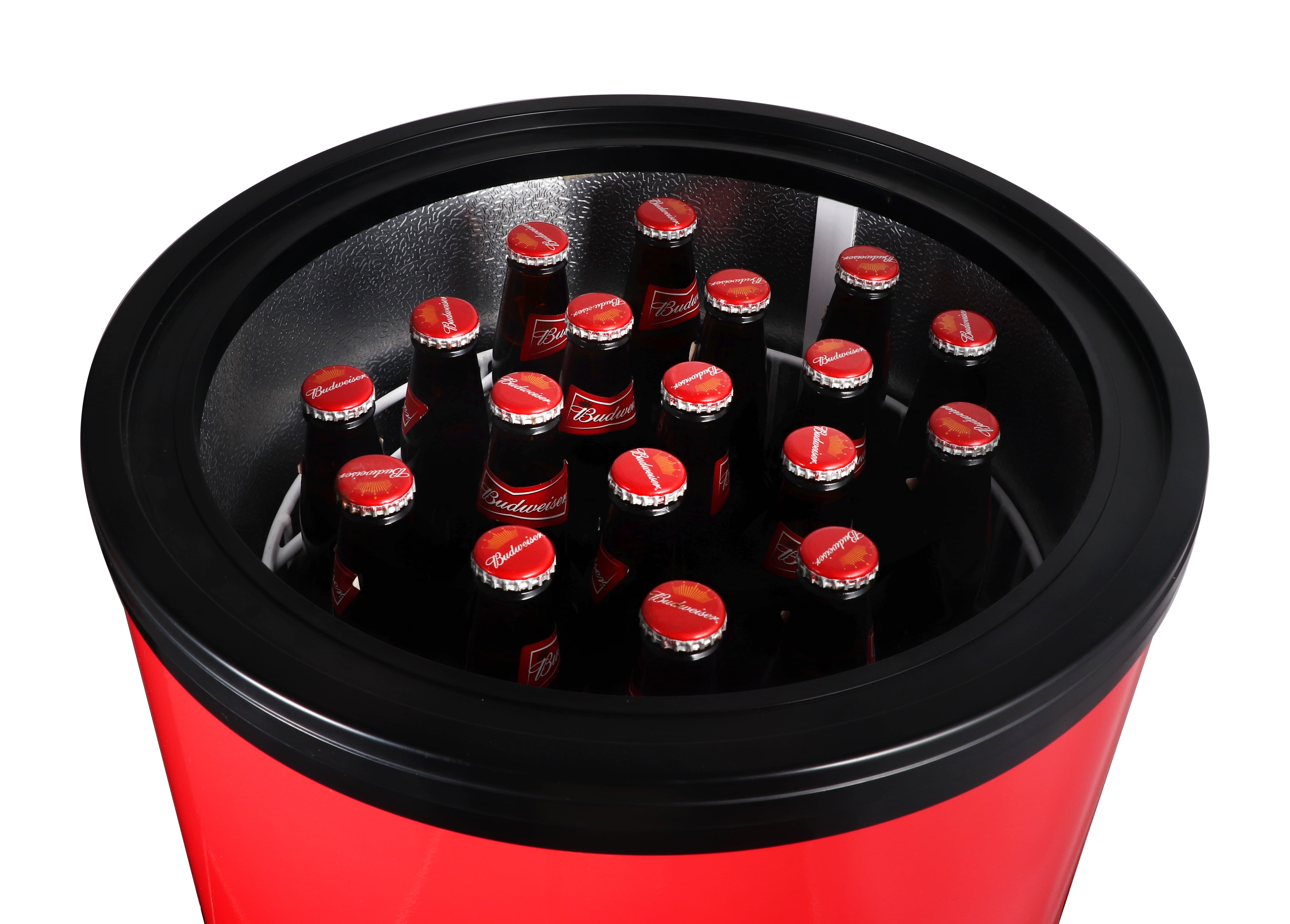 Budweiser graphics with the official Budweiser logo and eye-catching color scheme A large 50 L capacity of 55 cans or 22 bottles lets you keep plenty of snacks and drinks cool A high-quality compressor cools the unit down to a temperature range of 32℉~61℉ (0℃~16℃) A transparent lid allows quick access to the contents and ensures minimal heat enters when opening and closing Caster wheels with locks – to easily move the cooler around Two wire baskets for efficient and organized stacking The unit works both indoors and outdoors for flexibility