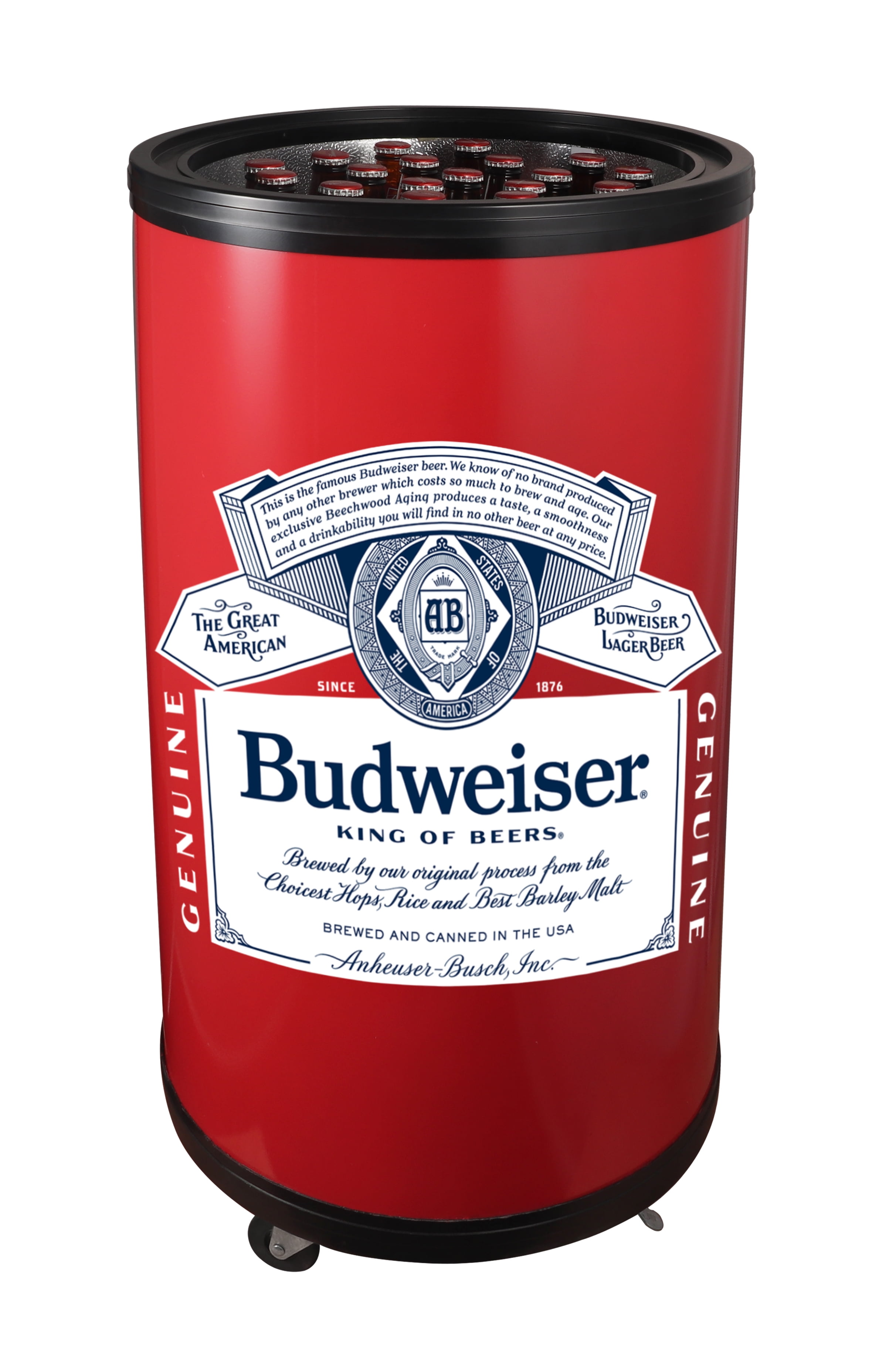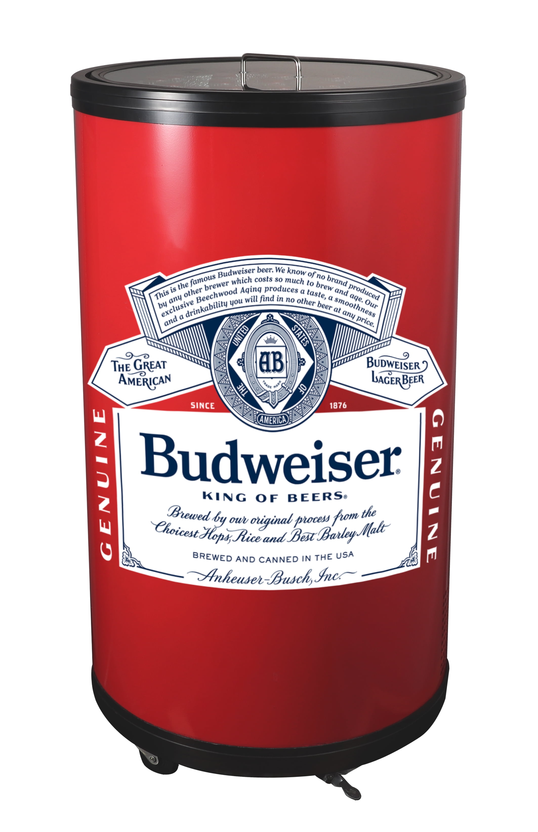 This Budweiser party cooler features the iconic Budweiser graphics with official Budweiser logo and eye‐catching color scheme. Perfect for collectors and beer enthusiasts. This stylish Budweiser party cooler does not only look chill but it also cools bottles and cans, efficiently and quietly for any occasion. You can even keep barbecue foods fresh for the grill! Highly durable construction with foam insulation serves the dual purpose of providing superior ice retention and structural support. Features a crystal clear lid lift off lid which allows complete access to all your ice cold beverages inside. Its large 50 L capacity is supplemented by two handy wire baskets for easier access to drinks and food. The compact nature of the bar fridge also requires very little storage space. Comes standard with 4 caster wheels so you can easily move the cooler around inside or outdoors. Introduced nationally in 1876, Budweiser is one of the many products sold by Anheuser-Busch and proudly brewed in 63 breweries across the globe.