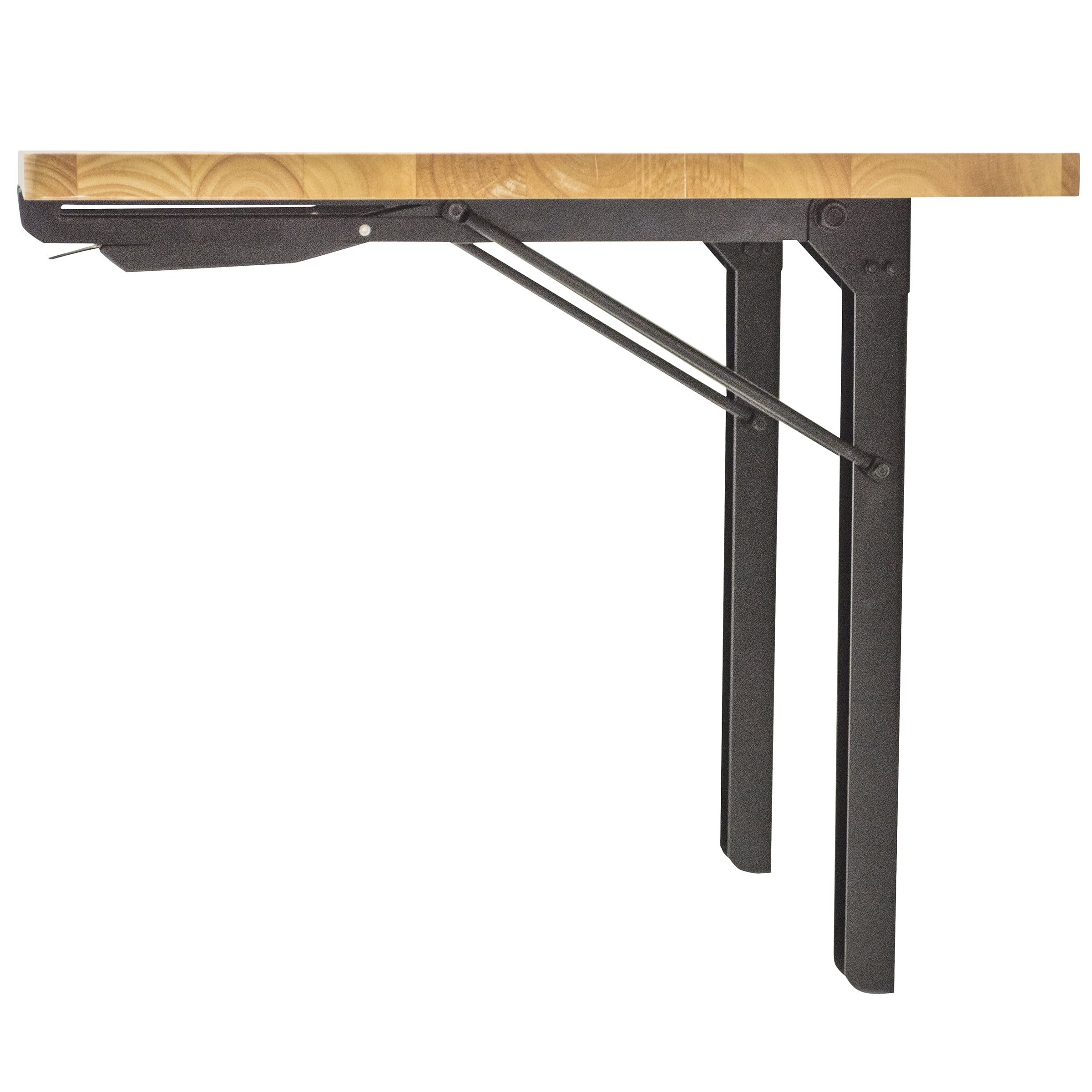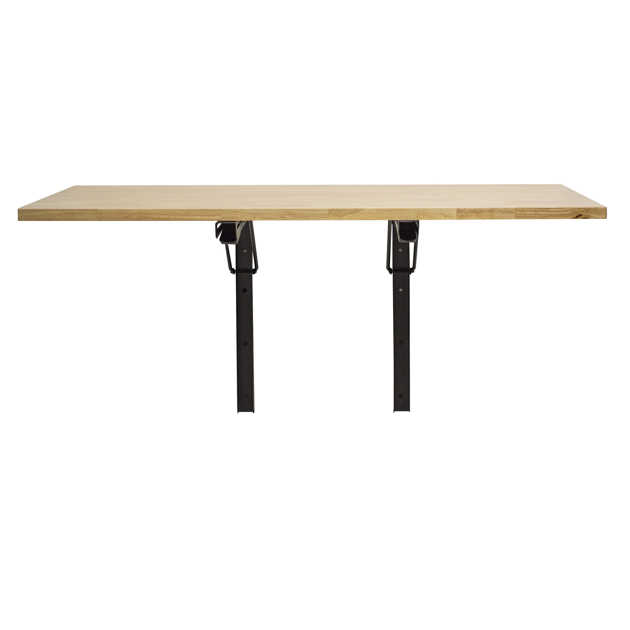 Space saving design provides a generous work surface. Use as a work bench in the garage, a potting bench in the shed, a prep surface in a small kitchen, or as a project station in the basement Rubberwood table top Includes 2 steel powder coated black brackets, 1 Woodwork top, 14 screws for assembly and installation No pre drilled holes on the table top for bracket attachment, drill recommended for assembly Overall Dimensions 47.25 W x 24 H x 2 inches thick when folded down, 330 lbs max weight capacity