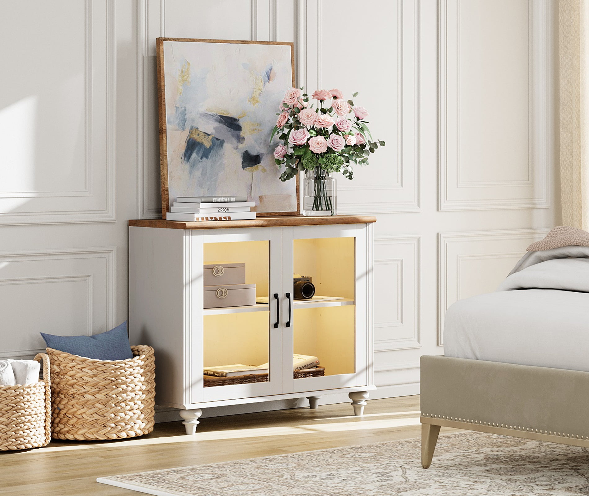 Buffet Cabinet with Glass Door, Kitchen Sideboard with 2 Storage & Adjustable Shelf, Modern Glass Entryway Table or Living Room Dining Room, White