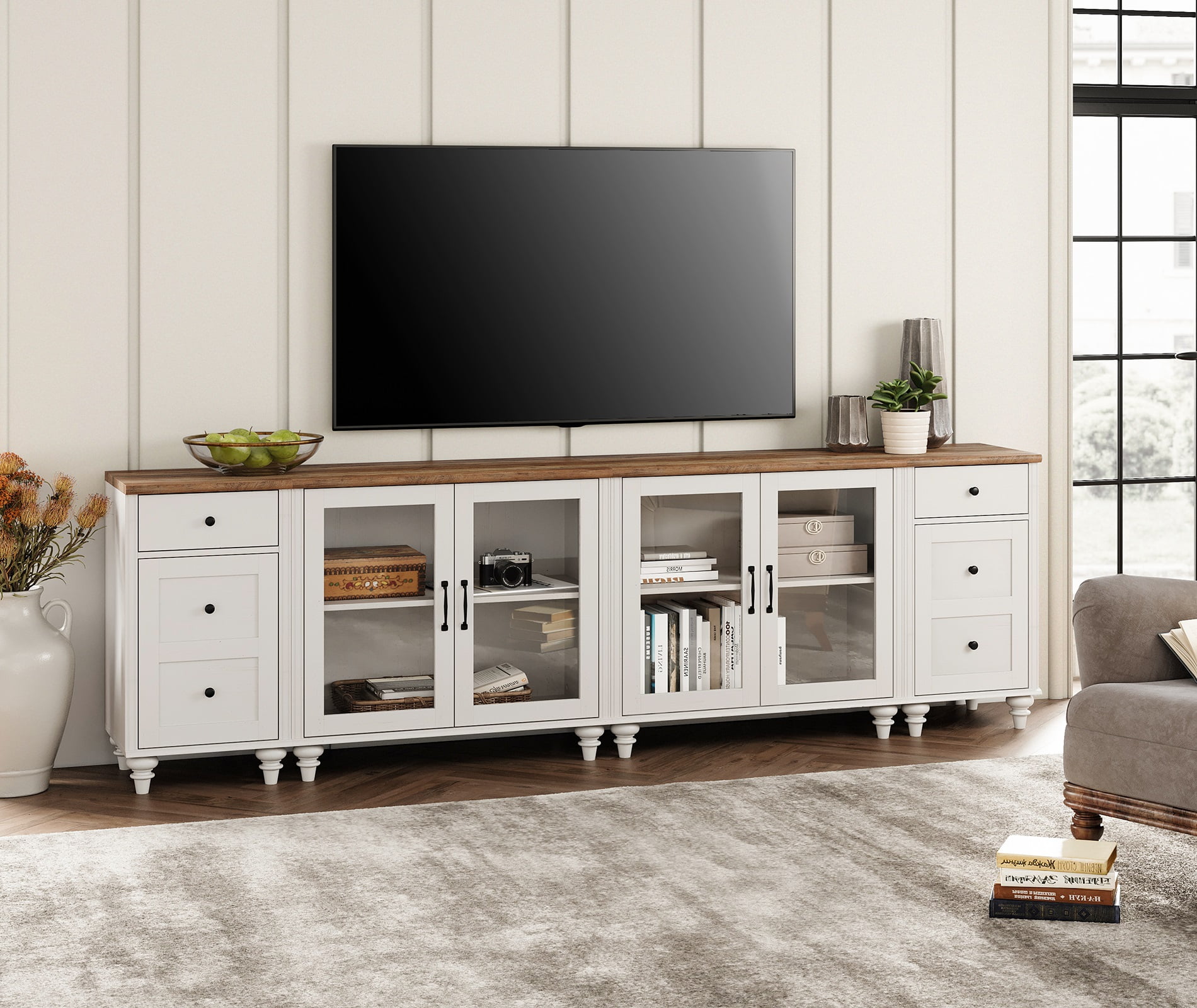 4-in-1 Multipurpose Buffet : The 4-in-1 large sideboard can be used separately as two glass cabinets and two end tables. In addition to kitchen buffet cabinet, it can be used as entertainment center, console table, etc. Dimension of Glass Cabinet: 33.9″×15.7″×30.9″(L×W×H). Dimension of Side Table: 16.5″×15.7″×30.9″(L×W×H). Elegant Appearance:Featuring off white distressed wood surface and mid century style, the kitchen cabinet is a perfect choice to add a touch of high-end and elegant charm to your room. Plus, the sideboard cabinet comes with a yellow led light so that you could DIY it to get more warmth. Glass Door& Height Adjustable Shelf:Designed with height adjustable storage shelf, you could manage the storage space according to the item size. Additionally, the transparent tempered glass door of the buffet sideboard make it easy for you to find items you need.Total Weight Capacity: 100 lbs. Charging Function: Only one of the nightstands set of 2 is designed with charging station, which is arranged with 2 standard AC outlets and 2 USB ports. Power cable length: 6.5 ft.You could charge mobile phone, table lamp and other device conveniently. Easy to Assemble:The white tv stand is effortless to assemble with detailed instruction. And its surface is convenient to clean with a soft damp cloth. If you have any questions, please feel free to contact us, we will try our best to provide professional service.