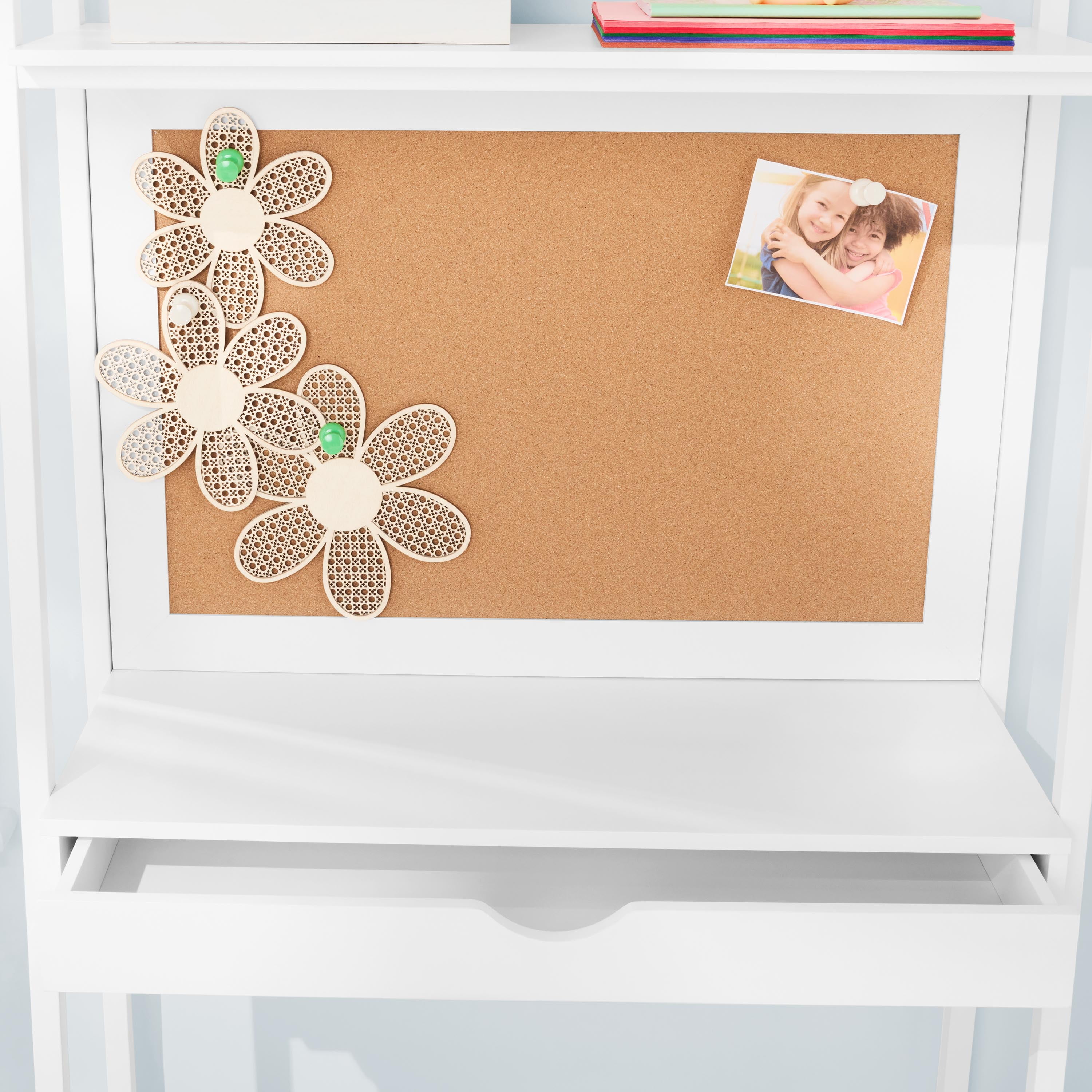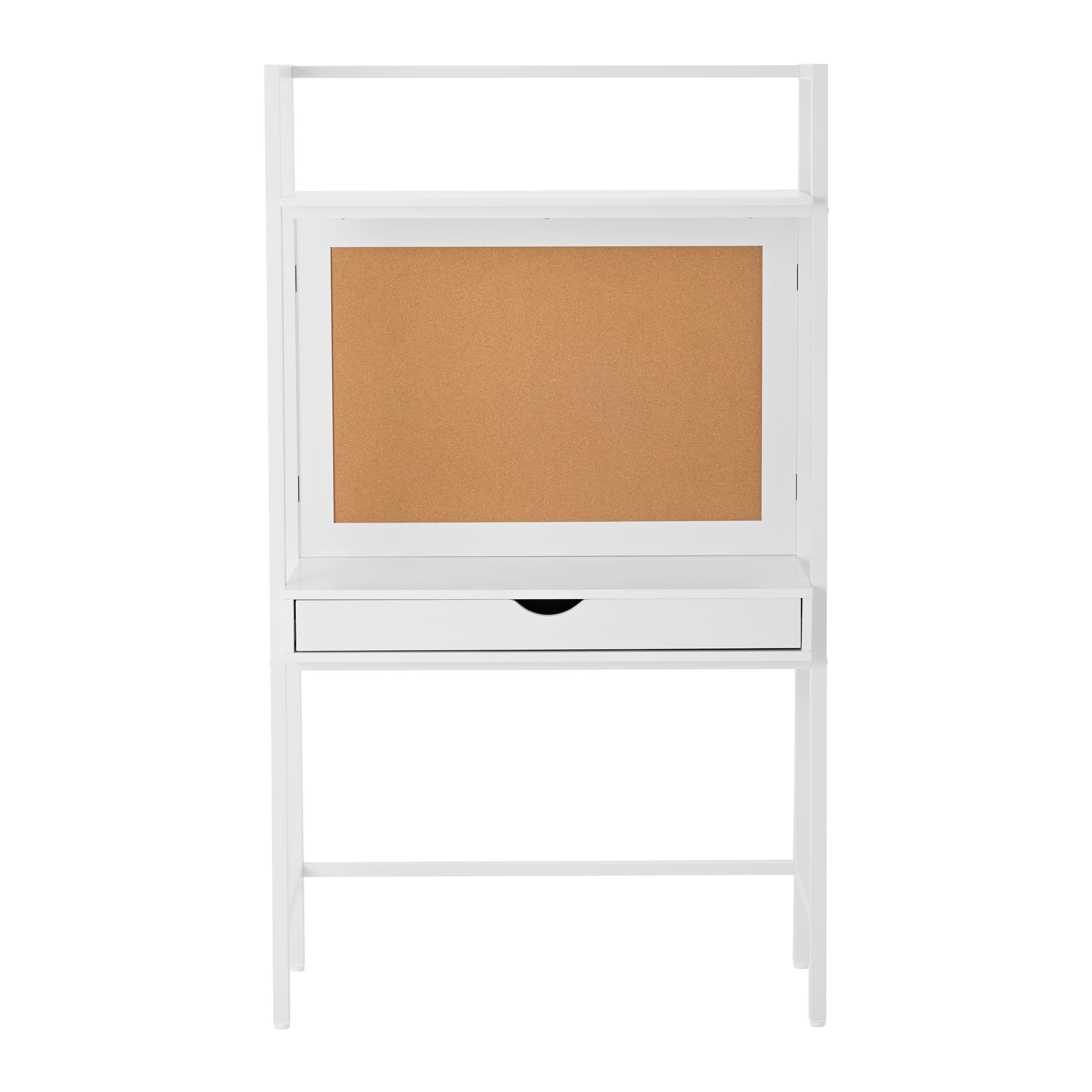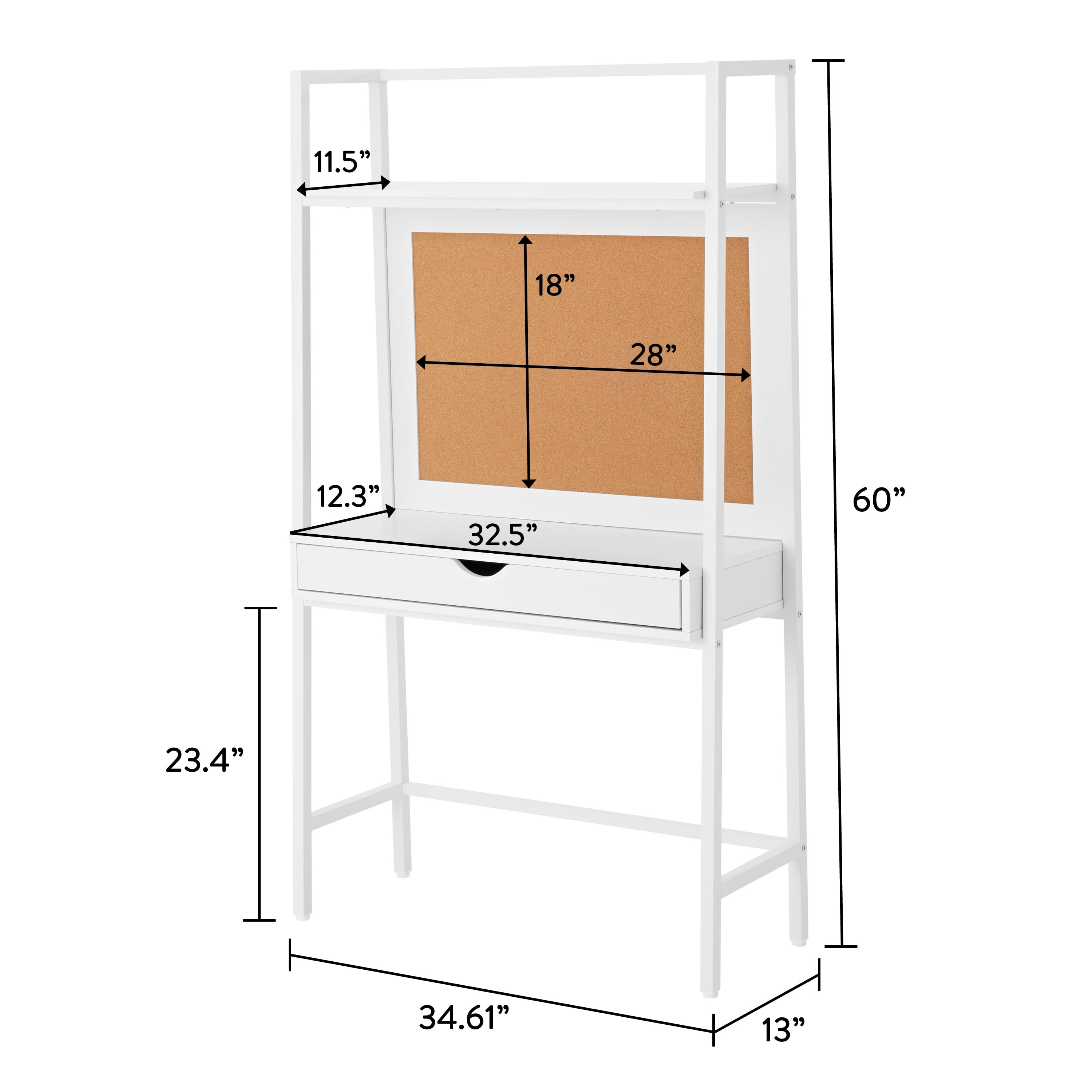 Ladder desk with a built in cork bulletin board Features a fixed hutch with a display shelf Wide drawer with a rounded cutout handle Angled metal frame creates tapered shape Crisp white finish Assembled dimensions: 34.61″ W x 13″ D x 60″ H (45.43 lbs) Drawer dimensions (interior): 29.25″ W x 9.6″ D x 2.4″ H Top shelf dimensions: 32.5″ W x 11.5″ D Combine it with the Build Your Own Furniture Kids Ladder Bookcase for a coordinated look (sold separately) Desk top and top shelf can support up to 50 lbs each, drawer can support up to 22 lbs Attaches to the wall with included mounting hardware for safety Materials: manufactured wood & metal Adult assembly required (hammer, Phillips head screwdriver & flat head screwdriver needed) Package size: 64.37″ x 25.91 x 4.02″ (55.0 lbs) Assembly Instructions Assembly Video