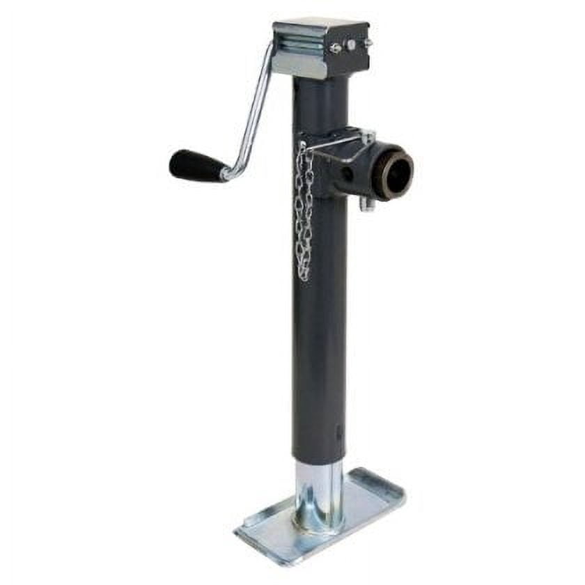 Sidewind crank and tubular swivel designed jack for agricultural, commercial, horse, and livestock trailers Heavy-gauge 2.25-inch diameter cylinder with a dependable vertical and side load capacity Precision fitted parts provide extra stability and are proven for reliability for long term use Trailer jack features a smooth, comfortable, and ergonomic design Lift capacity: 5,000 pounds Handle style: Topwind Travel: 15 inches Retracted: 15.4 inches Foot width: 3.9 inches Extended: 30.4 inches Clearance: 3.4 inches Foot place size: 7.5 x 3.9 inches Material Steel Color: Black Weight: 16.58 pounds Manufacturer warranty: 5-year warranty