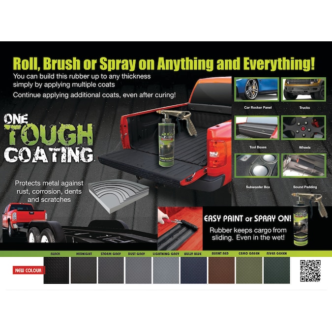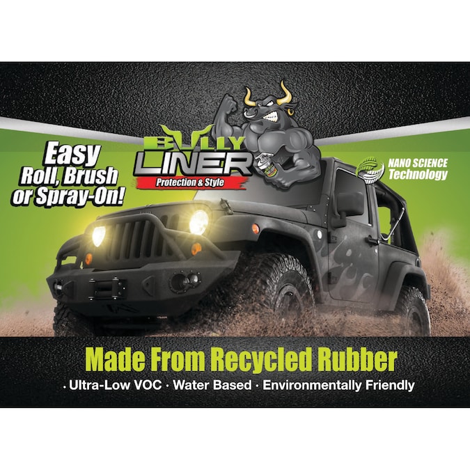 No mixing. No wastage. Non-hazardous, just open the can and use. Bullyliner is single component, environmentally friendly, water based and made from recycled tires. Enhanced with self-cleaning Nanotechnology, Bullyliner vulcanizes rubber onto almost any surface including metal, concrete, wood, plastic and asphalt – all cured in ambient air. Applied by roller, brush or Bullyliner spray gun (sold separately), is like lining the surface with car tires. Bullyliner protects the surface against dents, scratches, rust and corrosion. It works as an auto paint, auto coating, auto primer and truck bed liner.
