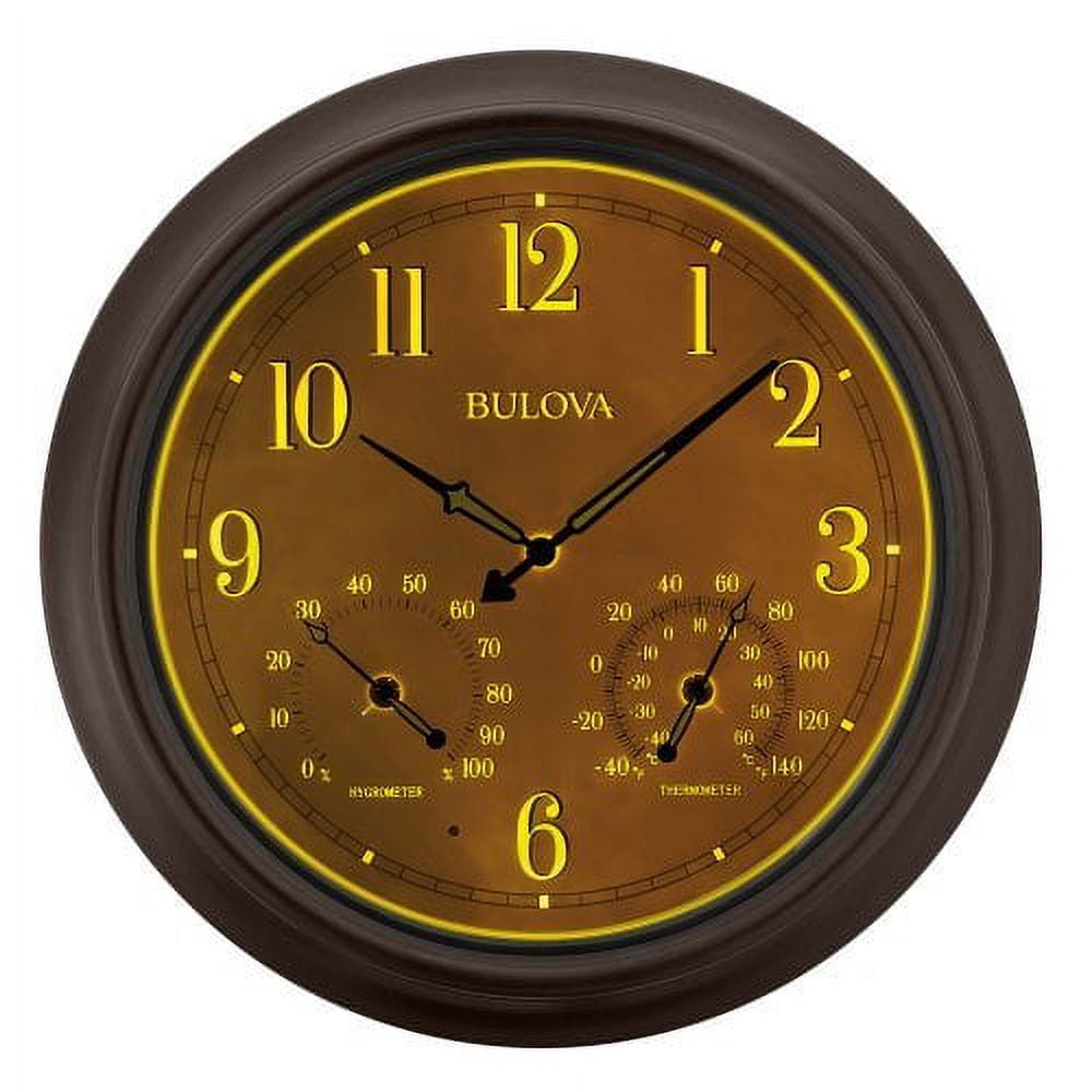 Beautiful enough to hang in your living room but tough enough for the outdoors, the Bulova Revere Wall Clock makes it easy to keep on top of time and temperature even when you’re outside. This beautiful clock has a two-step metal case in an oil-rubbed bronze finish. The movement is sealed with a gasket for protection from outdoor elements. The light-reflective ink of the numerals is easy to see, especially when illuminated by the four strategically placed LED lights. The lights are controlled by a light sensor, which activates at dusk and turns off at dawn. This beautiful clock also includes a thermometer with Fahrenheit and Celsius scales and a hygrometer, both of which are also easy to read at night.