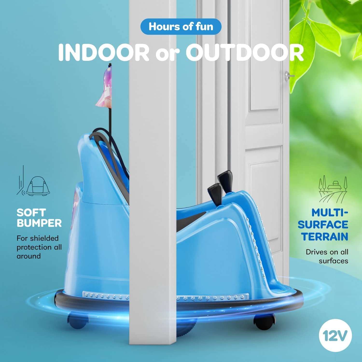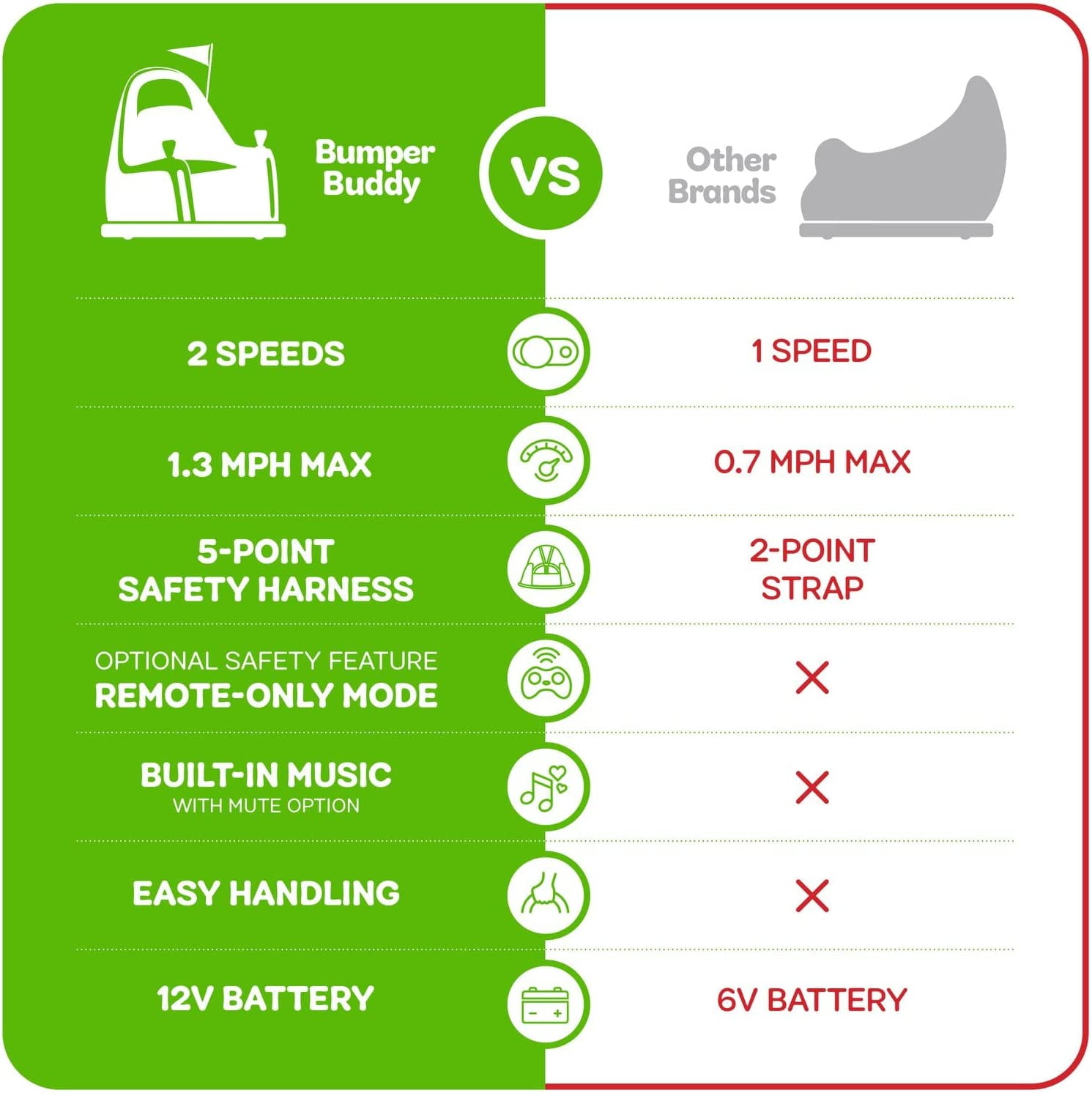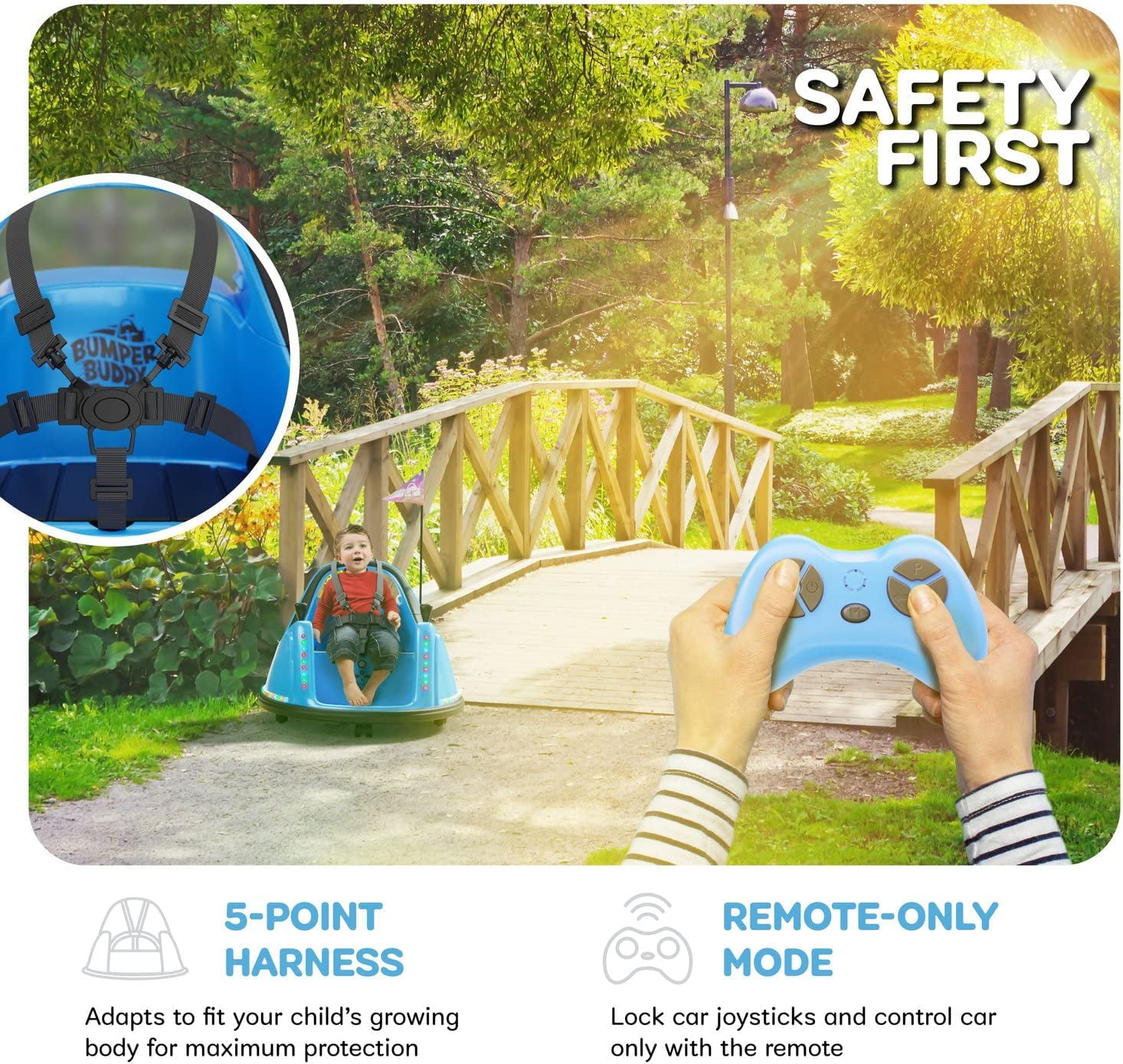 Ride, Bump, Race, & Spin: The most advanced and toddler-friendly bumper ride-on car yet! Engineered for maximum performance, fun, ease of use, and safety. Built from quality materials with cushioned rubber bumpers to protect walls and furniture. Safety First: The safety of your precious little one is our top priority. The first ride-on bumper car with a 5-point harness. Includes anti-flat tires, optional parent-only mode, and complies with all safety regulations (ASTM-certified). Amazing Features: Rechargeable (charging cable included), full 360° spin, 2-speed settings (0.75-1.25 mph), remote control, optional remote-only mode, blinking lights + music, 12V battery, customizable stickers, and very easy to use (includes a very clear user guide). Great Gift for that Little Child: It’s the perfect birthday or holiday gift or any other occasion. They will play endlessly and have a blast! 100% Satisfaction Guaranteed: Love it, or your money back! We’re sure that the child will have a blast, but if you are not satisfied with this product, we’ll refund you 100% of the money, no questions asked.