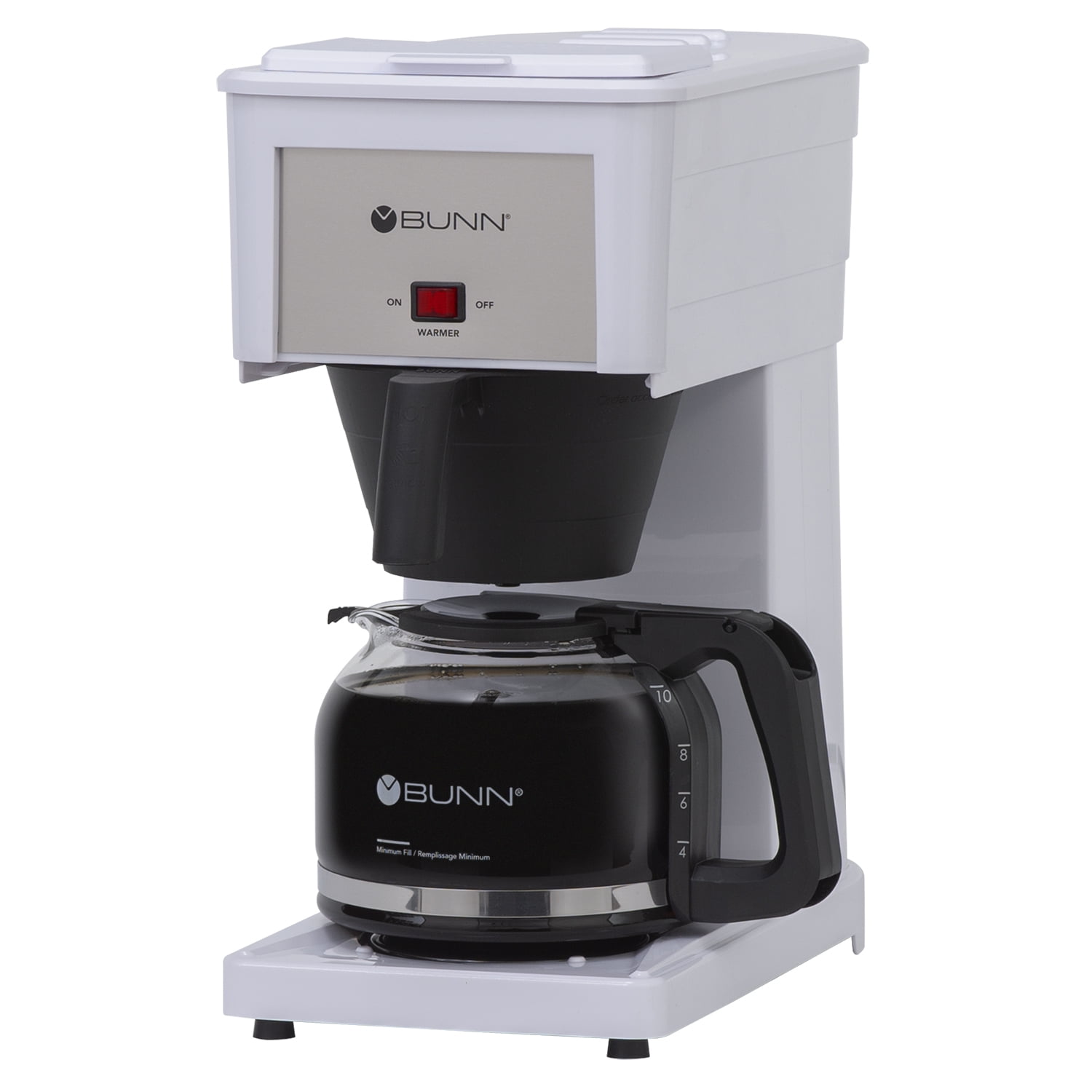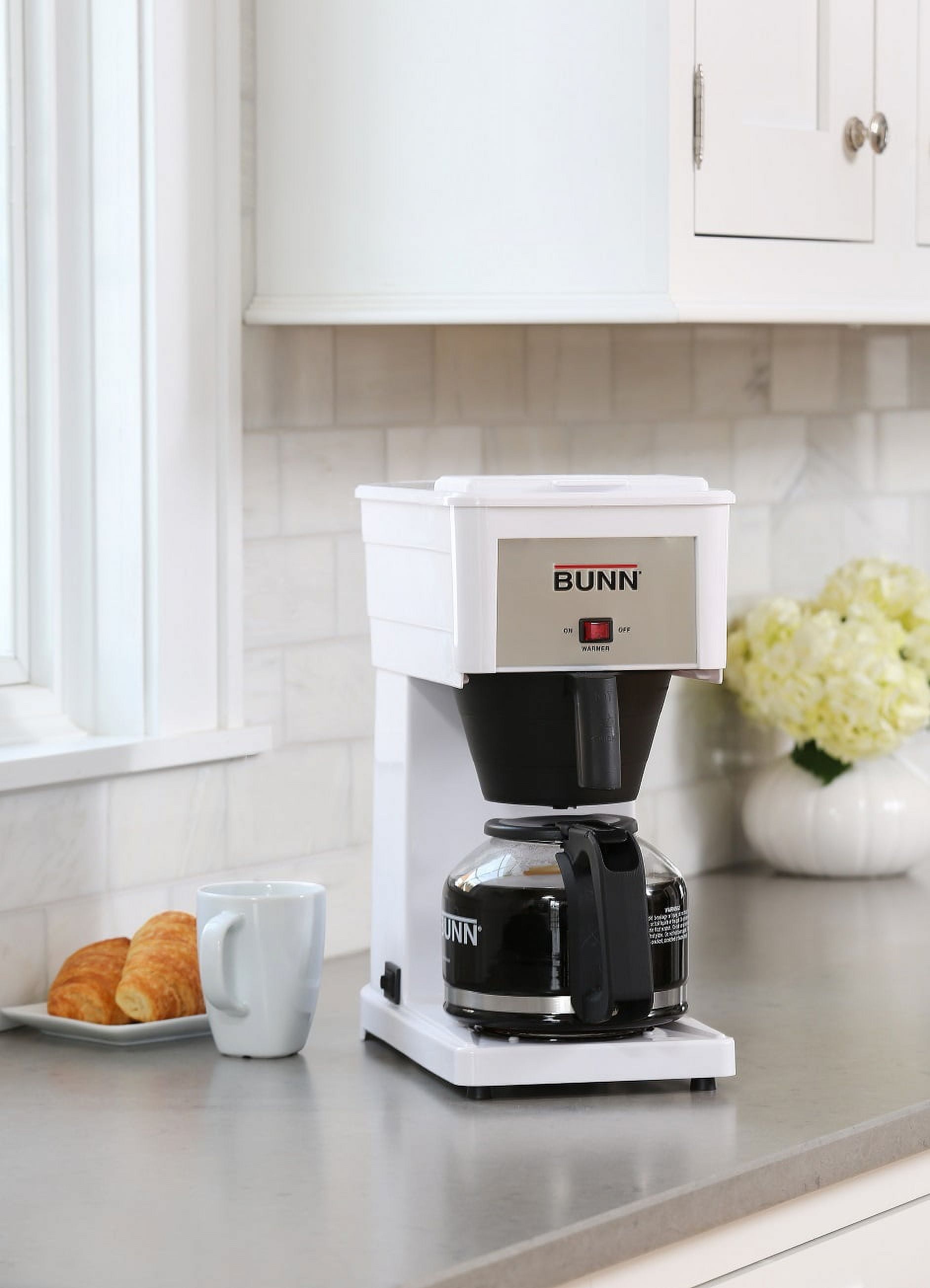 Brews a full pot in less than half the time of other top- selling home coffee makers Unique spray head for optimal coffee extraction and flavor Brews one large travel mug (20 oz.) to a full pot (50 oz.) BUNN Drip free carafe delivers the cleanest pour on the market Commercial grade stainless steel hot water tank Color: White