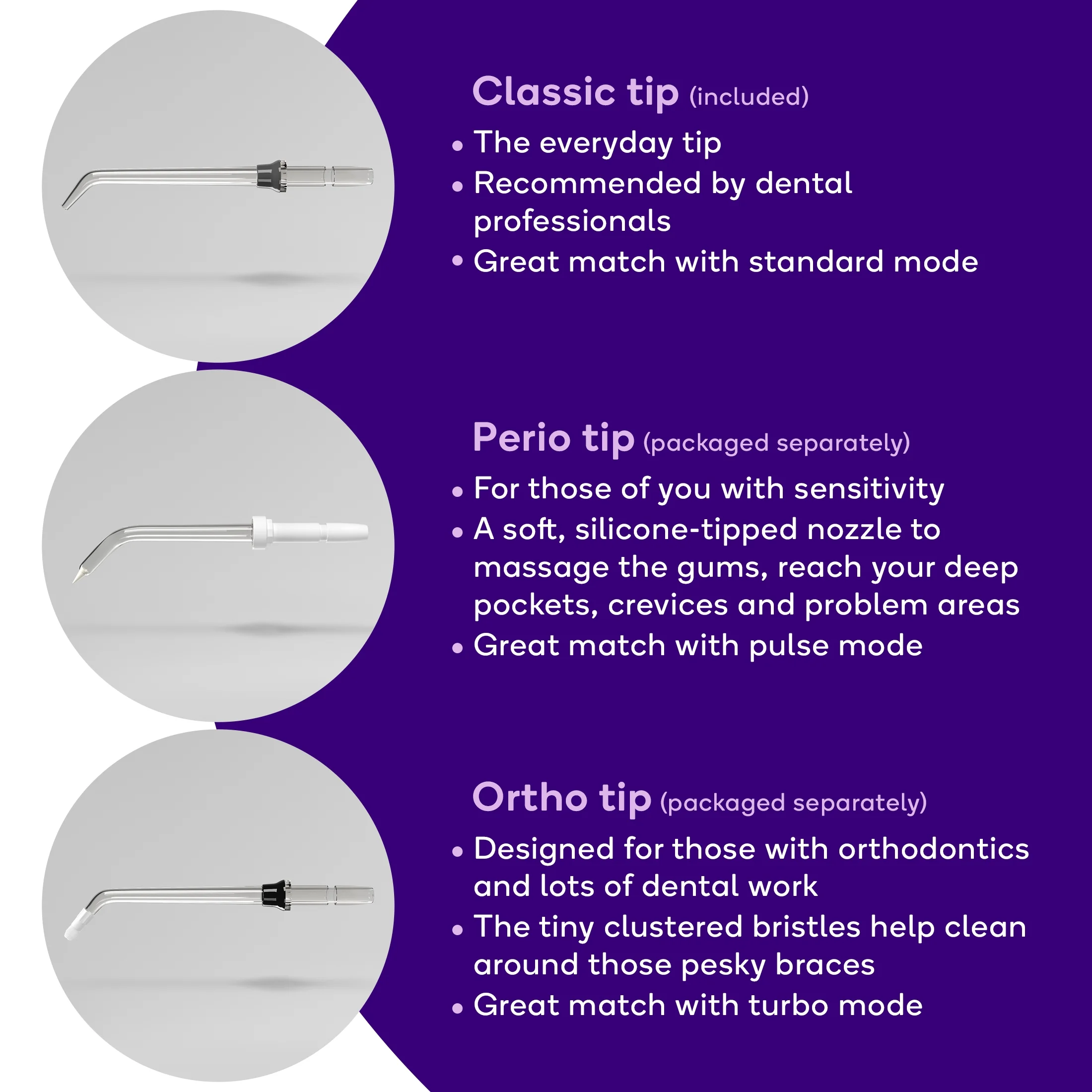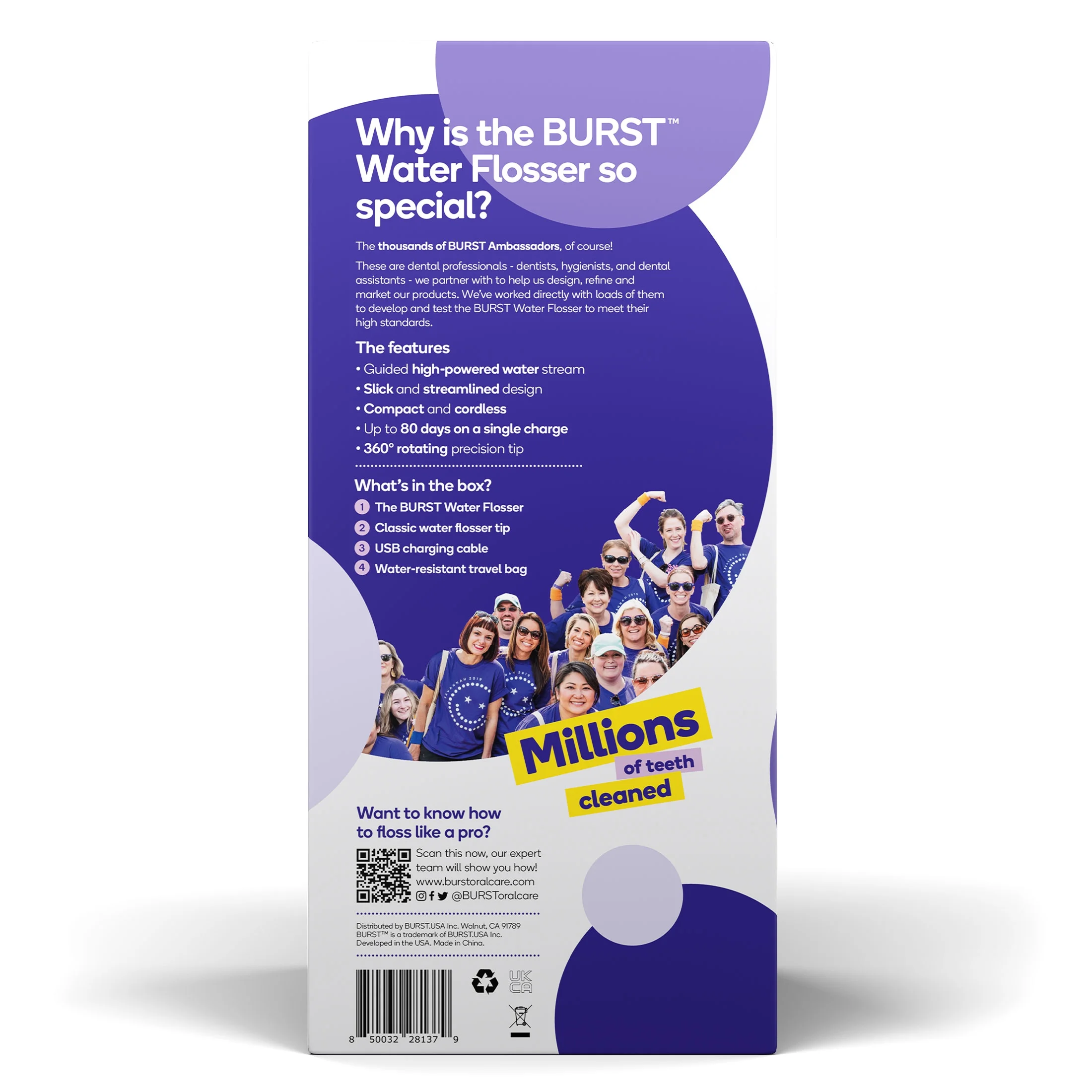 BURST Water Flosser is a portable electric flosser that blasts plaque for a deep clean while giving your mouth a satisfying refresh. Powered by one of the most robust motors on the market, this dental pro-designed dream is gentle on gums. It includes a 360-degree rotating classic dental flosser tip to quickly get into the hard-to-reach areas traditional floss can’t reach. Got braces or want more options? Use our ortho tip to get around dental work or perio if you experience sensitivity. Then, customize your clean further by choosing from three flossing modes: Turbo, standard, or pulse. And with water resistance, a compact design, and a battery life of up to 80 days, the BURST portable water flosser makes getting fresh breath and a clean feeling effortless whether at home or on the go.