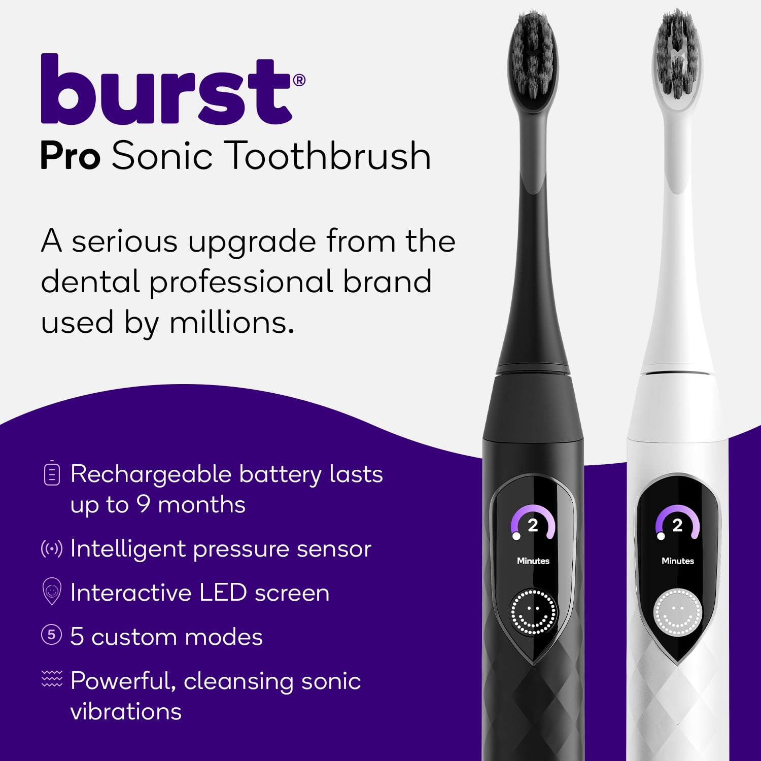 The BURST Pro is an electric toothbrush for adults that’s clinically proven to remove up to 10x more plaque.* It’s no wonder — we created it to be the peak of dental technology with 1000s of experts from our 35k+ community of hygienists and dentists. With clinically proven results and cutting-edge refined design, the Burst Pro is your at-home hygienist to help prevent overbrushing and overthinking. Get that satisfying fresh-from-the-dentist clean feeling with super soft tapered bristles and a tongue cleaner. The intelligent pressure sensor gives real-time feedback on brushing technique to help protect your gums. An interactive LED screen displays 5 custom modes and a brushing timer to help you brush for the dentist recommended 2 minutes. And the extra-long up to 9 month rechargeable battery means you rarely have to worry about charging your electric toothbrush.