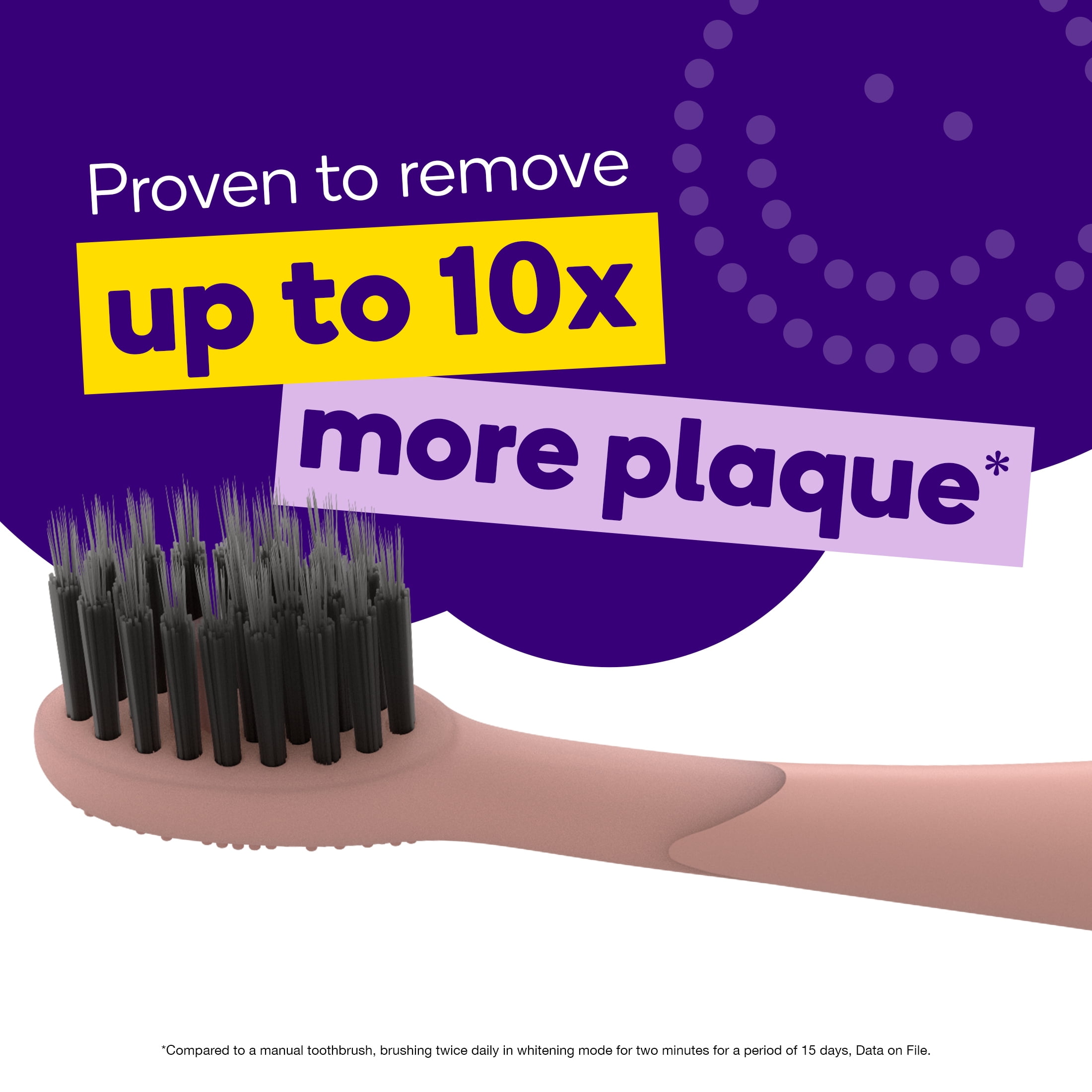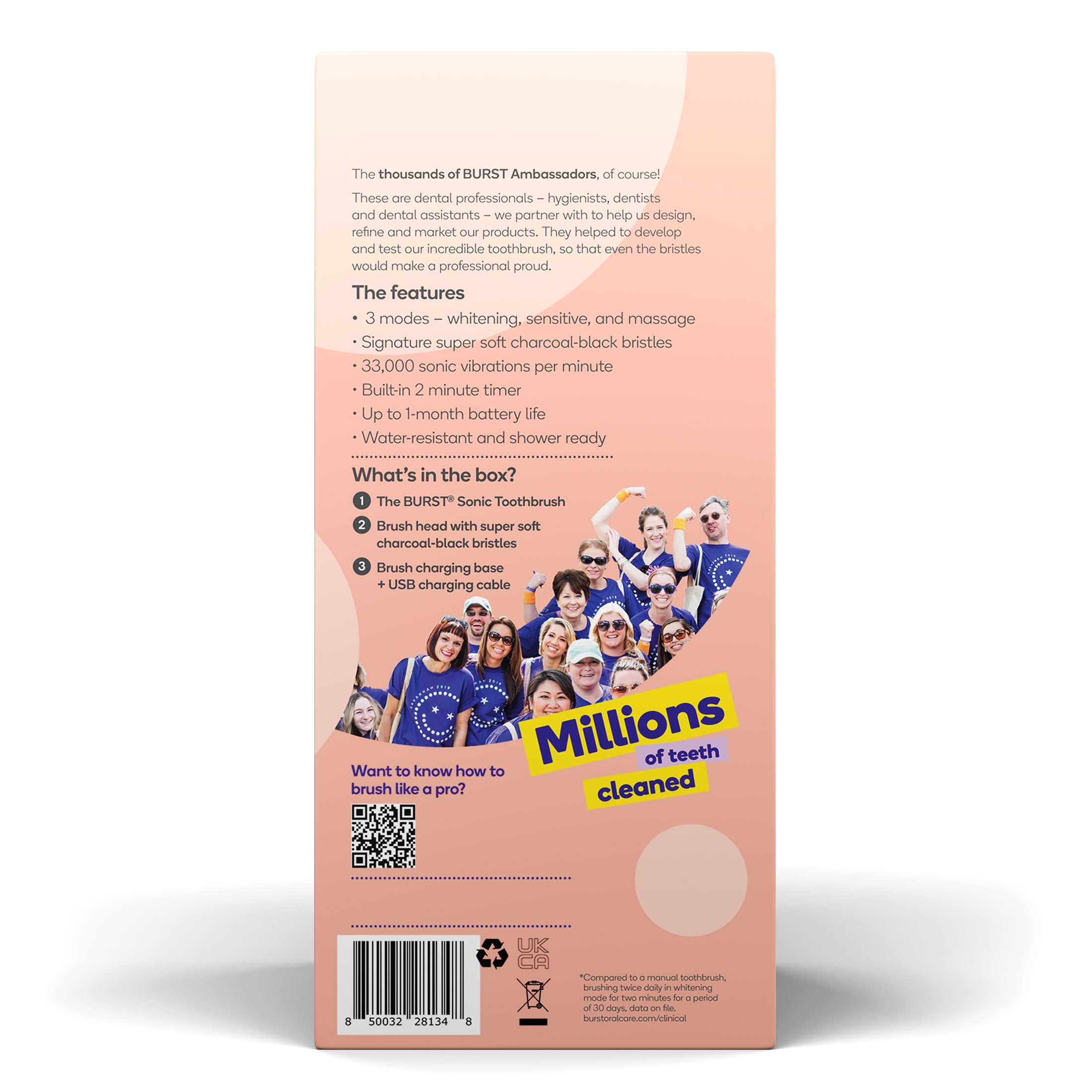 Noticeable Results – 10x More Plaque Removal: Proven to remove up to 10x more plaque than a manual toothbrush. BURST Sonic Toothbrush deeply cleans with 33,000 sonic vibrations per minute, whitens teeth and brightens smile while being gentle on gums. Reduce Gum Bleeding up to 3x: Get healthier gums in 2 weeks compared to a manual toothbrush. Ultra Soft Bristles: High quality super soft, multi-length, interdental-cut PBT nylon bristles whiten teeth as you brush. Dental professionals recommend soft bristles to prevent harm to gums and enamel. One Month Battery Life: Incredible battery life powered by a USB charger and wireless charging. Bring BURST when you travel and never worry about charging! Smart Timer: Dentists recommend brushing for 2 minutes, changing quadrants every 30 seconds. The 2-minute smart timer pulses every 30 seconds to remind you. 3 Modes: Customize your brushing with 3 modes: whiten, sensitive and massage. Dental Professional Approved: Made in partnership with a community 35,000+ dental hygienists and dentists strong. What You Get: Sonic Electric Toothbrush, Toothbrush Head, USB Charging Base, USB Charging Cord. Wall plug adaptor not included
