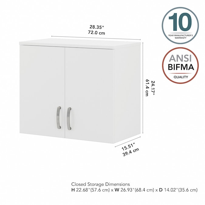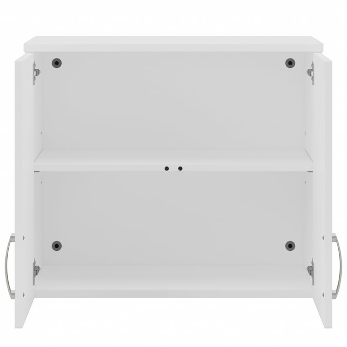 The Bush Business Furniture Universal Wall Cabinet with Doors and Shelves features a commercial quality design and contemporary styling that suits virtually any home or professional environment. Organize your office, breakroom, garage, laundry room or another work or living space with a wall mounted cabinet that’s built to last and boasts plenty of practical storage capacity. Cabinet doors with smooth Euro-style hinges open to reveal one fixed shelf and one adjustable shelf that accommodate office supplies, tools and household items of various sizes. The total weight capacity of the small wall shelf is 30 pounds. For best use, mount wall studs 16 inches apart during installation. Contemporary finish options include Storm Gray, Platinum Gray and White with Brushed Nickel hardware. This wall storage cabinet has been tested to meet ANSI/BIFMA quality standards for safety and performance and is backed by the Bush Business Furniture 10 Year Manufacturer’s Warranty. Create your own modular storage solution by adding the Universal Floor Storage Cabinet with Doors and Shelves, Floor Storage Cabinet with Drawer and Shelves, Floor Storage Cabinet with Drawers, Tall Narrow Storage Cabinet and Tall Storage Cabinet with Doors (coordinating items sold separately).