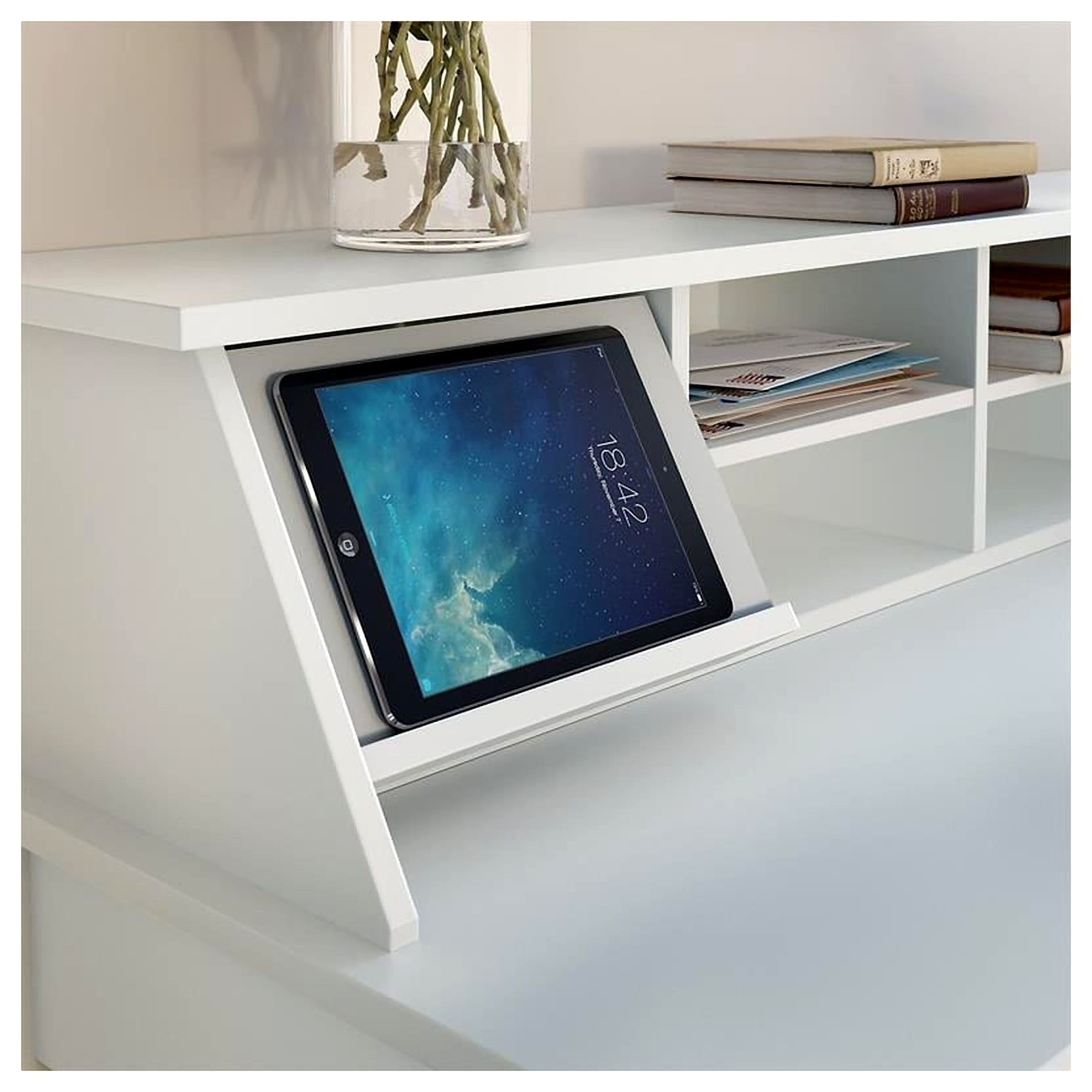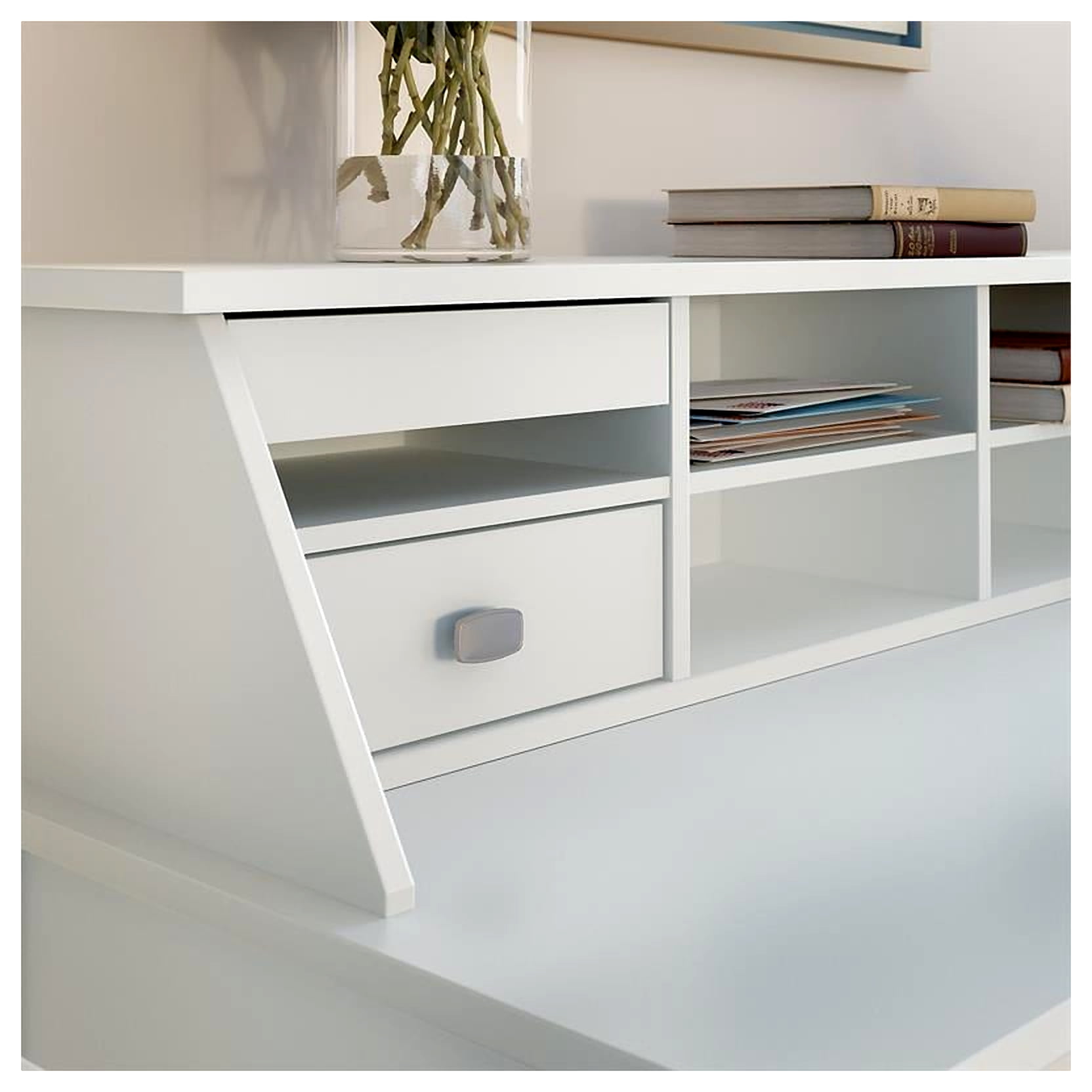 Find a place for everything and keep your personal workspace in order with the Bush Furniture Broadview Desktop Organizer. Designed for use on the Broadview Computer Desk with Drawers, Computer Desk with Shelves or L Shaped Computer Desk with Storage (coordinating items sold separately), this home office desk organizer mixes fashion with function to provide a stylish, practical storage solution. Eight cubby spaces sort stationery, mail and work-in-progress so you can access the supplies you need quickly and easily. Stash pens and pencils inside small drawers that fit in any two open compartments for a custom configuration. A pull-out accessory shelf provides an ideal place to keep your phone, tablet or other devices and can be installed on whichever side you prefer. Satin Chrome hardware complements your choice of Pure White and Modern Gray finishes for a contemporary look with long-lasting appeal. This desk shelf is tested to meet ANSI/SOHO quality standards for safety and performance and is backed by the Bush Furniture 1 Year Manufacturer’s Warranty. See the full collection for coordinating items available.