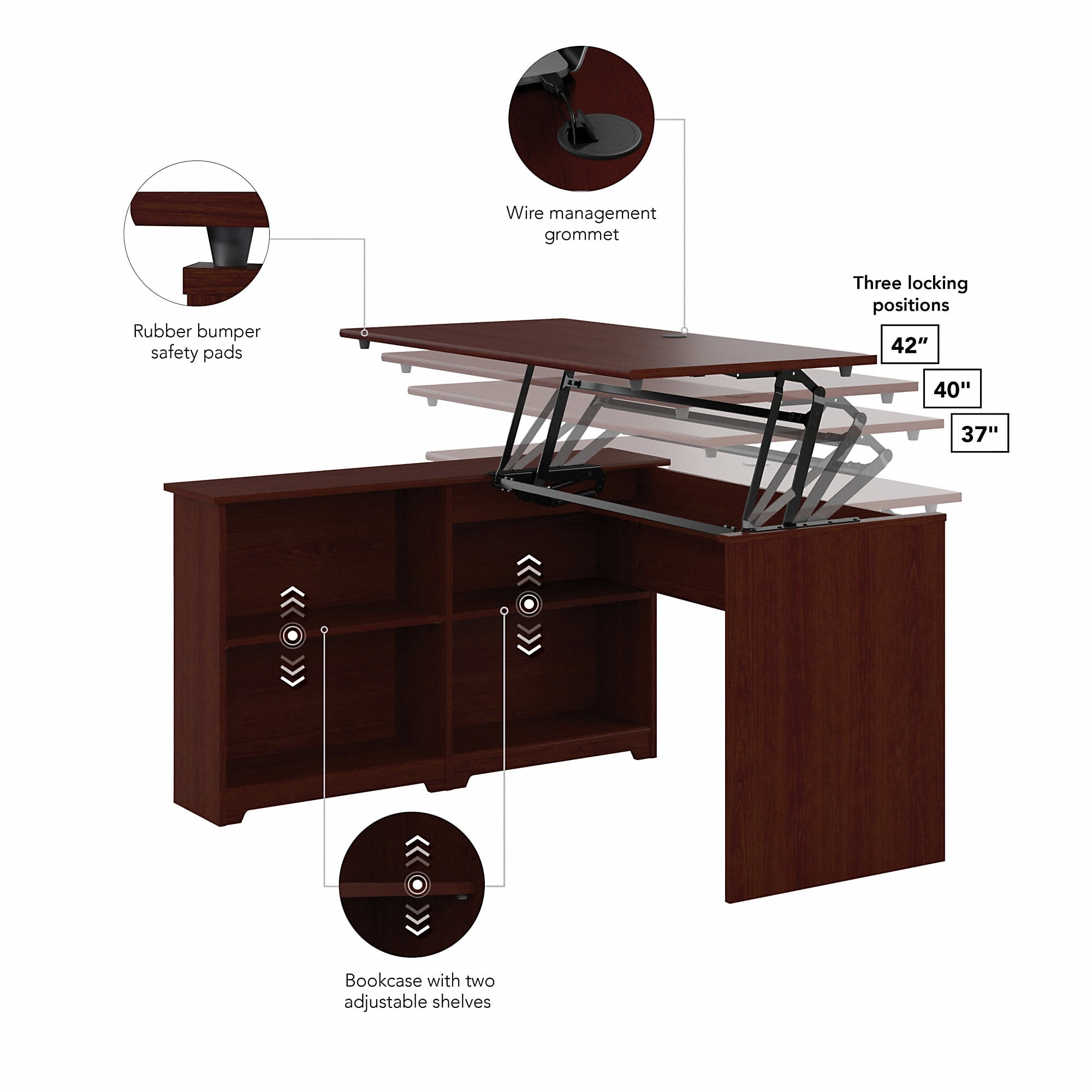 OFFICE DESK WITH STORAGE: Elevate any office or workspace with the Bush Furniture Cabot 52″W 3 Position Sit to Stand Corner Bookshelf Desk. Designed for increased productivity PLENTY OF STORAGE SPACE: Use the spacious bookshelf to organize your work and study materials. With 2 adjustable shelves, the bookcase provides flexible storage 3 LIFT HEIGHTS: Built-in mechanical Lift-n-Lock system raises and locks the desktop at 3 different standing heights. Choose between 36”H, 39”H and 42”H for an ergonomic work or study solution SPACE-SAVING CONVENIENCE: L shaped desk offers ample work room and can be placed in a corner to save space. Home office desk provides a table surface for multitasking ELEGANT AND TIMELESS DESIGN: Your choice of contemporary and traditional finishes pair nicely with any office, bedroom, dorm or workspace COMPLETE YOUR HOME OFFICE: Explore coordinating Cabot pieces. Attractive Harvest Cherry finish complements your choice of Cabot furniture finishes DEPENDABLE PERFORMANCE: Bush Furniture’s commitment to safety includes rigorous testing that meets or exceeds industry standards. Our corner desk is backed by a 1-Year Manufacturer’s Warranty CABOT COLLECTION: Experience comfortable elegance and ample, accessible storage. Shop our complete office furniture collection for a simple and cohesive look