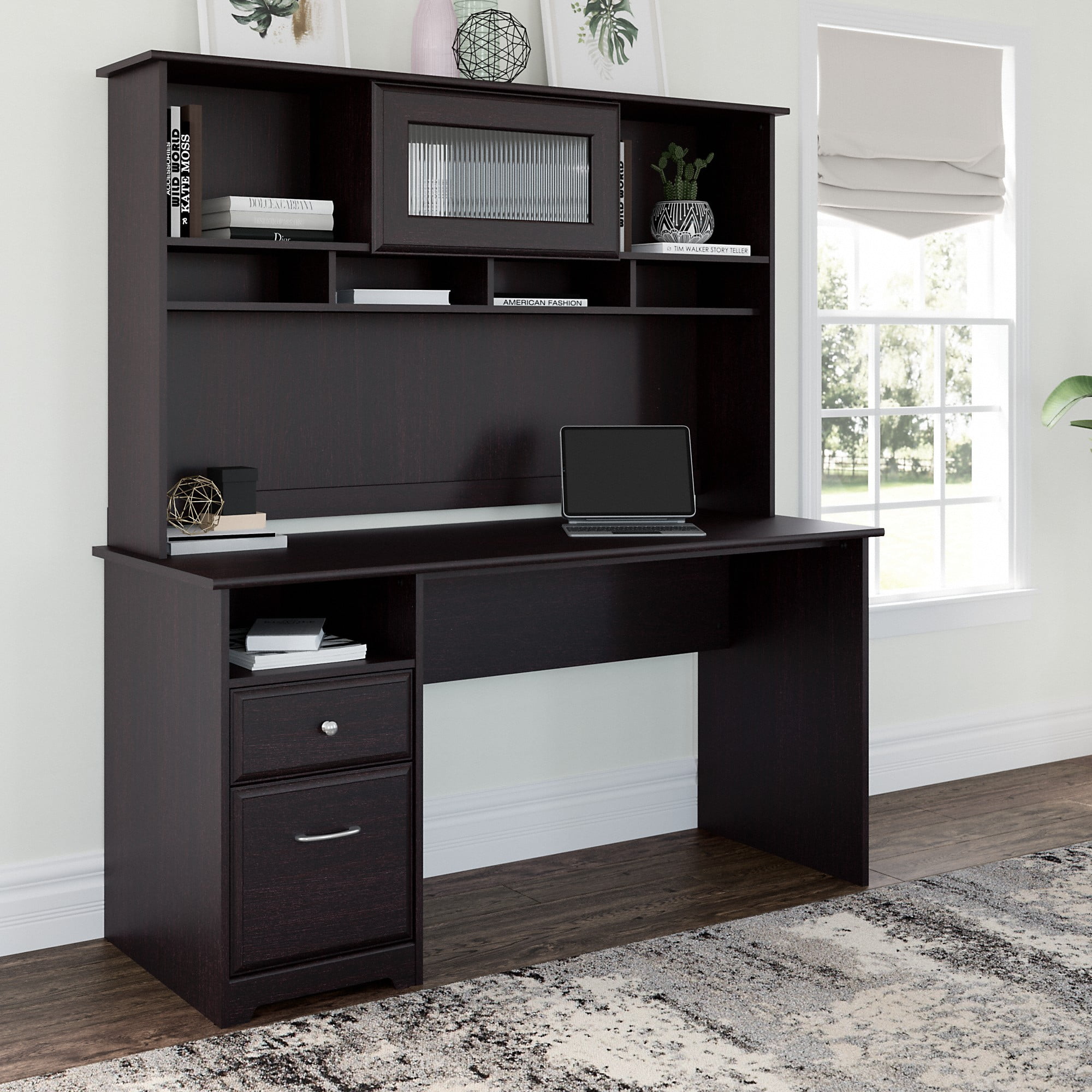 OFFICE DESK AND HUTCH: Elevate any office or workspace with the Bush Furniture Cabot 60″W Computer Desk and Hutch. Desk with storage measures 60″W x 23″D x 66″H PLENTY OF STORAGE SPACE: Organize books, binders and other work materials in the hutch’s concealed and open storage spaces or in the desk’s box drawer and file drawer SMOOTH BALL-BEARING SLIDES: The file drawer opens smoothly on ball-bearing slides, allowing easy access to letter, legal and A4-size paperwork DURABLE CONSTRUCTION: Spacious work desk offers a durable table surface with plenty of room to multitask. Versatile desk is ideal for a bedroom, office or dorm room ELEGANT AND TIMELESS DESIGN: Stylish fluted glass door, chrome-finished hardware and your choice of contemporary and traditional finishes pair nicely with any workspace COMPLETE YOUR HOME OFFICE: Explore coordinating Cabot pieces. Attractive Espresso Oak finish complements your choice of Cabot furniture finishes DEPENDABLE PERFORMANCE: Bush Furniture’s commitment to safety includes rigorous testing that meets or exceeds industry standards. Our study desk and hutch is backed by a 1-Year Manufacturer’s Warranty CABOT COLLECTION: Experience comfortable elegance and ample, accessible storage. Shop our complete office furniture collection for a simple and cohesive look