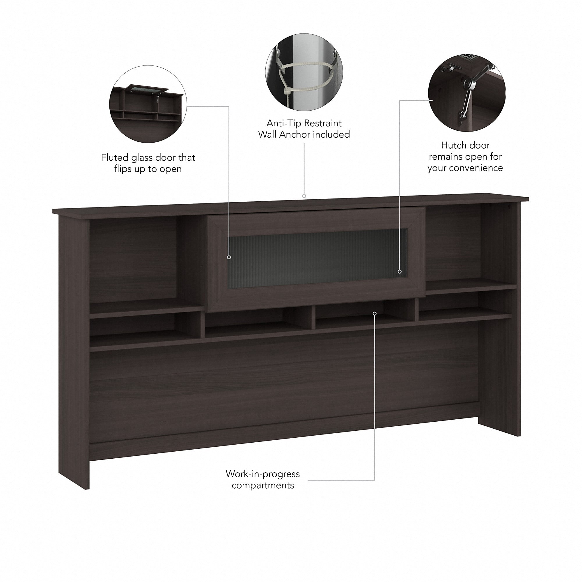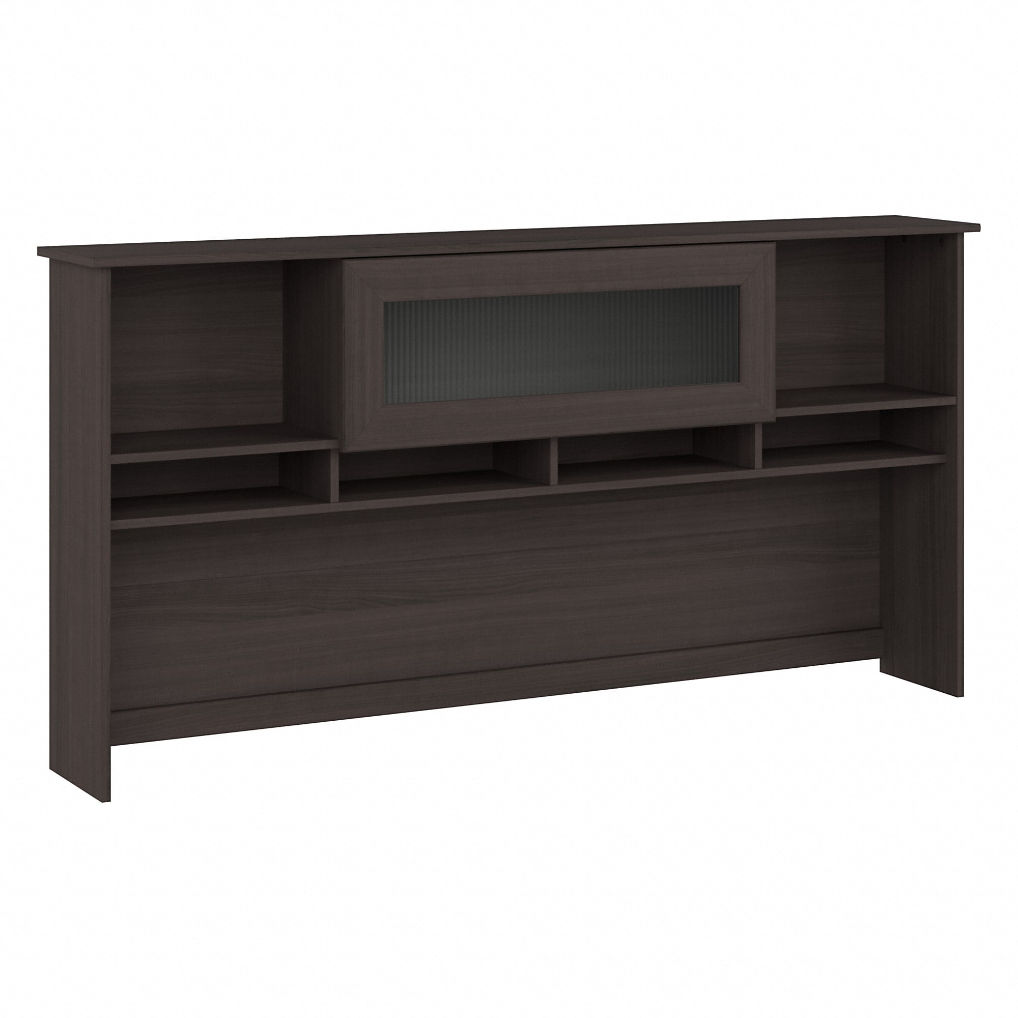 72W x 12D x 36H Desk Hutch boasts transitional styling that suits a variety of home offices Attaches to coordinating Cabot 72W Computer Desks (sold separately) for additional storage and display space Thoughtfully designed for maximum stability and includes hardware to anchor the computer hutch to a wall Closed storage compartment with fluted glass door keeps materials and supplies in order and out of sight Right and left shelves are ideal for organizing books or showing off plants, pictures, and decorations Bottom cubby spaces keep work-in-progress and frequently used materials easily accessible Available in your choice of several traditional or contemporary finish options for a look that works in any living space Bush Furniture’s commitment to safety includes rigorous testing that meets or exceeds ANSI/SOHO standards Backed by a 1 Year Manufacturer’s Warranty; with . and imported parts Add to your Cabot Desk and Hutch Set with a coordinating Office Chair, File Cabinet, Bookcase and more (sold separately)