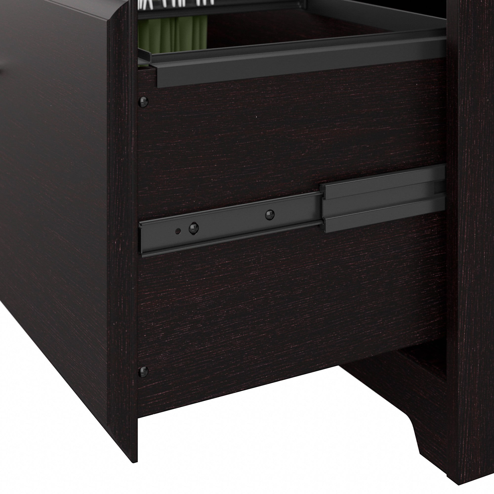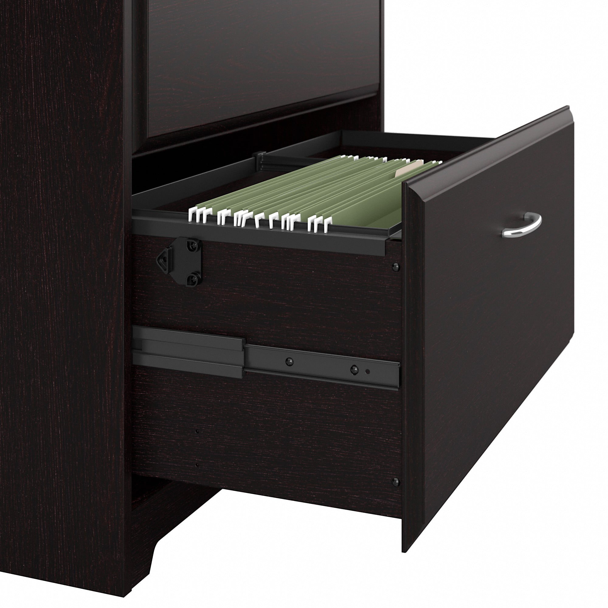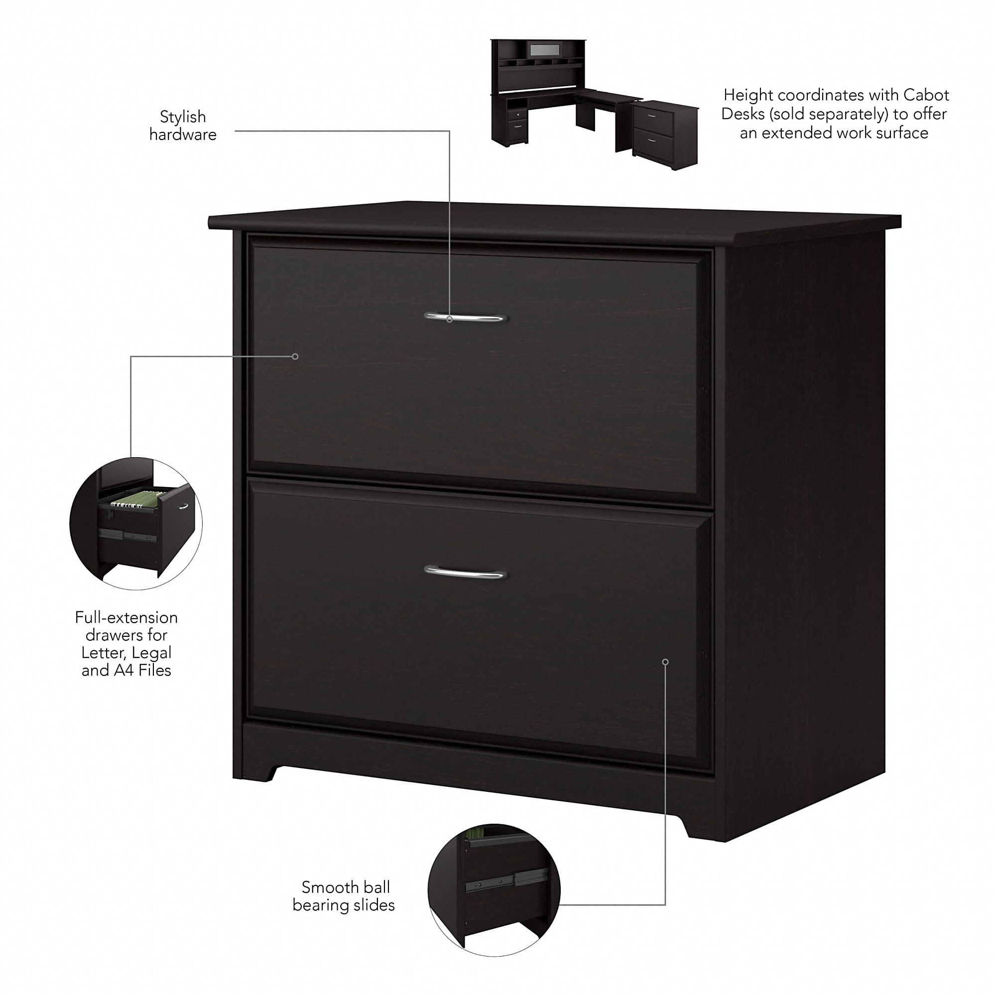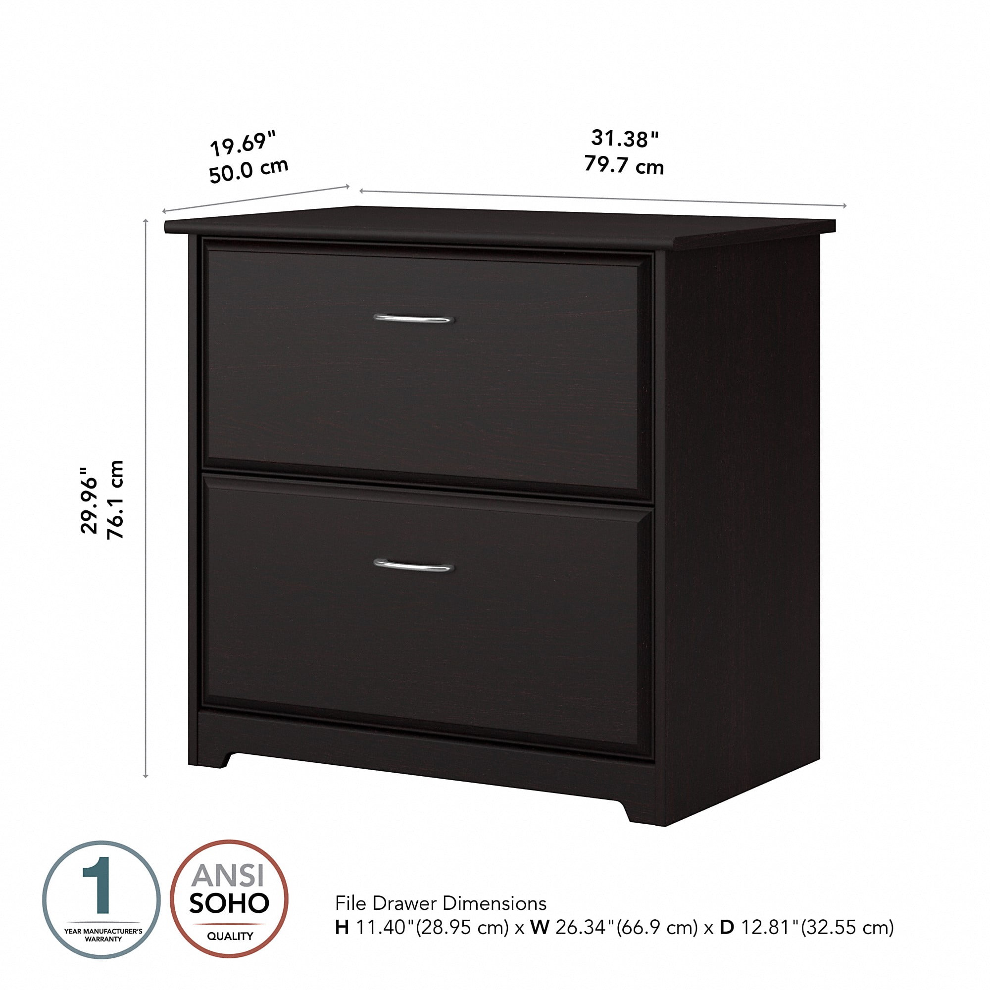 From Bush Furniture’s Cabot Collection, this 2 Drawer Lateral File Cabinet in Espresso Oak is the perfect storage solution for any workspace or home office. Measuring 31″W x 20″D x 30″H, our two drawer file cabinet conveniently organizes your work or study accessories. Set on smooth ball-bearing slides, the file cabinet drawers open effortlessly for easy access to stored paperwork and office materials. With attractive edge detailing and tasteful pattern accents, this versatile under desk storage piece adds a stylish touch to any office. Pair work cabinet with any Cabot Desk (sold separately) to extend your work space and increase office organization. Tested and approved to meet or exceed industry standards, this modern file cabinet withstands years of use. At Bush Furniture, we’ve been serving our customers nationally for over 60 years. Our mission is to offer quality, affordable furniture with the best customer service in the business.