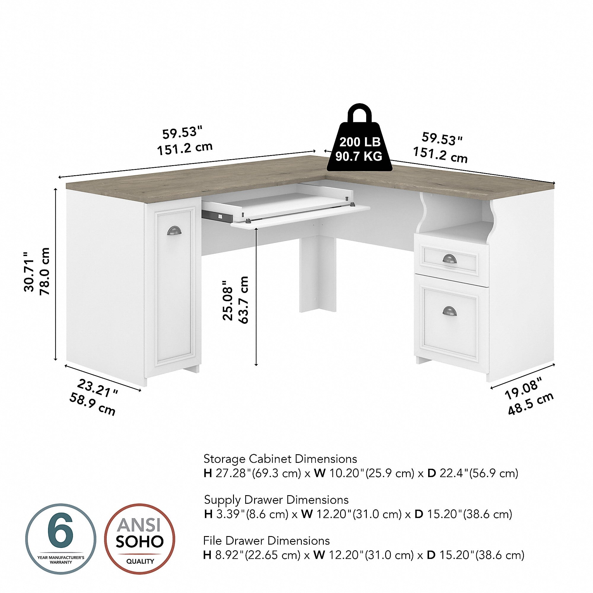 Bring a slice of modern farmhouse styling into your home office with the Bush Furniture Fairview L Shaped Desk. Enjoy your morning coffee, surf the net and pay bills with plenty of room to spare on the Corner Desk’s spacious and durable work surface. Stash pens, paper and check books in the box drawer and open cubby space while organizing mail in the letter-size file drawer. A drawer that features a convenient flip-down front makes an ideal keyboard tray or laptop storage shelf, so the desktop remains free for your daily tasks. The L Desk’s vertical storage cabinet contains one adjustable shelf to accommodate office supplies and materials of various sizes. Charming accents and Antique Pewter hardware add plenty of character to your home office. Attach the coordinating 60W Hutch (sold separately) to either side of the L Shaped Computer Desk to enhance your workspace’s storage and display capacity. Finish options include Antique Black with Hansen Cherry accents, Antique White with Tea Maple accents, Pure White with Shiplap Gray accents or solid Cape Cod Gray. This farmhouse desk with storage is tested to meet ANSI/SOHO quality standards for safety and performance. See the full Fairview Collection for coordinating items to complete your work or living space with relaxed cottage styling.
