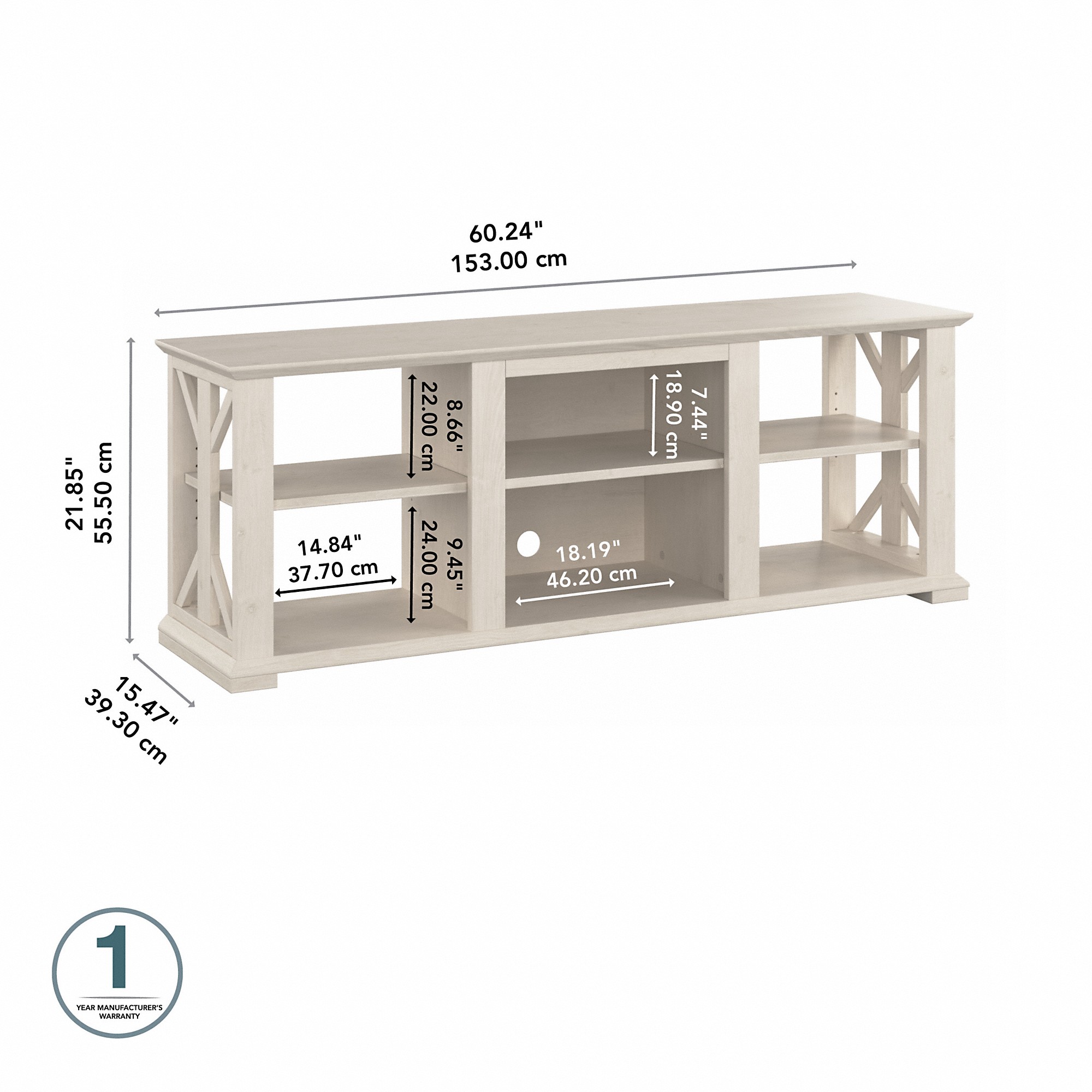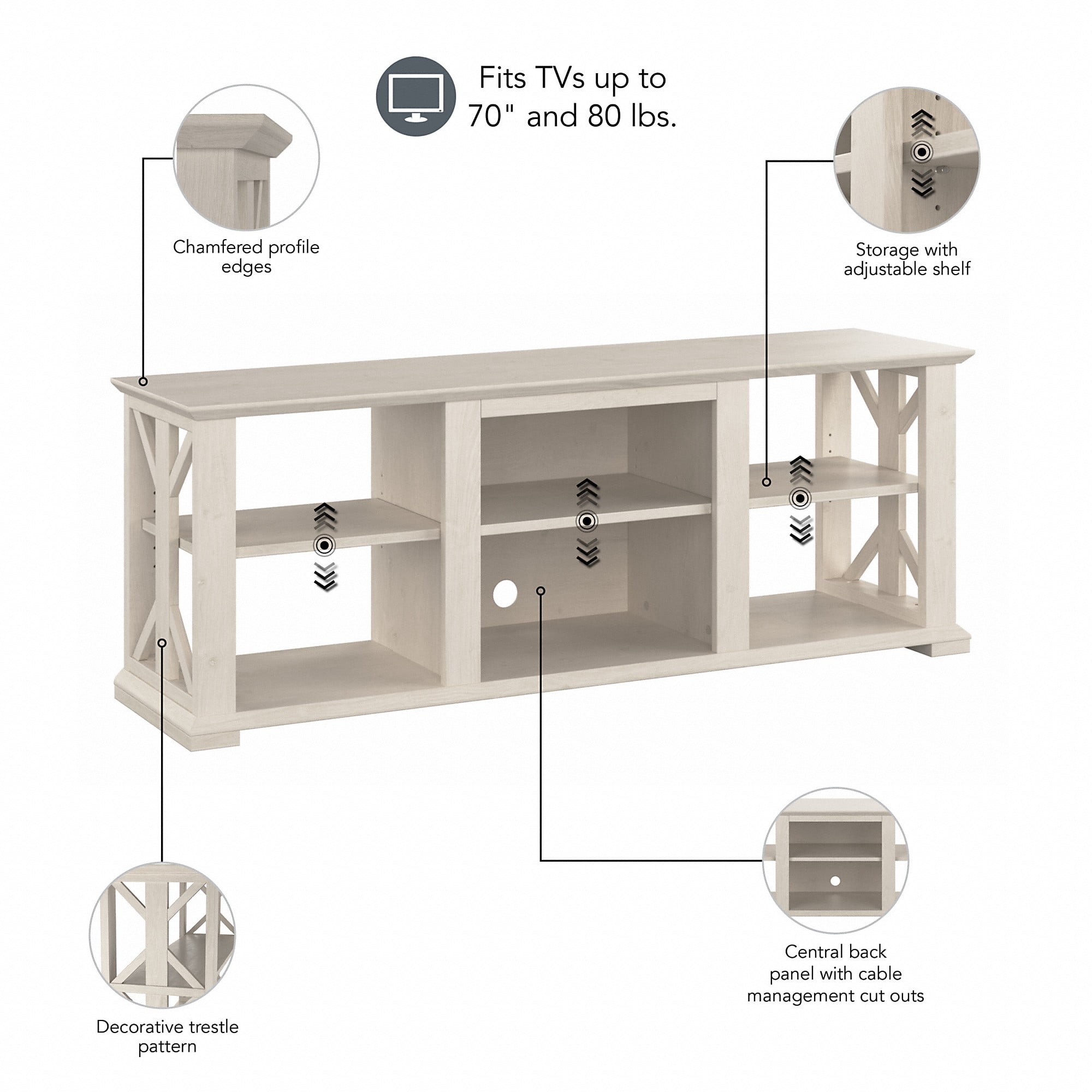 60W x 16D x 22H TV Stand supports up to a 70 inch television and/or 80 pounds of weight Tip Guard(TM) safety features include a stable design and wall attachment hardware Three adjustable shelves to accommodate your collection of movies, video games, and more Central back panel with cable management cut outs for easy organization of wires from electronics Open storage cubbies provide plenty of storage space for electronics and other personal belongings Decorative trestle patterns and chamfered profile edges give this Media Console a casual farmhouse style Finishes with a beautiful natural grain pattern create a relaxed feel in your home or office Bush Furniture’s commitment to safety includes rigorous testing that meets or exceeds industry standards for safety and performance Backed by the Bush Furniture 1 Year Manufacturer’s Warranty See the complete Homestead Collection for coordinating items available