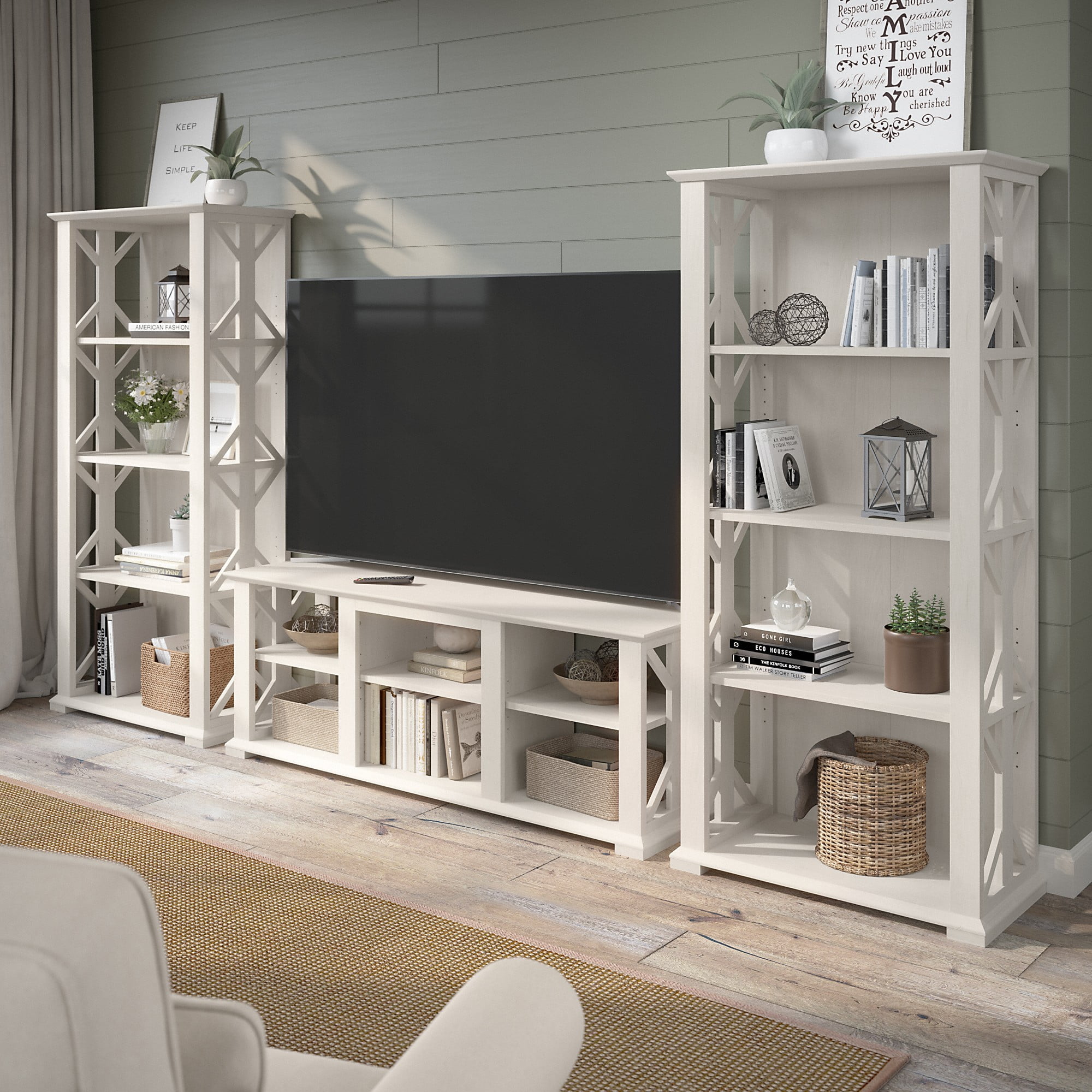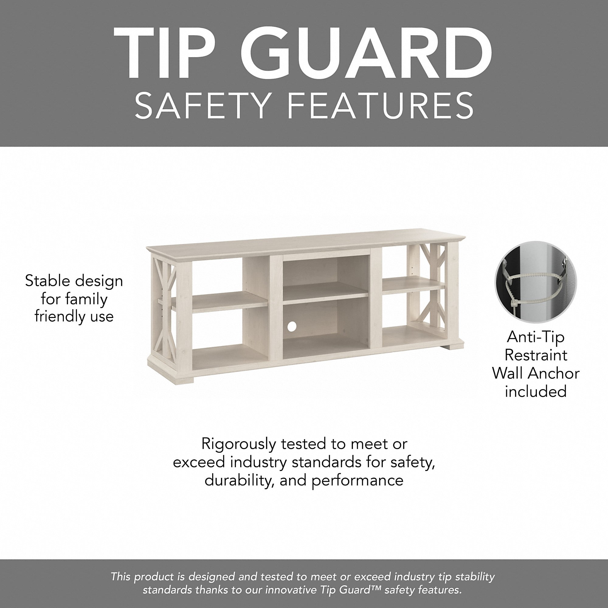 The Bush Furniture Homestead Farmhouse TV Stand for 70 Inch TV is an ideal choice to be the entertainment hub of your home’s living room. Designed with your safety in mind, this media unit includes a stable design and wall attachment hardware for family-friendly safety. Decorative trestle patterns and chamfered profile edges give this TV stand a casual farmhouse style. Host movie nights with family and friends or kick back and relax with your favorite show with a TV console that supports up to a 70 inch television and/or 80 pounds. Three adjustable shelves accommodate your collection of movies, video games and more. Central back panel features cable management cut-outs to keep all your media wiring neatly organized while open storage cubbies provide plenty of space for electronics and other personal belongings. Tip Guard(TM) safety features include a stable design and wall attachment hardware. Use the versatile 60W x 16D x 22H sofa table on its own or add the matching Homestead Console Table and other living room essentials for a coordinated look. Finishes with a beautiful natural grain pattern create a relaxed feel in your home or office. Bush Furniture’s commitment to safety includes rigorous testing that meets or exceeds industry standards for safety and performance and is backed by the Bush Furniture 1 Year Manufacturer’s Warranty. See the complete Homestead Collection for coordinating items available.
