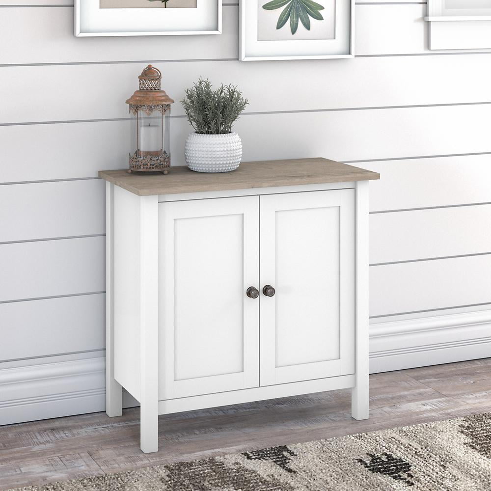 31W x 16D x 30H Accent Storage Cabinet offers a stylish and practical way to organize any living space Multipurpose Accent Cabinet works well in a home office, living room, entryway, kitchen or bathroom 2 Door Cabinet opens to reveal one adjustable shelf for flexible storage of household items and supplies Smooth Euro-style hinges allow the cabinet doors to open and close effortlessly Accepts coordinating Tall Hutch Organizer (sold separately) for additional storage and display capacity Modern farmhouse Storage Cabinet features a stylish Pure White and Shiplap Gray two-tone finish with Dark Bronze hardware Sturdy and attractive post leg design withstands years of use in virtually any residential setting See the complete Mayfield Collection for coordinating items available Tested to meet ANSI/SOHO quality standards for safety and performance Backed by the Bush Furniture 1 Year Manufacturer’s Warranty