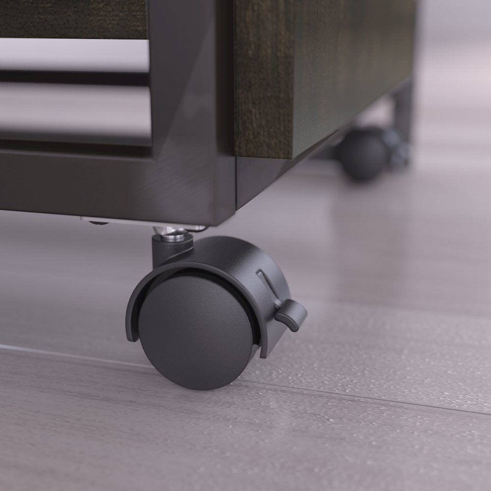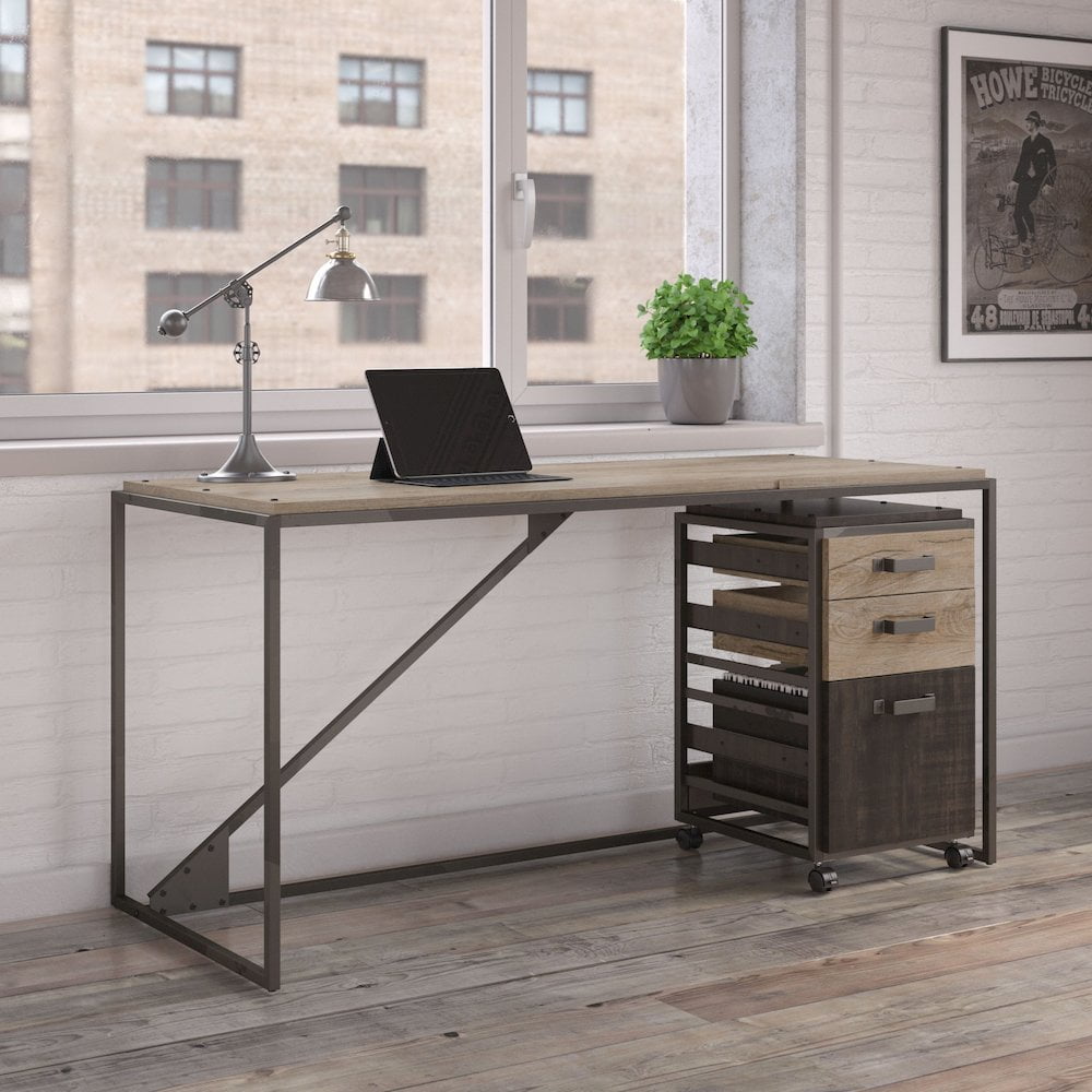 Unique reclaimed looks, industrial appeal and a sturdy space-saving design. The Bush Furniture Refinery 62″ Industrial Desk gives your home office, loft or creative space a weathered charm to match your rustic decor. The Industrial Steel frame and exposed bolts join a durable work surface finished in a distressed Rustic Gray to create a table desk you’ll love to use and admire. Spread out with your laptop, projects, crafts or a good book and a cup of coffee with room to spare. A perfect match for your Industrial Desk, the Mobile File Cabinet rolls anywhere or locks into place. A full-extension file drawer opens on smooth ball-bearing slides for easy access to contents in the back. Store pens, papers and other small office supplies in a pair of box drawers. Display your rustic tastes with the 62″ Industrial Desk with Mobile File Cabinet, backed by a Bush Furniture 1 Year Warranty. Meets ANSI/SOHO furniture standards for safety and durability. View the full line of industrial furniture to find the perfect fit for your space. Features: Finish: Rustic Gray L Desk Dimensions: 30.00″ H x 61.42″ W x 25.12″ D Material: Laminate Over Engineered Wood, Metal, Plastic Mobile File Cabinet Dimensions: 27.24″ H x 15.75″ W x 17.87″ D Bundle includes: 62″ Industrial Desk, 3 Drawer Mobile File Cabinet Durable Industrial Desk work surface offers plenty of room to spread out File drawer glides on smooth, full-extension ball-bearing slides for an easy reach to the back 2 box drawers store miscellaneous small office supplies Front casters lock for secure placement Distressed Rustic Gray finish and Charred Wood accents create an appealing weathered look Sturdy Industrial Steel frames with open sides and exposed bolts Space-saving design perfect for a home office or loft Specifications: Product Weight: 118 lbs