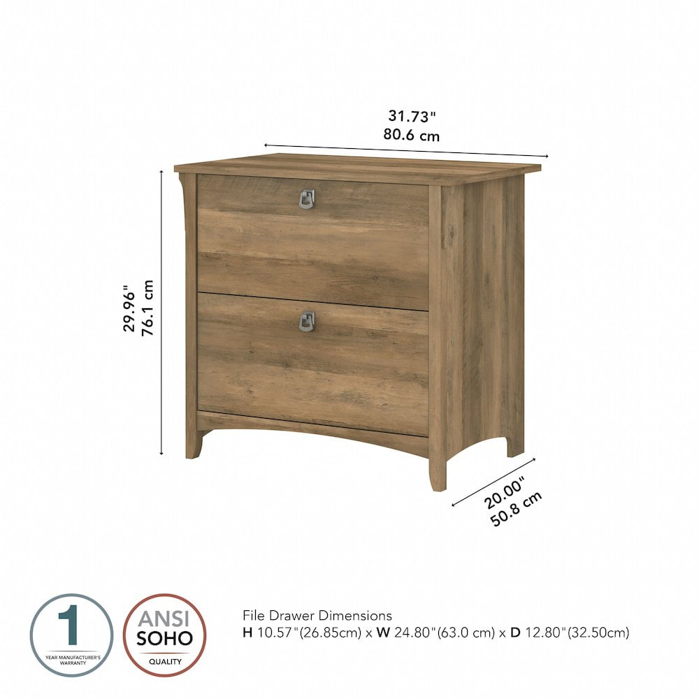 32W x 20D x 30H 2 Drawer Lateral File Cabinet accommodates letter, legal and A4-size documents File drawers open on smooth full-extension ball bearing slides for an effortless reach to contents Tapered legs, curved base rails and decorative wood accents inspired by timeless Mission styling Filing cabinet matches height of L Shaped Desk with Storage (sold separately) for an extended work surface when placed side by side Distressed finish options include a cream colored Antique White, Pure White with Shiplap Gray, Cape Cod Gray, Vintage Black, Ash Brown, Reclaimed Pine and Driftwood Gray Tested to meet ANSI/SOHO quality standards for safety and performance Backed by the Bush Furniture 1 Year Manufacturer’s Warranty Complete your workspace with a coordinating Desk, Hutch, Office Chair, Storage Cabinet and Bookcase (sold separately) Material: Engineered Wood