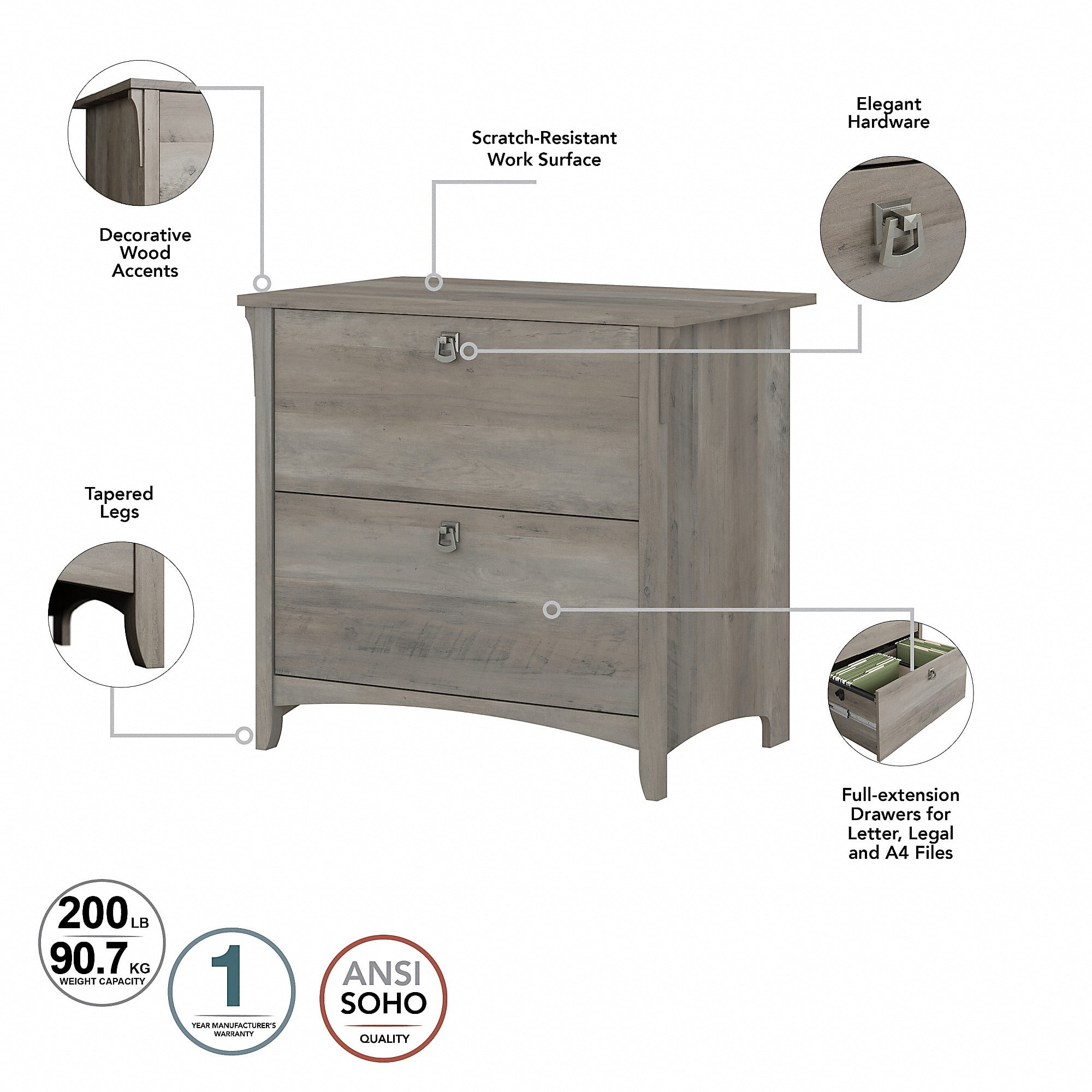 From Bush Furniture’s Salinas Collection, this 2 Drawer Lateral File Cabinet in Driftwood Gray is the perfect storage solution for any workspace. Measuring 32″W x 20″D x 30″H, our two drawer file cabinet conveniently organizes your work accessories. Set on smooth ball-bearing slides, the file cabinet drawers open effortlessly for easy access to stored paperwork and office materials. Tapered legs, curved base rails and decorative wood accents are inspired by timeless Mission style. This versatile under desk storage piece adds a stylish touch to any office. Pair work cabinet with 60”W L Shaped Desk with Storage (sold separately) to extend your work space and increase office organization. Tested and approved to meet or exceed industry standards, this modern file cabinet withstands years of use. At Bush Furniture, we’ve been serving our customers nationally for over 60 years. Our mission is to offer quality, affordable furniture with the best customer service in the business.