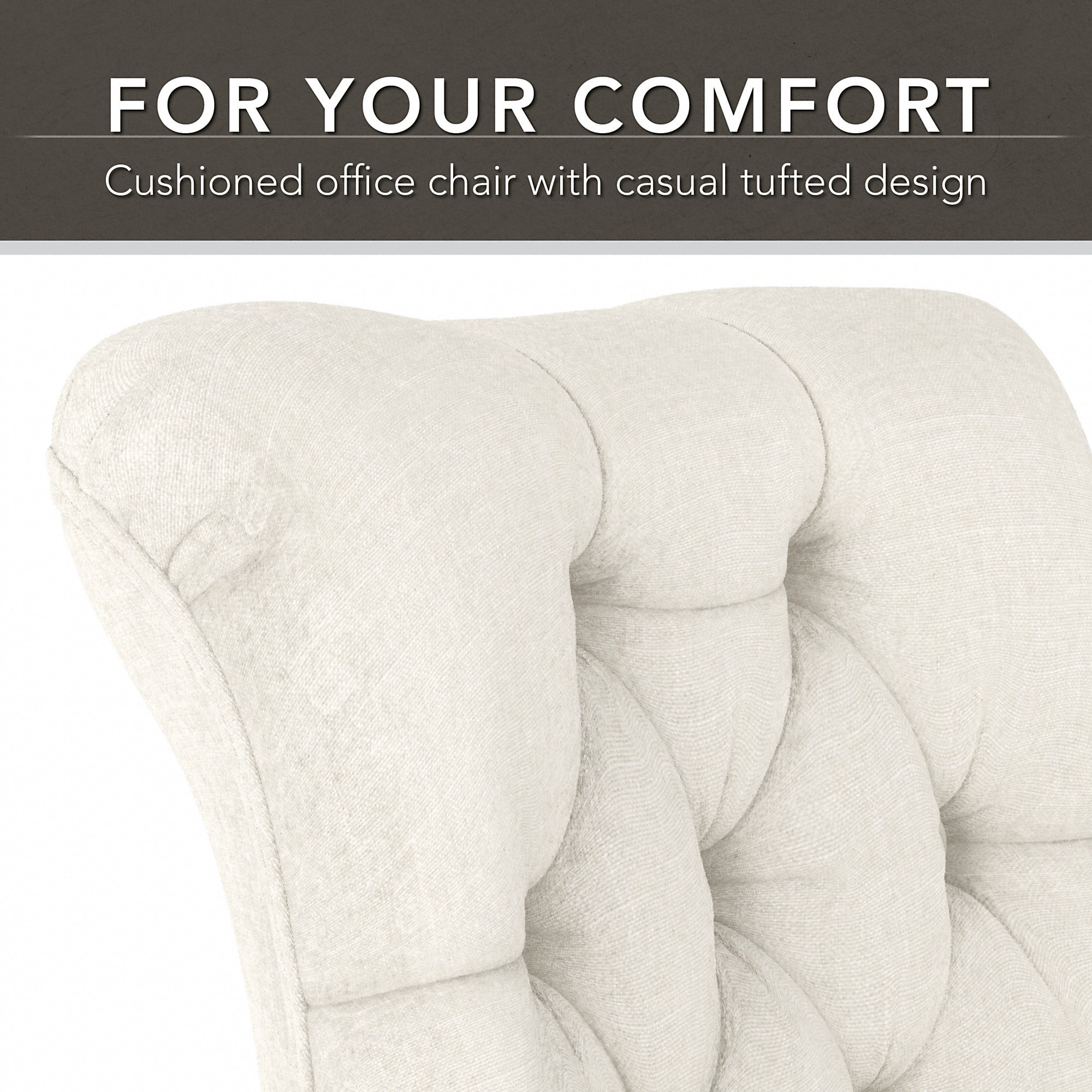 From Bush Furniture’s Salinas Collection, this Mid Back Tufted Office Chair in Cream Fabric is the perfect seating solution for any office space. With a stylish and durable design, this rolling desk chair provides top-notch comfort and functionality. Armless construction is ideal for tight spaces and glides easily under a desk or table, while the mid back design promotes good posture to reduce fatigue and improve productivity during a long workday. A convenient lever instantly adjusts the seat’s height to individual preference, while a knob underneath the seat can increase or decrease the chair’s tilt. With 5 dual-wheeled casters and 360-degree swivel control, the chair rolls freely throughout your office. Heavy-duty steel base with an Espresso Wood cover supports up to 275 pounds. At Bush Furniture, we’ve been serving our customers nationally for over 60 years. Our mission is to offer quality, affordable furniture with the best customer service in the business.