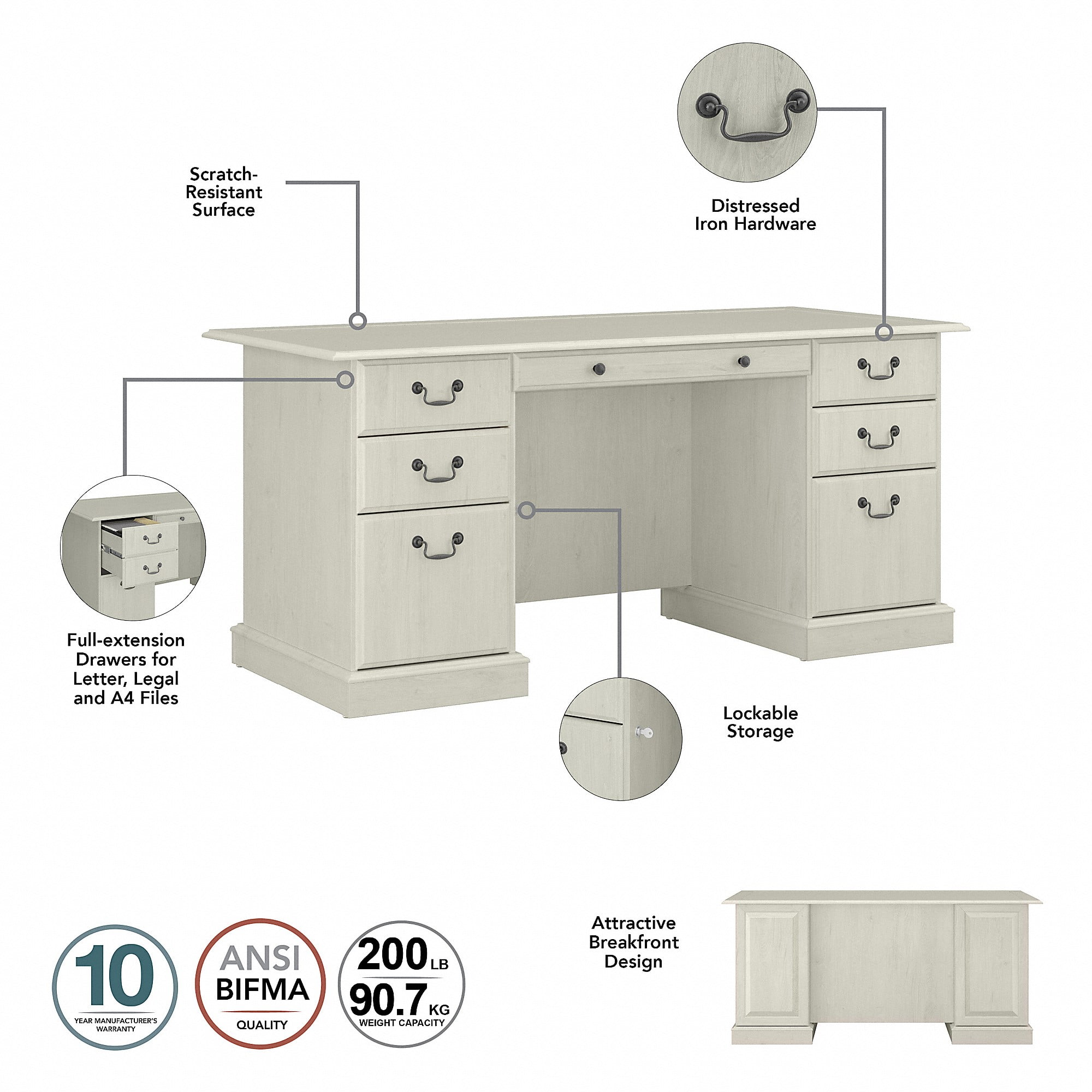66″W x 30″D x 30″H Executive Desk with Drawers presents a practical workspace solution with classic style Sturdy desk supports a computer, books and other materials with a weight capacity of 200 pounds; scratch-resistant surface protects against damage Traditional computer desk features an attractive breakfront design that looks great facing any direction Left-hand storage includes two lockable file drawers for organizing letter, legal and A4-size paperwork Right side provides an additional file drawer along with two box drawers for small office supplies Center drawer offers a perfect place to stash pens, pencils, notepads and other miscellaneous items Available in Linen White Oak or Modern Gray with Distressed Iron hardware and Harvest Cherry with Gold-finished Brass hardware Tested to meet ANSI/BIFMA quality standards for safety and performance Backed by the Bush Furniture 10 Year Manufacturer’s Warranty Complete your personal workspace with a coordinating Office Chair, Lateral File Cabinet and 5 Shelf Bookcase (sold separately)