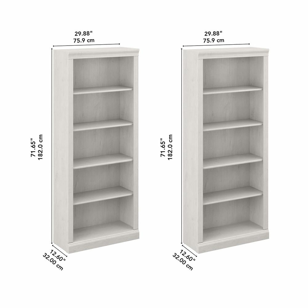 Matching 30W x 13D x 72H Tall 5 Shelf Bookcase Set presents a practical storage solution with timeless traditional style Each Bookcase has three adjustable shelves for books and decorations of various sizes; two shelves are fixed for stability Each shelf supports up to 25 pounds Position the bookshelves side by side to create a large storage wall or separately to showcase items in different areas of your home Tall bookshelf set’s decorative top, base and side rail detailing brings a classic charm to any work or living space Available in your choice of Harvest Cherry, Linen White Oak and Modern Gray finishes Tested to meet ANSI/BIFMA quality standards for safety and performance Backed by the Bush Furniture 10 Year Manufacturer’s Warranty Complete your personal workspace with a coordinating Computer Desk, Office Chair and Lateral File Cabinet (sold separately)