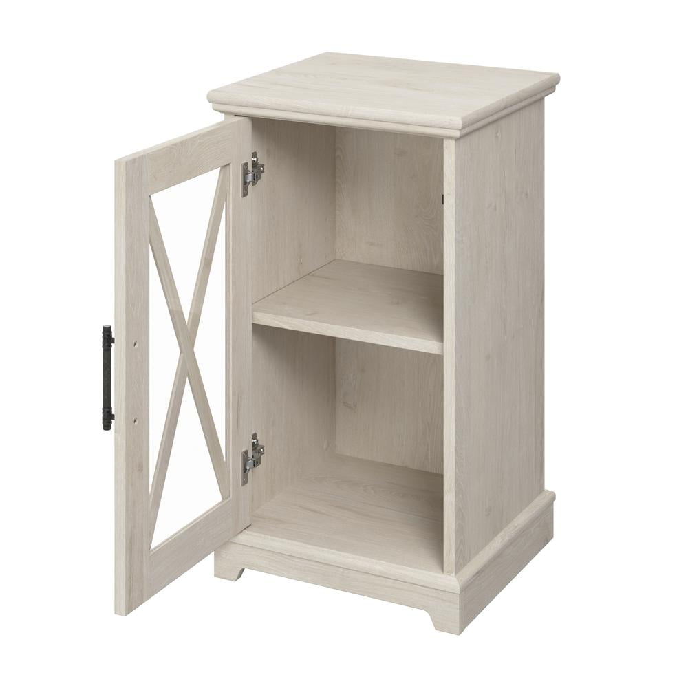 Small Farmhouse End Table with Storage in Linen White Oak The Bush Furniture Lennox Small Farmhouse End Table with Storage boasts a practical design to help keep your living room in order while conveying a natural, easy-going charm. This side table’s surface has a weight capacity of 50 pounds to support a lamp, plant, or decorations to give your space a personal touch. A cabinet with a tempered glass door and X pattern accent opens to reveal one adjustable shelf to accommodate reading materials, remote controls, and other living room essentials of various shapes and sizes. The adjustable shelf supports up to 25 pounds, so you can store books and larger materials with confidence. The small accent table is a perfect complement to the Lennox Farmhouse Coffee Table (sold separately) for a cohesive living room table set, but it also works well in a home office, entryway, or any other residential space. The Lennox Collection’s intentionally distressed finish and hardware reflect the best elements of coastal and farmhouse styling to fit perfectly in homes that embrace a more relaxed vibe. This end table for living room has been meticulously tested to meet or exceed industry standards for safety, durability, and performance and is backed by the Bush Furniture 1 Year Manufacturer’s Warranty. Build your ideal living space with coordinating items from the Lennox Collection, including home office desks, file and storage cabinets, bookcases, TV stands, and more. Small End Table with Storage is an ideal way to keep everyday essentials organized and accessible Side table’s durable surface supports a lamp, plant, or decorations with a weight capacity of 50 pounds Storage cabinet with tempered glass door and X pattern accent contains one adjustable shelf for items of various sizes Adjustable shelf supports up to 25 pounds, so you can store reading materials and larger items with confidence Small table’s distressed finish and hardware reflect the best elements of coastal and farmhouse styling Coordinates with Lennox Farmhouse Glass Coffee Table (sold separately) for a cohesive living room furniture set Side table with storage’s stylish and practical design works well in a living room, entryway, or any other residential space Bush Furniture’s commitment to safety includes rigorous testing that meets or exceeds industry standards Farmhouse End Table is backed by a 1 Year Manufacturer’s Warranty Coordinating items in the Lennox Collection include home office desks, bookcases, storage cabinets, living room tables, and more – Finish: Linen White Oak – Collection: Lennox – Item Depth: 15.67 – Item Height: 30 – Item Width: 17.17 – Item Weight: 44.65 – Item Color: White – Item Material: Glass, Laminate Over Engineered Wood (Paper), Steel, Metal, Plastic – Dimensions (in.): 17.17”W x 15.67”D x 30”H