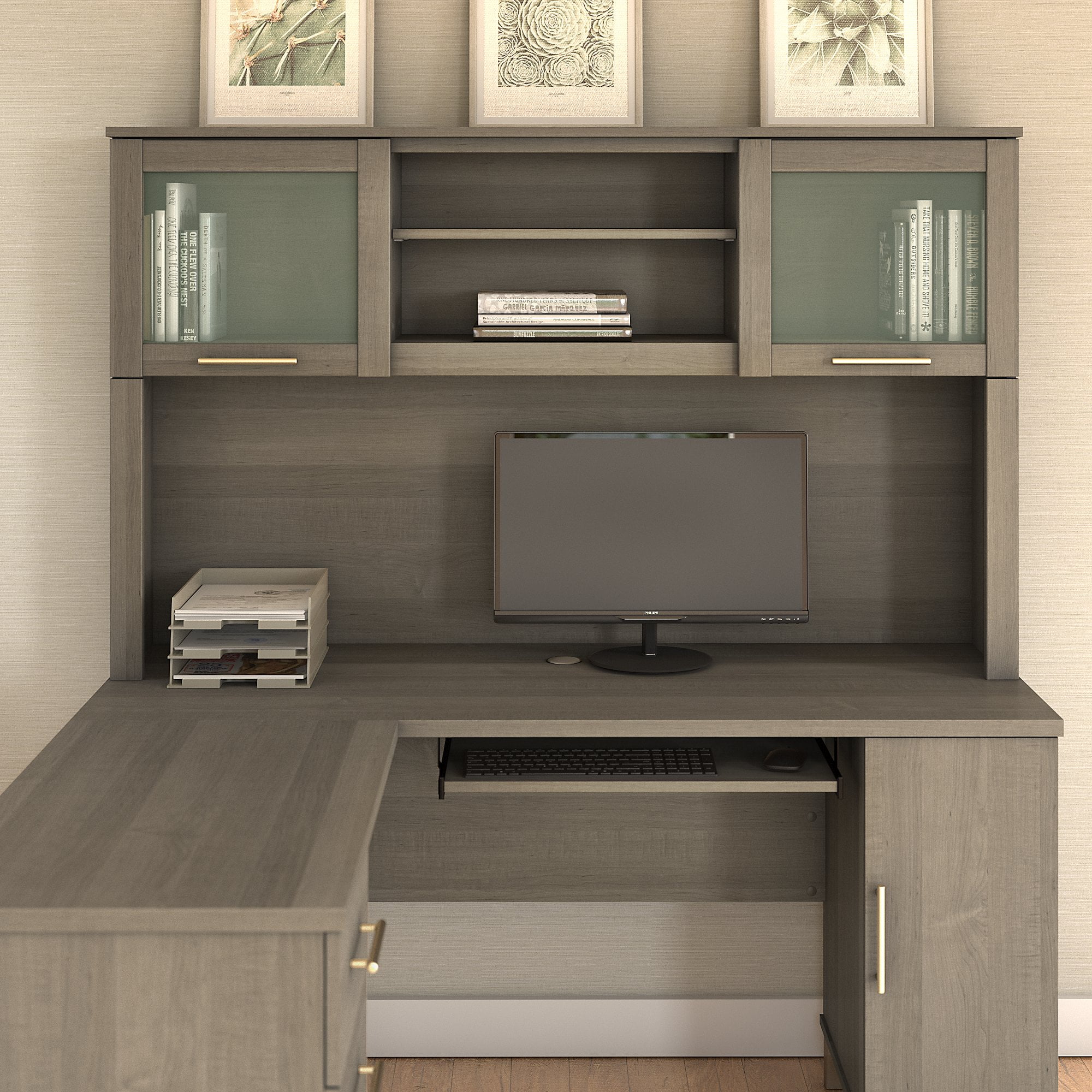 HUTCH CABINET WITH SHELVES: Elevate any workspace with the Bush Furniture Somerset 2-Door Hutch for L Desk (sold separately). This hutch with shelves measures 60″W x 12″D x 36″H PAIR WITH OFFICE DESK: Attach the hutch on the Somerset 60”W L Shaped Desk (sold separately). Hutch mounts to either side of the L Shaped Computer Desk CONVENIENT STORAGE SPACE: A large compartment with an adjustable shelf and 2 concealed cabinets with stylish fluted glass doors provide plenty of room to organize your study and work materials SLEEK AND STYLISH DESIGN: Choose from a wide variety of contemporary and traditional finish options to complement any office, bedroom, dorm or workspace VERSATILE USE: Organize books, binders and work supplies, or use the hutch as a display case for your family photos, artwork or other decor items COMPLETE YOUR HOME OFFICE: Explore coordinating Somerset pieces. Attractive Ash Gray finish complements your choice of Somerset Desk and Storage finishes DEPENDABLE PERFORMANCE: Bush Furniture’s commitment to safety includes rigorous testing that meets or exceeds industry standards. Our office hutch is backed by a 6-Year Manufacturer’s Warranty SOMERSET COLLECTION: Transitional styling and contemporary metal hardware provide an ideal solution for the home or small office. Shop our complete collection for a cohesive look