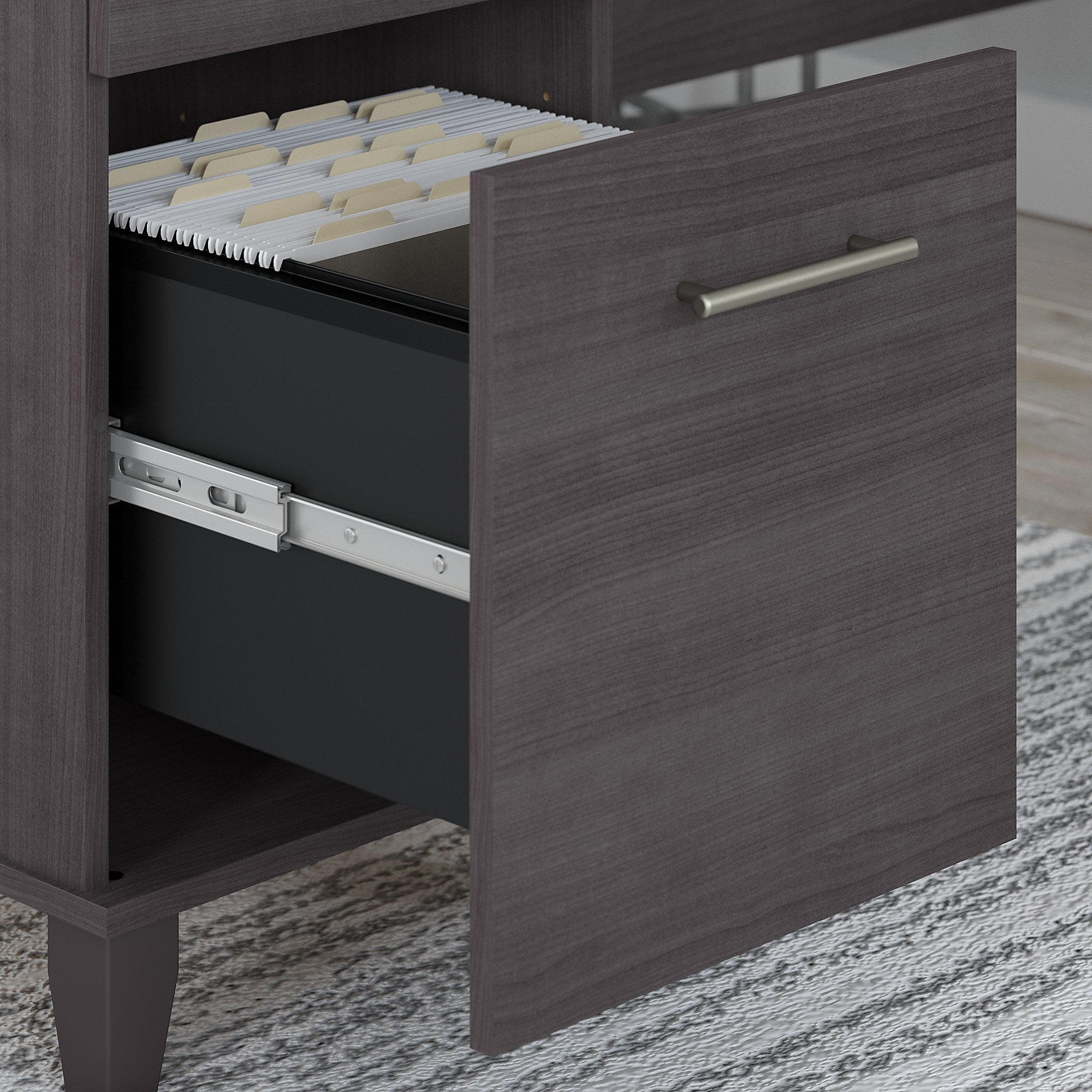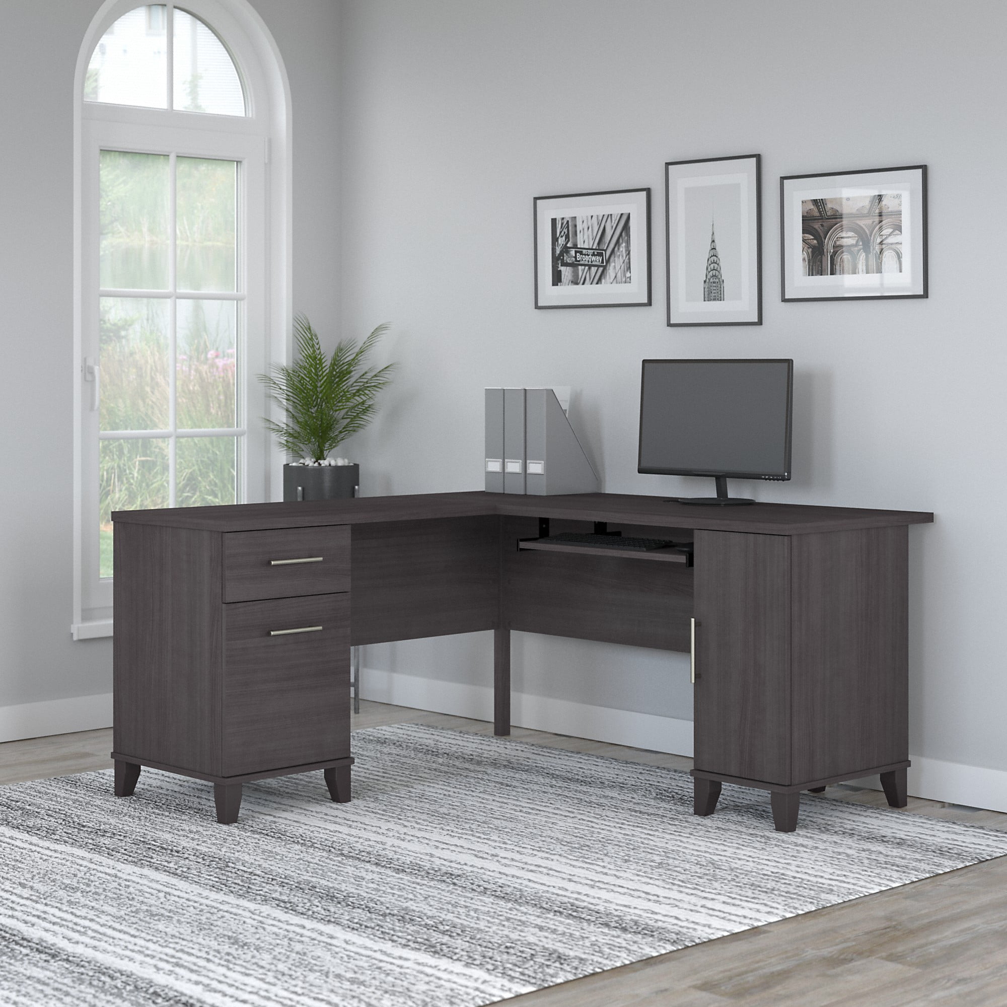 OFFICE DESK WITH STORAGE: Elevate any office or workspace with the Bush Furniture Somerset 60″W L Shaped Desk with Storage. Desktop surface supports up to 200 pounds PLENTY OF STORAGE SPACE: File drawer, box drawer and storage cabinet provide plenty of room to organize your study and work materials. File drawer opens on smooth ball-bearing slides PAIR WITH COORDINATING HUTCH: Add the 60”W Somerset Hutch (sold separately) to L Shaped Desk to create a complete home office furniture set SPACE-SAVING CONVENIENCE: L shaped desk provides ample work room and can be placed in a corner to save space. Pullout keyboard or laptop tray can mount to either side of the desk SLEEK AND STYLISH DESIGN: Choose from a wide variety of contemporary and traditional finish options to complement any office, bedroom, dorm or workspace COMPLETE YOUR HOME OFFICE: Explore coordinating Somerset pieces. Attractive Storm Gray finish complements your choice of Somerset furniture finishes DEPENDABLE PERFORMANCE: Bush Furniture’s commitment to safety includes rigorous testing that meets or exceeds industry standards. Our corner desk is backed by a 6-Year Manufacturer’s Warranty SOMERSET COLLECTION: Transitional styling and contemporary metal hardware provide an ideal solution for the home or small office. Shop our complete collection for a cohesive look