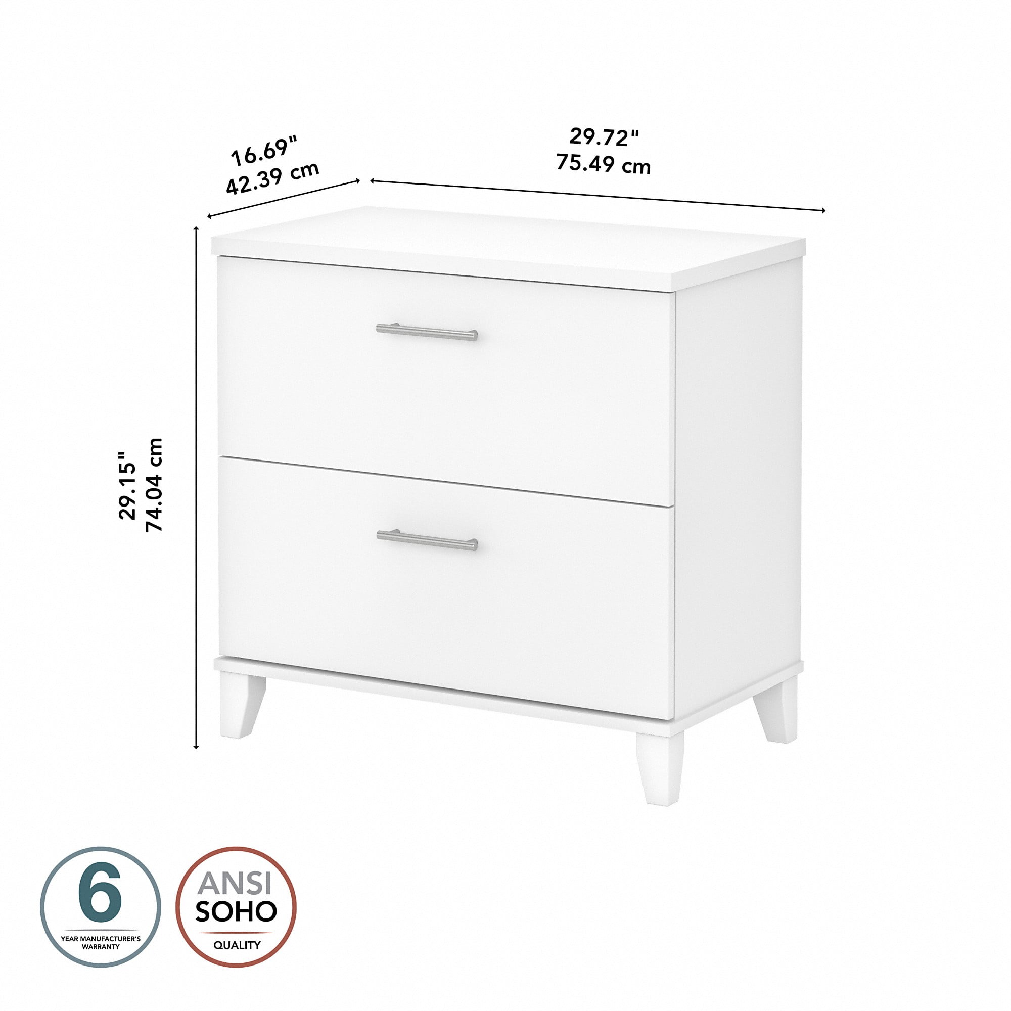 2 DRAWER FILE CABINET: Elevate any office or workspace with the Bush Furniture Somerset 2 Drawer Lateral File Cabinet. Filing cabinet measures 30″W x 17″D x 29″H PLENTY OF STORAGE SPACE: Organize files, office supplies, legal documents and other paperwork with our office cabinet with drawers. File drawers accommodate letter and legal-size files SMOOTH BALL-BEARING SLIDES: The file cabinet drawers open smoothly on ball-bearing slides, allowing easy access to paper, office materials and other stored items. Open Safe drawers are designed to extend one at a time for maximum stability PAIR WITH SOMERSET DESK: Our lateral filing cabinet can be used alongside any Somerset Desk (sold separately) to create an extended work surface when placed side by side ELEGANT AND TIMELESS DESIGN: Stylish metal hardware and your choice of contemporary and traditional finishes pair nicely with any workspace COMPLETE YOUR HOME OFFICE: Explore coordinating Somerset pieces. Attractive White color complements your choice of matching finishes DEPENDABLE PERFORMANCE: Bush Furniture’s commitment to safety includes rigorous testing that meets or exceeds industry standards. Our 2 drawer file cabinet is backed by a 6-Year Manufacturer’s Warranty SOMERSET COLLECTION: Transitional styling and tapered leg accents provide an ideal solution for the home or small office. Shop our complete collection for a cohesive look