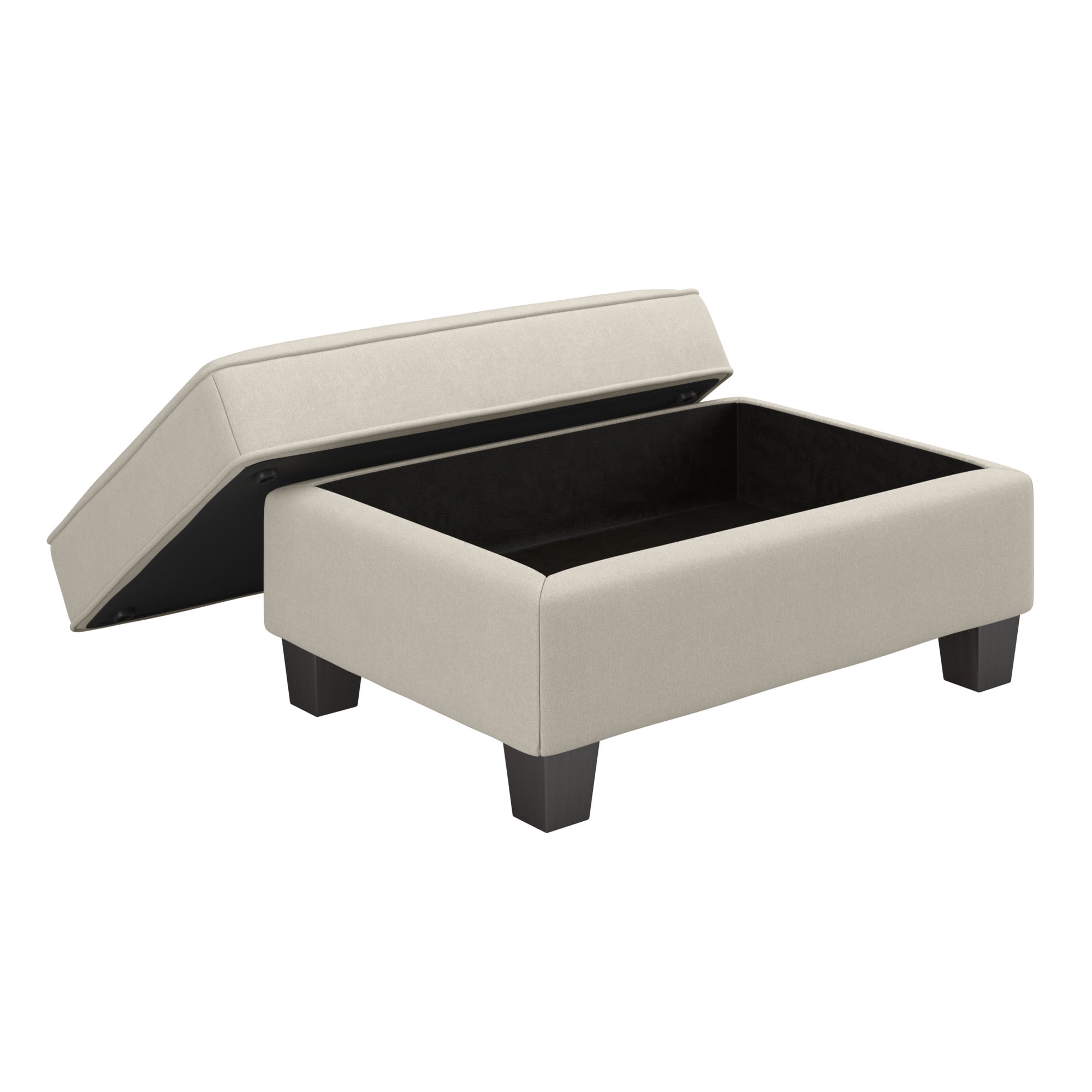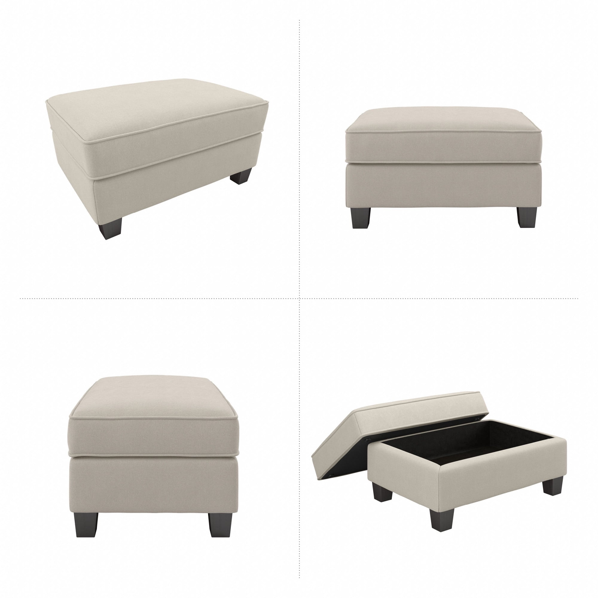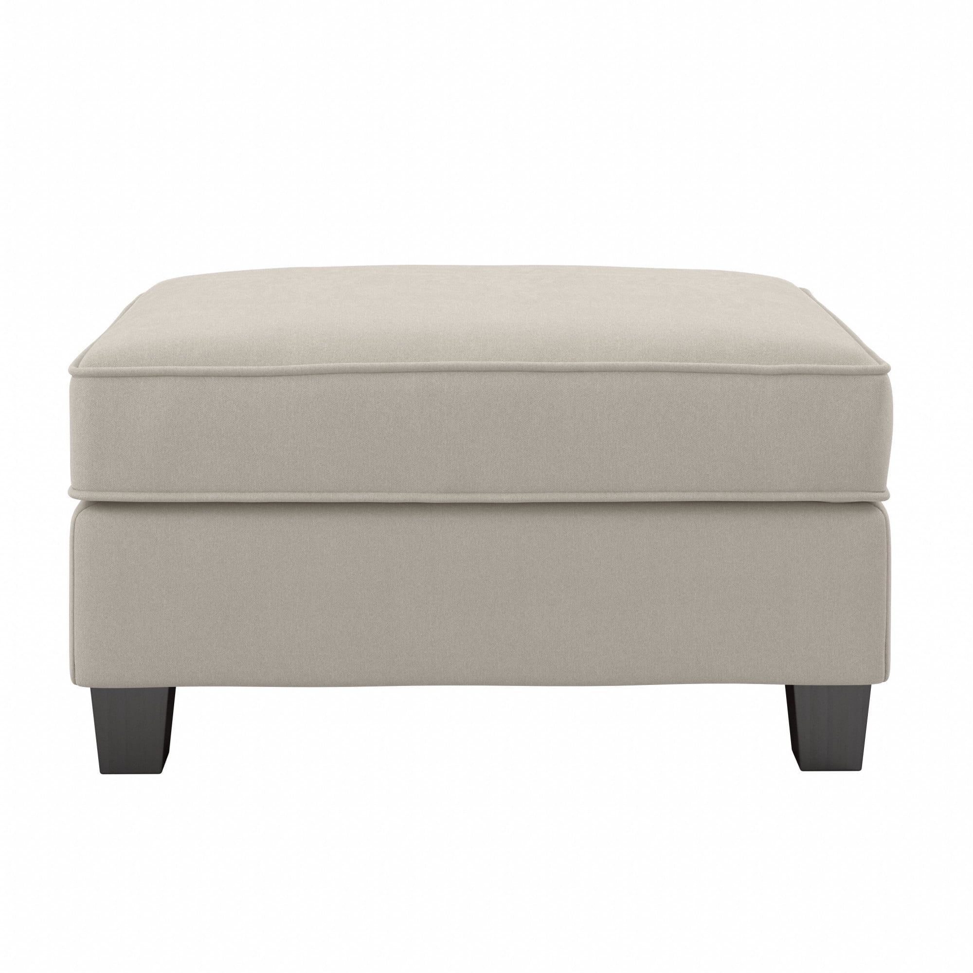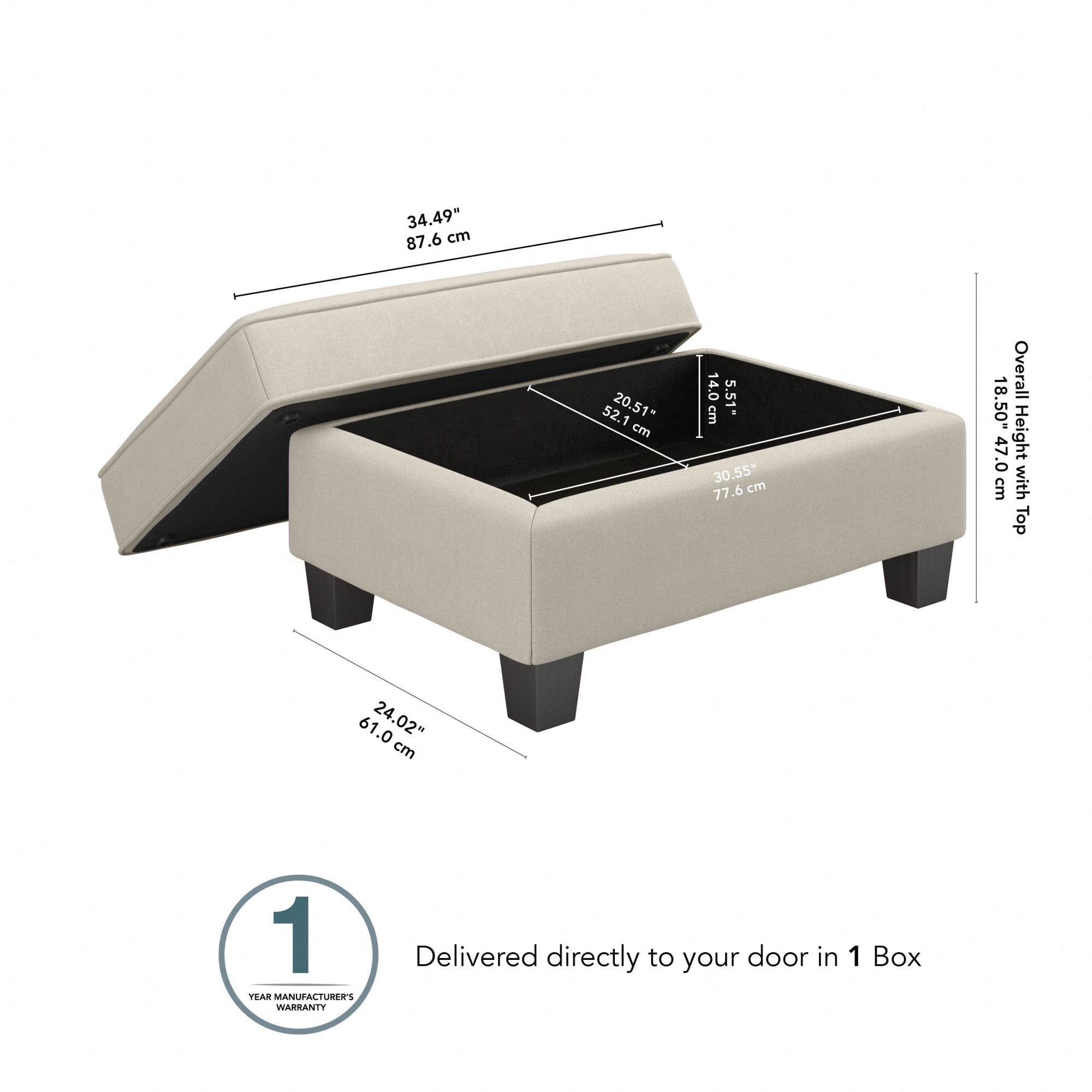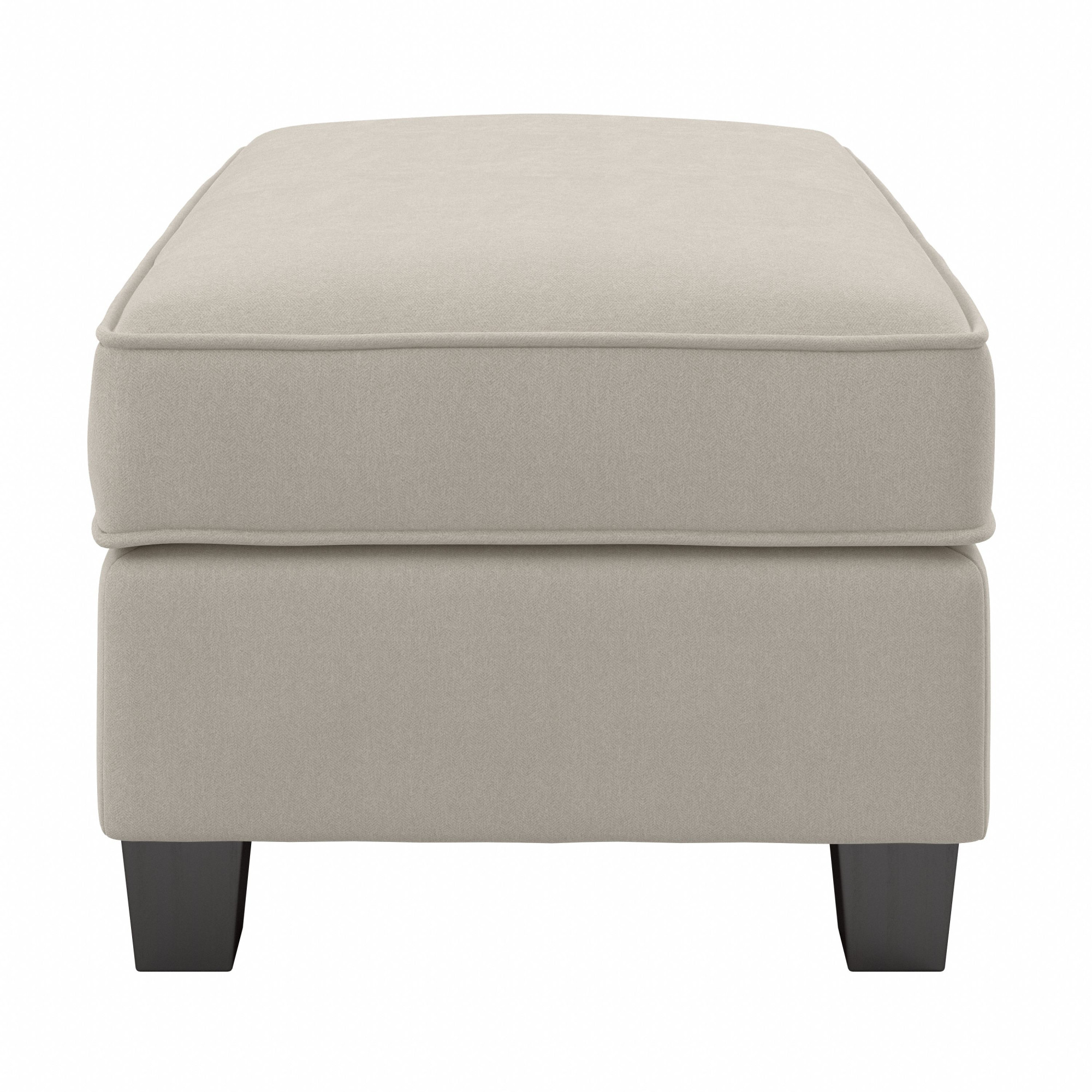 Easy-to-assemble 34.5W x 24D x 18.5H Storage Ottoman ships right to your doorstep for a convenient living room furniture solution Upholstered Ottoman’s thick cushioning provides a comfortable surface to kick your feet up and relax 30.5W x 20.5D x 6H internal storage compartment organizes blankets, reading materials and other miscellaneous items Rectangular Ottoman’s Espresso-stained tapered square feet have felt padding to avoid scratching non-carpeted surfaces Coordinates with Stockton Sofas, Sectionals and Accent Chairs for a complete living room set Meticulously tested to withstand damage and maintain fabric color throughout years of use Meets ANSI/BIFMA standards for safety and performance; backed by the Bush Furniture 1 Year Manufacturer’s Warranty