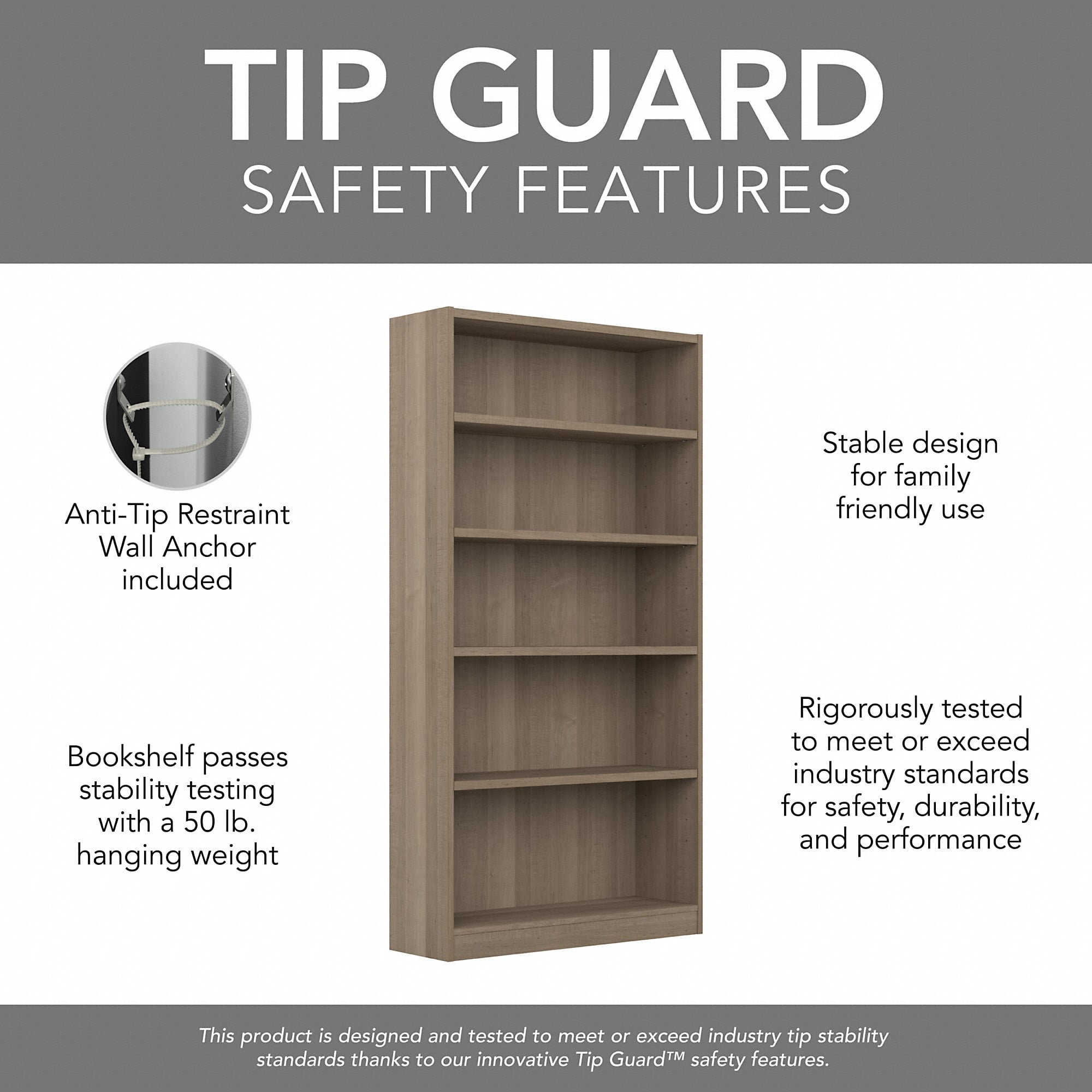 Features: 37W x 12D x 72H Tall Bookshelf offers a versatile storage and display solution for the home or office Durable 1-inch thick shelves resist sagging over time; each shelf supports up to 50 pounds Large Bookcase features three adjustable shelves for flexible organization and two fixed shelves for stability Tip Guard(TM) safety features include a stable design and wall attachment hardware Tested with a 50 pound hanging weight to create a safe environment in any work or living space Smooth side panels allow you to seamlessly place 2 or more bookshelves side by side for added home or office storage Choose from a variety of finish options to find the perfect 5 Tier Bookshelf to match your current decor Bush Furniture’s commitment to safety includes rigorous testing that meets or exceeds ANSI/BIFMA standards Backed by the Bush Furniture 1 Year Manufacturer’s Warranty with . and imported parts