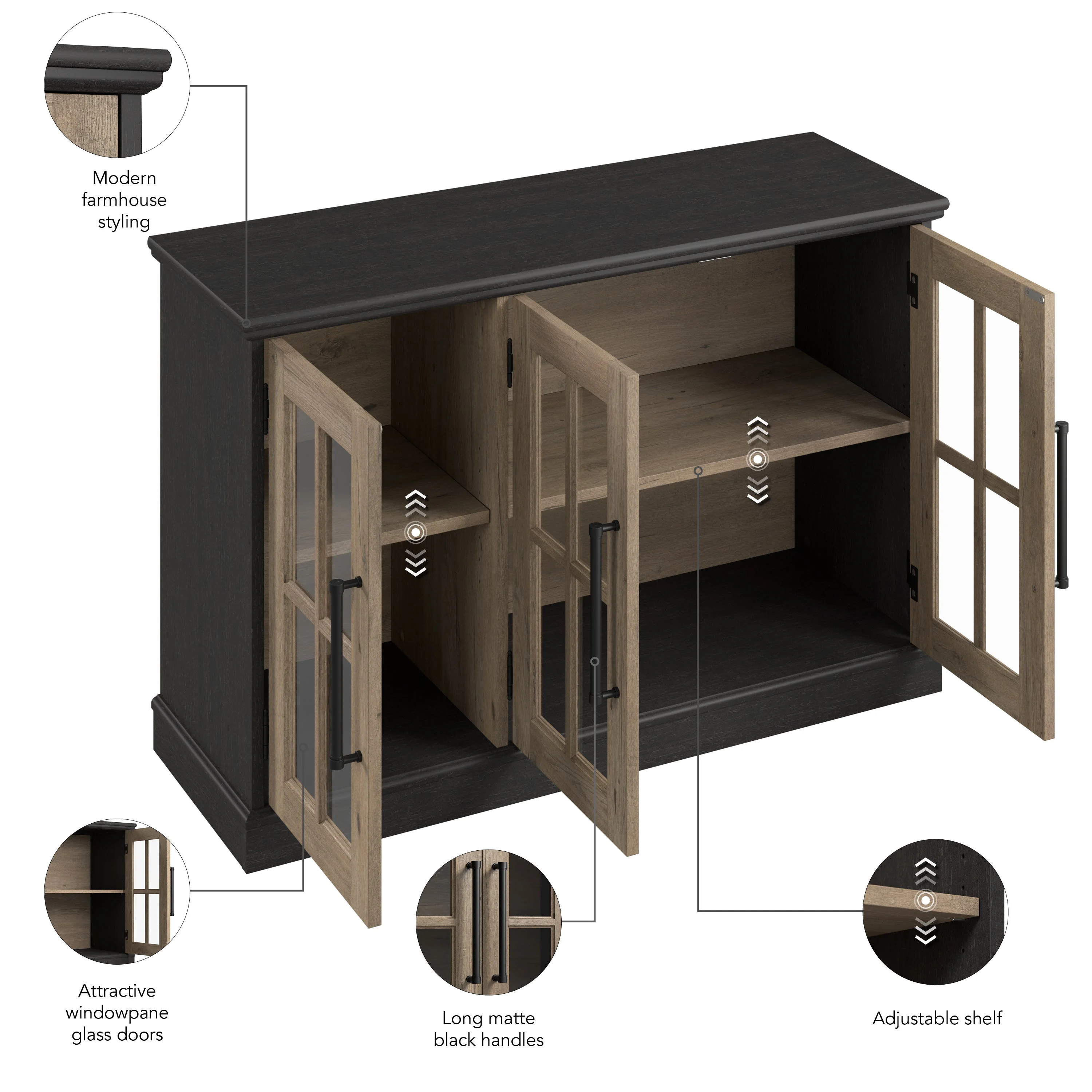Bush Furniture Westbrook Adjustable Shelf Vintage Sideboard, Wood Composite Black This 46W storage cabinet with glass doors is ideal for organizing your dining area, home office, or living space Features windowpane glass doors that provide a stylish view of the contents while keeping them safely tucked away Equipped with adjustable shelves on each side, allowing for customizable storage options Each adjustable shelf has a weight capacity of 50 pounds, perfect for showcasing dinnerware and other valuable items Long matte black handles and exposed barrel hinges enhance the modern farmhouse aesthetic