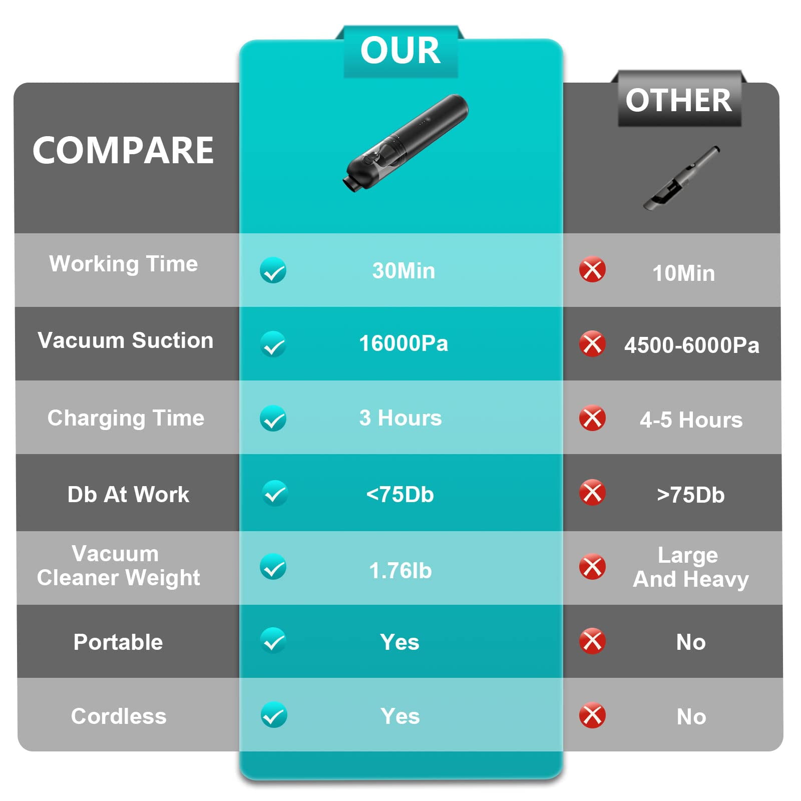 Powerful Suction 16,000Pa Busybudy Cordless Handheld Vacuum Cleaner is equipped with high-speed brushless motor that provides max 16KPA suction to conquer all messes around you. Two adjustable suction modes can meet with almost all of your cleaning needs. One-Touch Empty Design Unique design of the handheld vacuum helps you dump dust easier, just need to slide the button down.Transparent design makes the dust collecting process visible and reminds you of cleaning in time. Long Lasting & Portable Built-in 4 packs of long-lasting battery can provide max 30 min of continuous cleaning power after 3-4 hours full charging.Coming with a 1m long USB-C charging cable you can charge it anywhere in your car or home and you can take it to anywhere with the bonus storage bag. Sleek & Compact The mini hand vacuum is designed with sleek aluminum shell that provides strong and durable body structure. Only 1.32 lbs light weight with compact structure, it can be hold by one hand to clean dust easily and efficiently. Triple Filtration This car vacuum adopts triple filters including metal filter, HEAP filter and sponge filter, which can filter 99.99% of dust and protect the motor from the damage of small particulars. All of the filters can be washable and reusable.