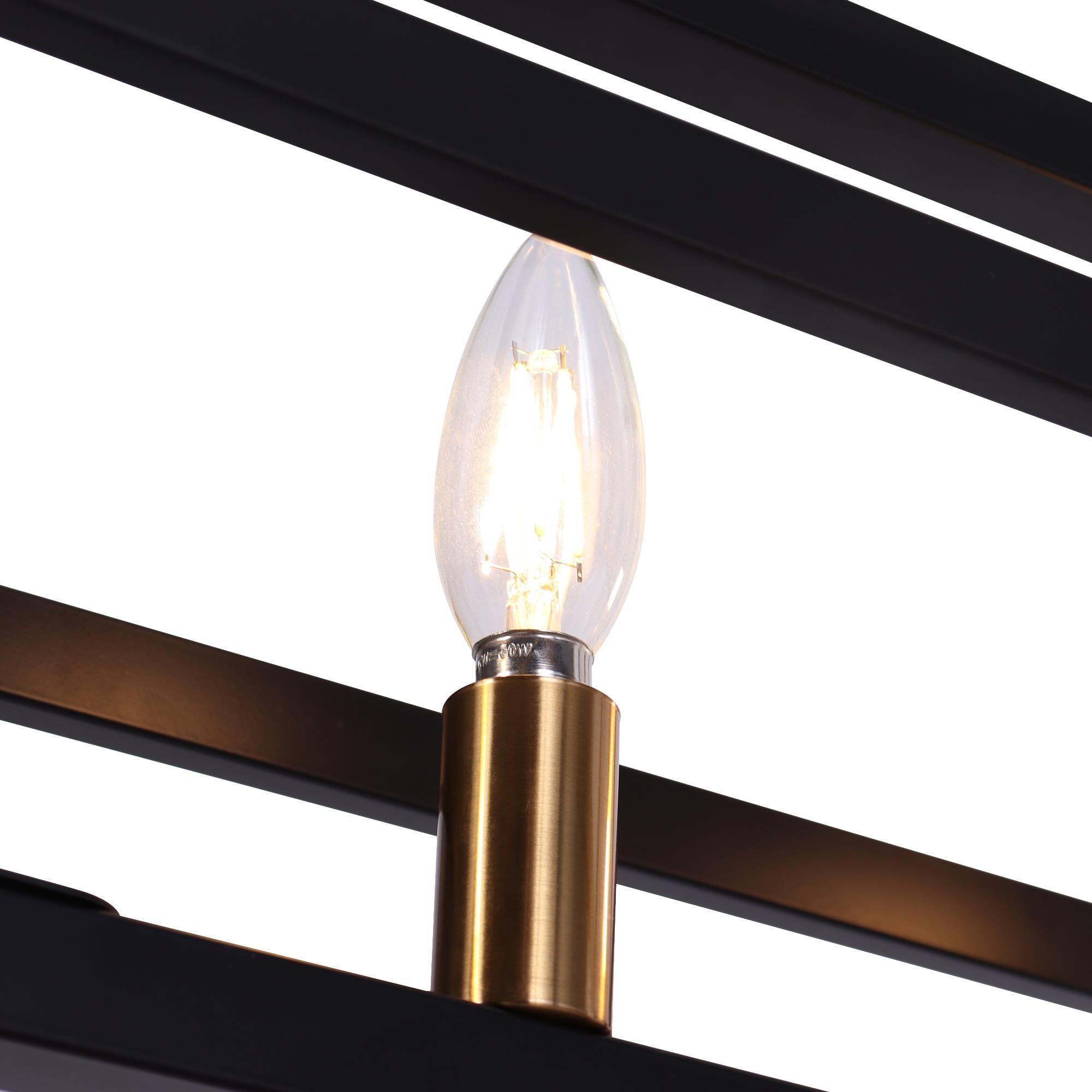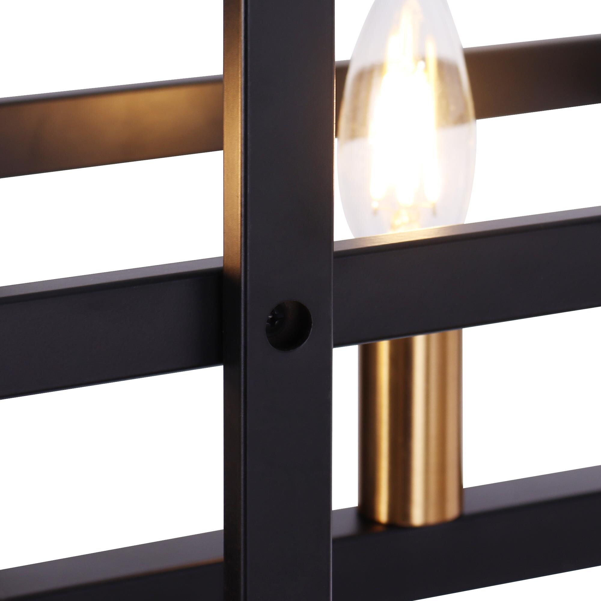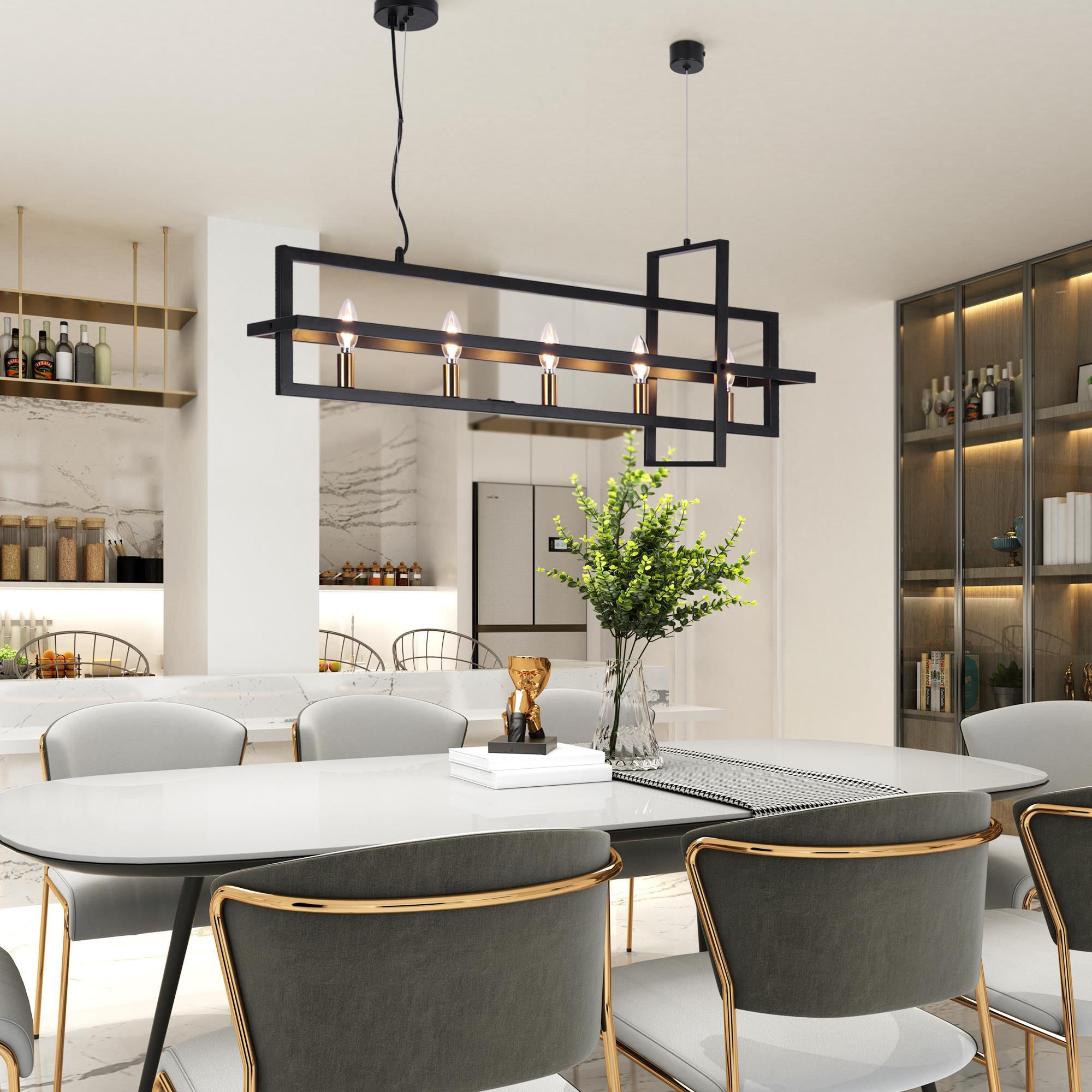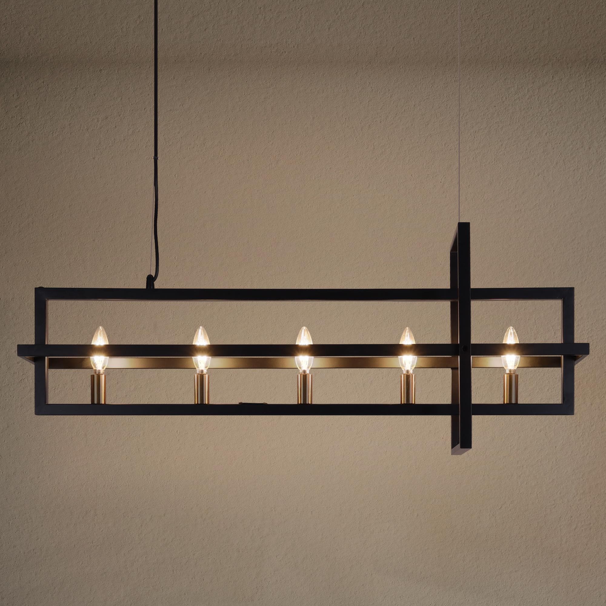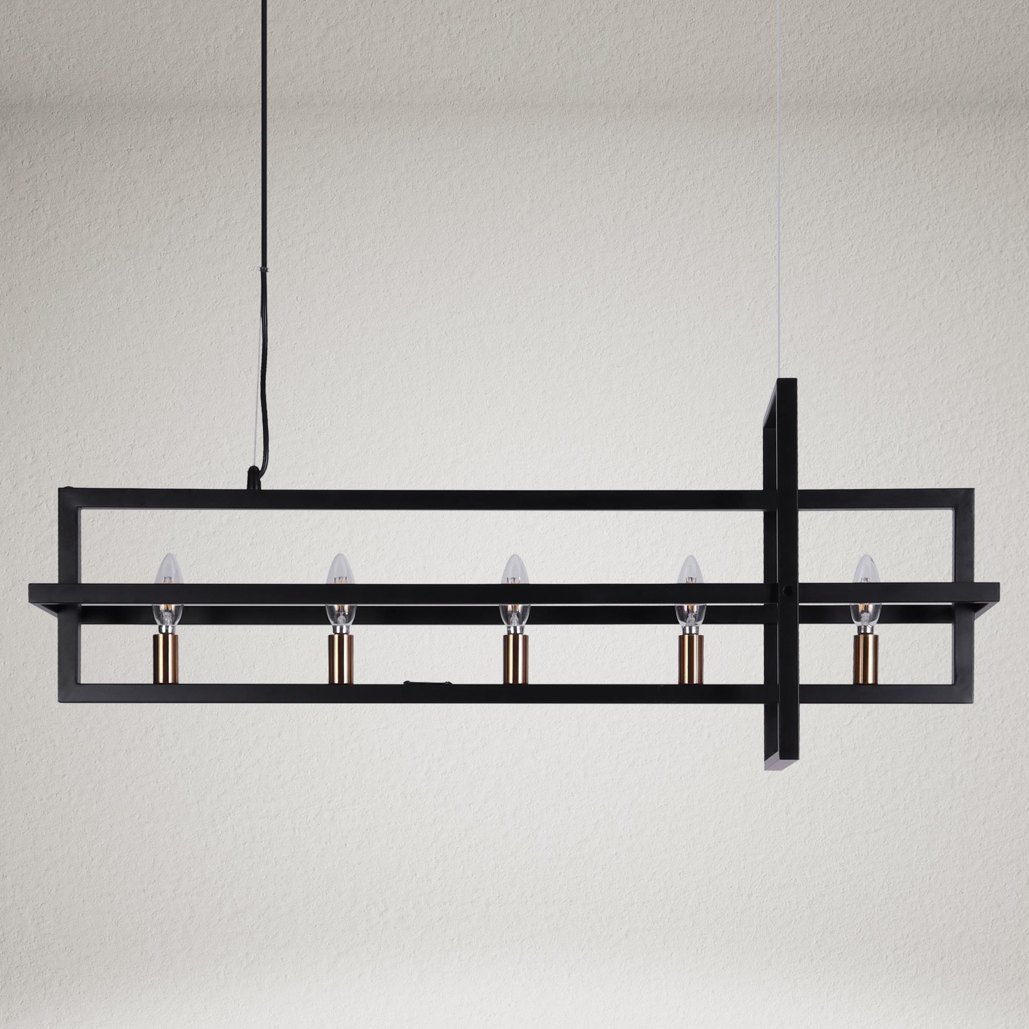 This hanging light seamlessly harmonizes playful sophistication and artistic elegance within your space. Crafted with meticulous precision, it showcases interlocking rectangles meticulously shaped from wrought-iron bands, resulting in a brilliantly designed light fixture. Equipped with five lights and a frame that skillfully creates a sense of perspective, this chandelier features a stylish black and gold finish that perfectly complements its design. The adjustable wires offer versatility, allowing you to tailor the height to your liking by manipulating the ring’s suspension with cable locking pins, ensuring a flawless match with your ceiling’s height.